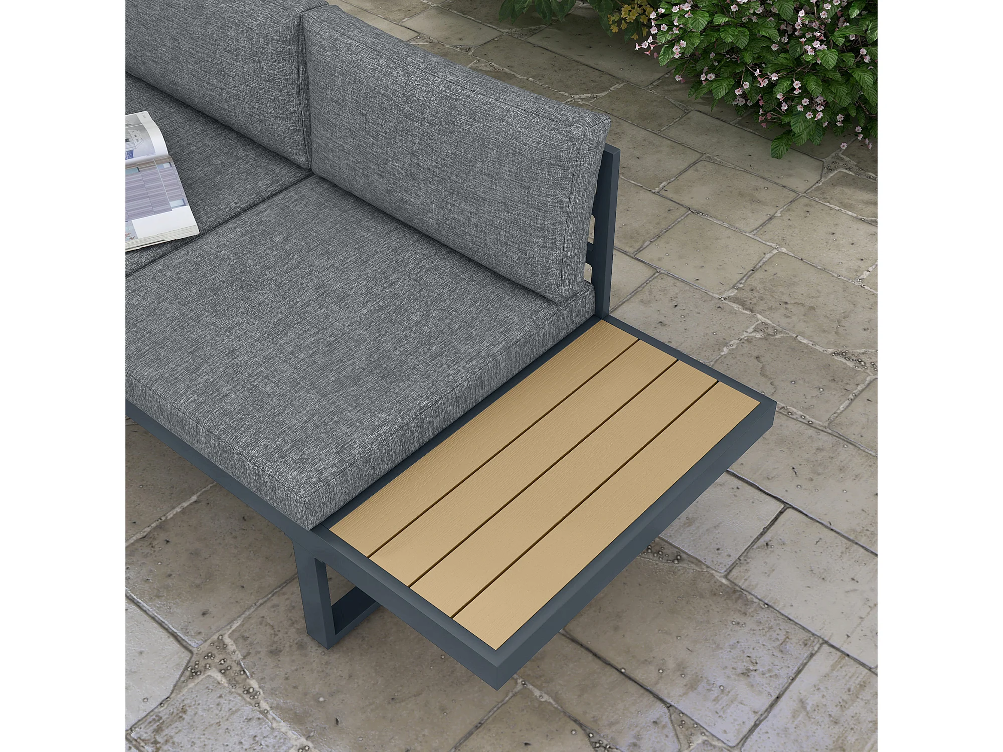 Salon de jardin d'angle 5 places avec table basse coussins alu gris aspect bois