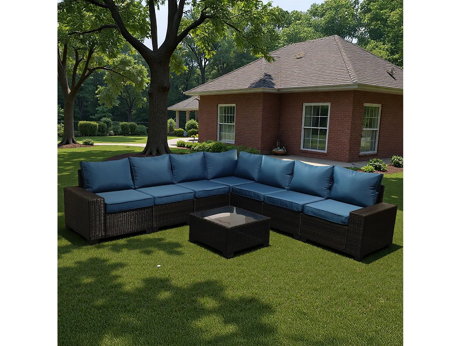 Salon de jardin d'angle 7 places en résine tressée avec table gris et bleu LAZARO