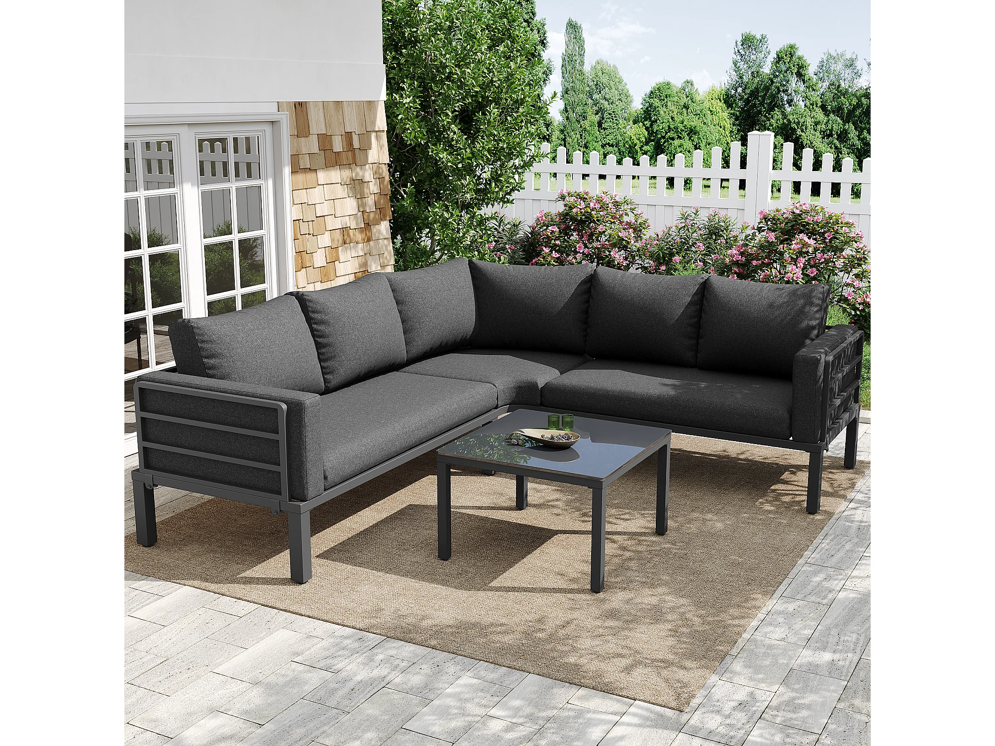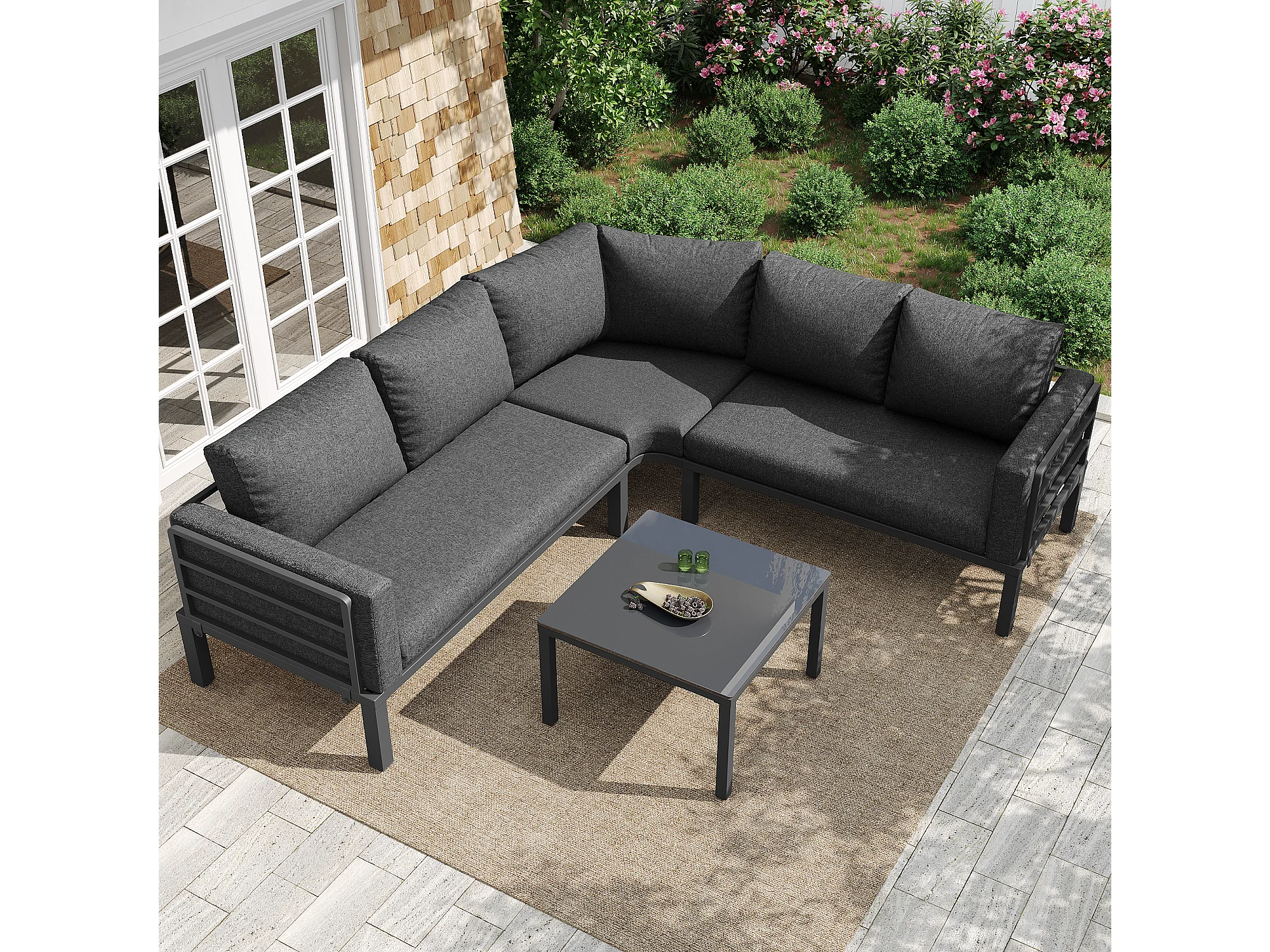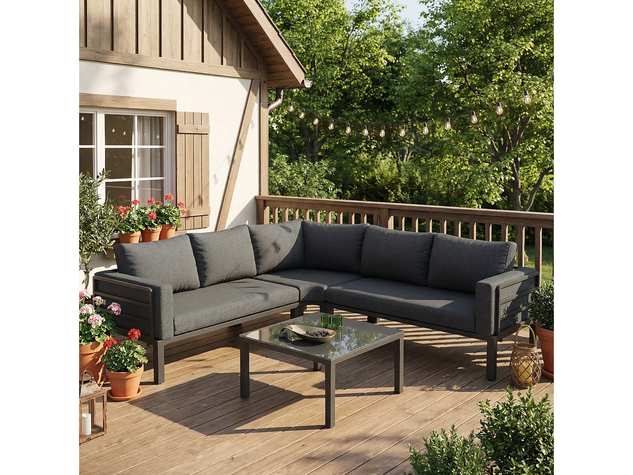 Salon de jardin d'angle en fer galvanisé : 1 canapé 5 places + table basse en verre trempé - Gris