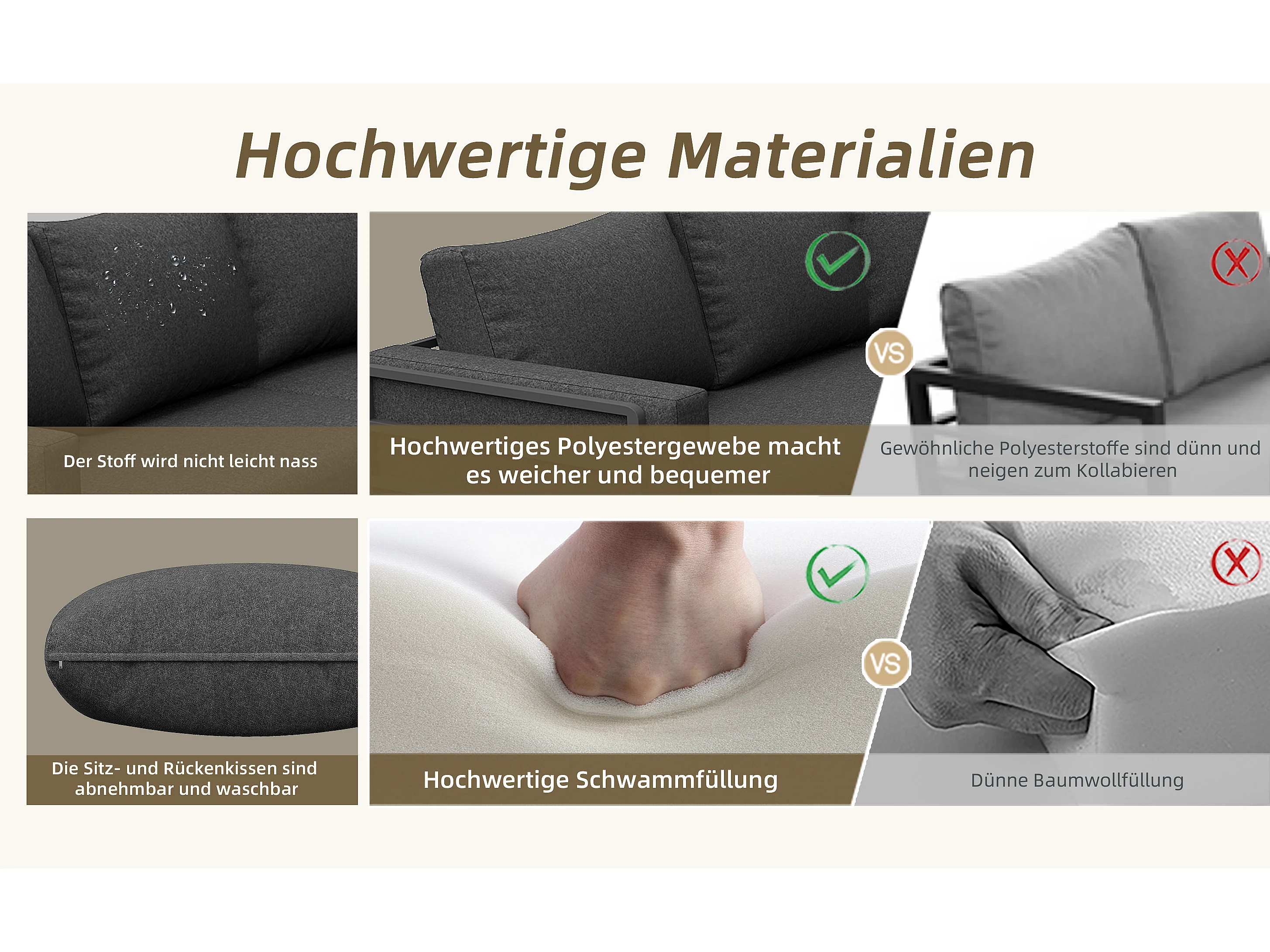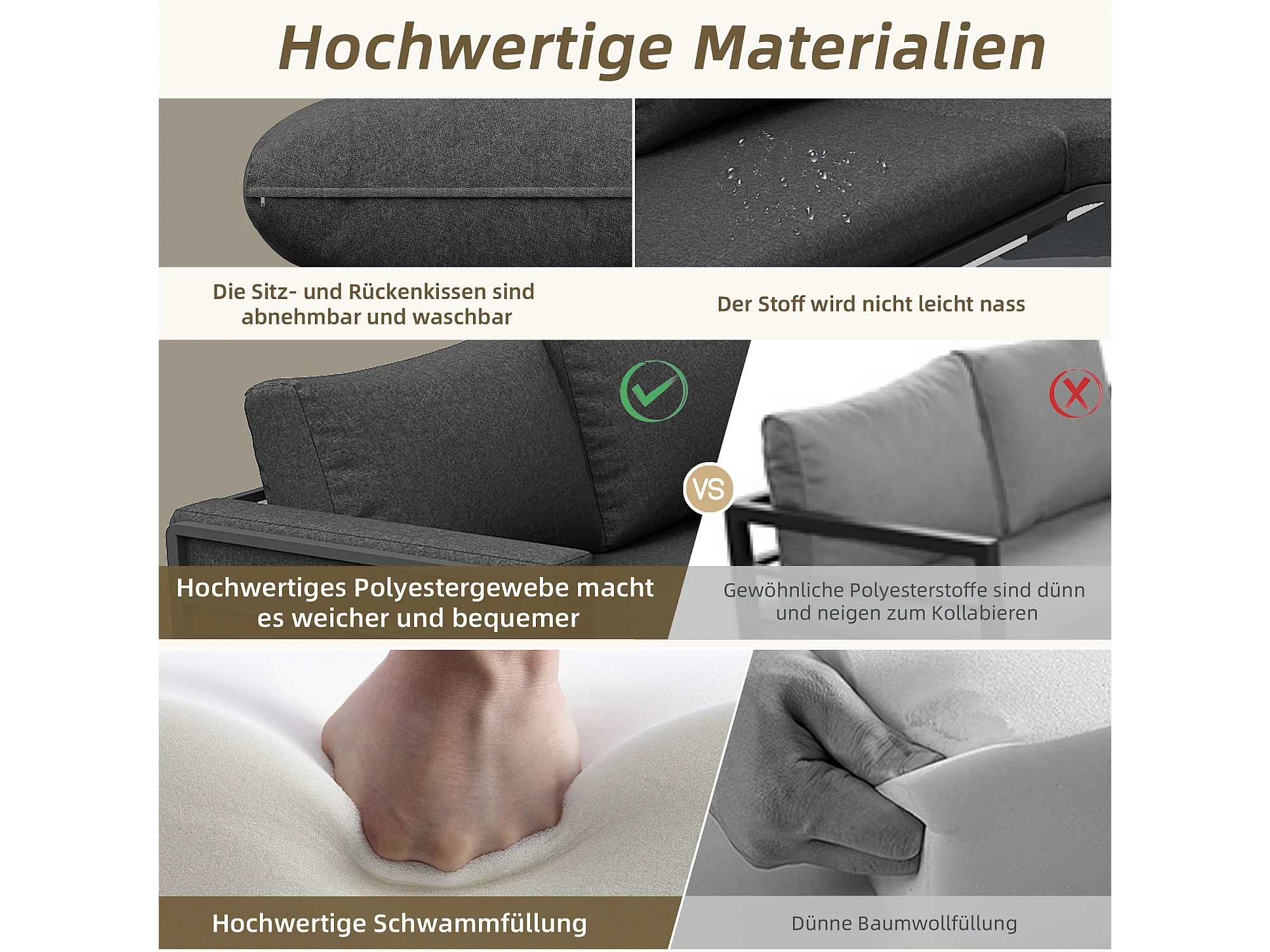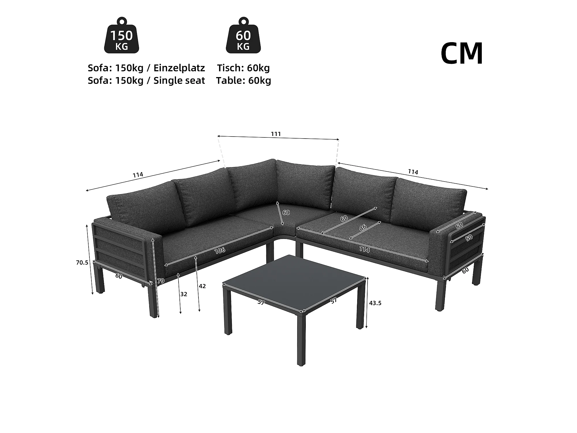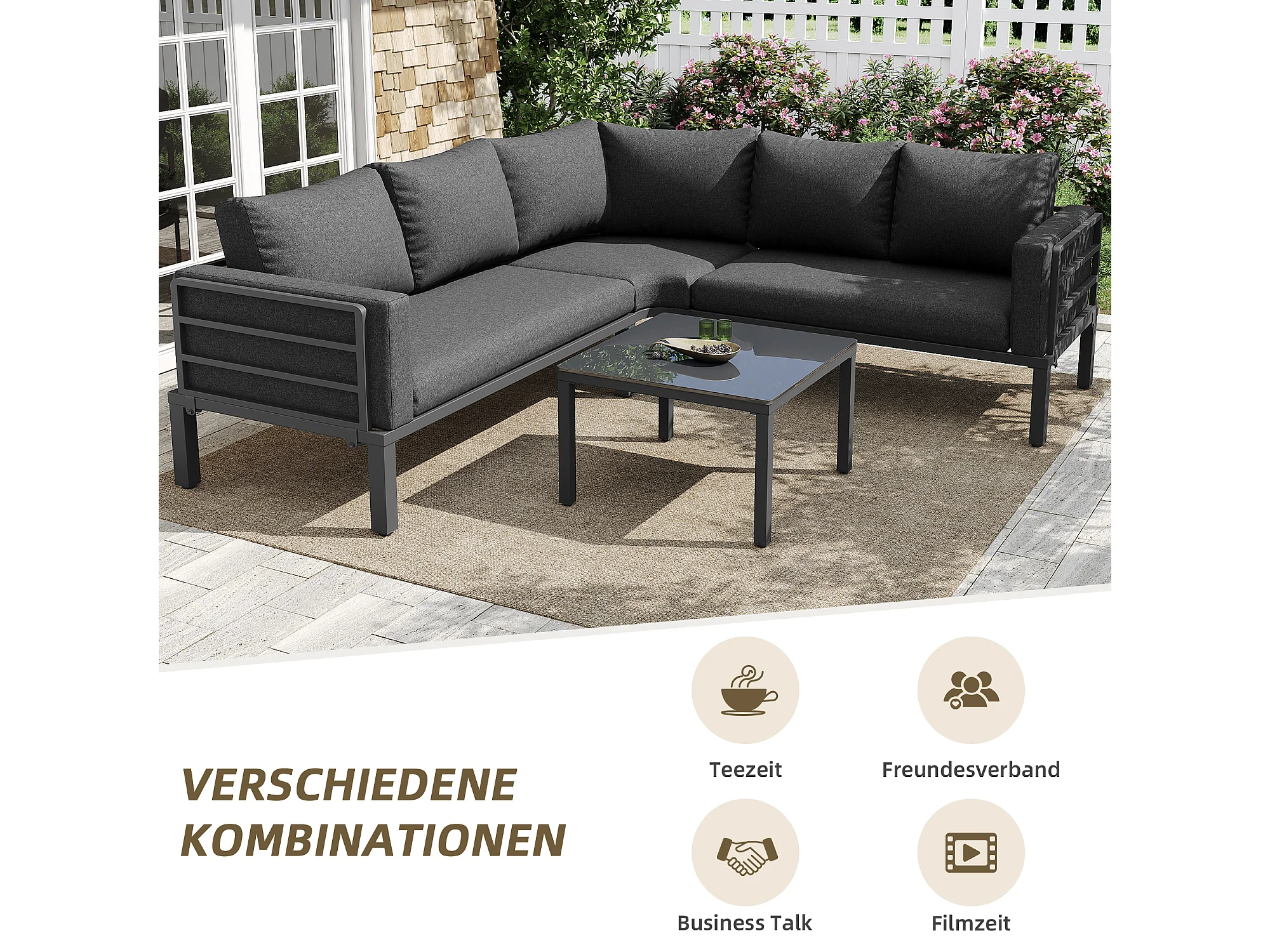 Salon de jardin d'angle en fer galvanisé : 1 canapé 5 places + table basse en verre trempé - Gris