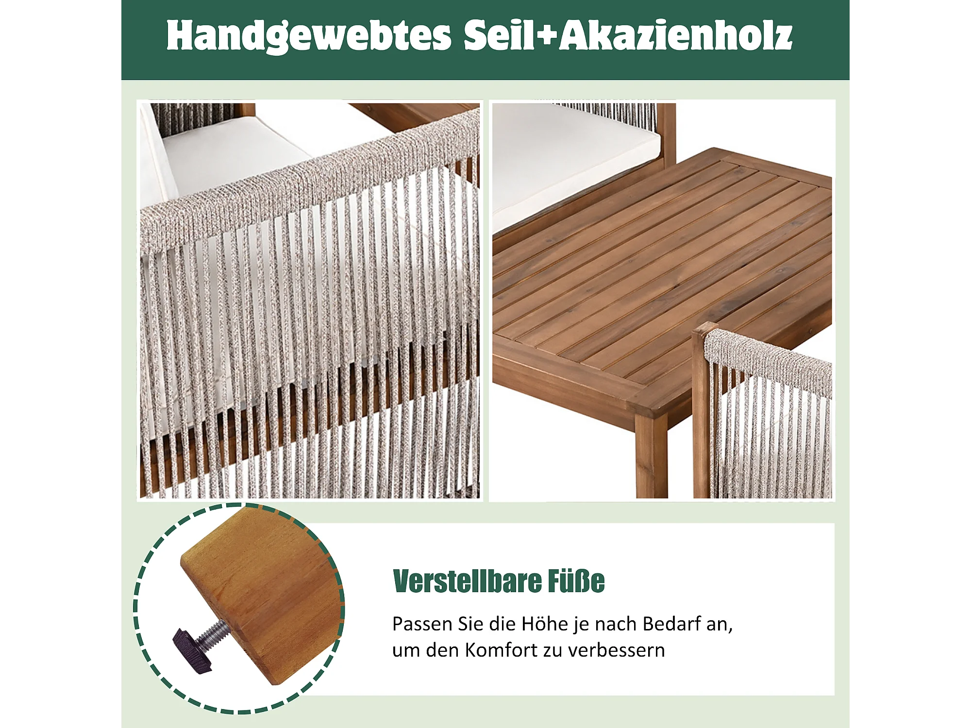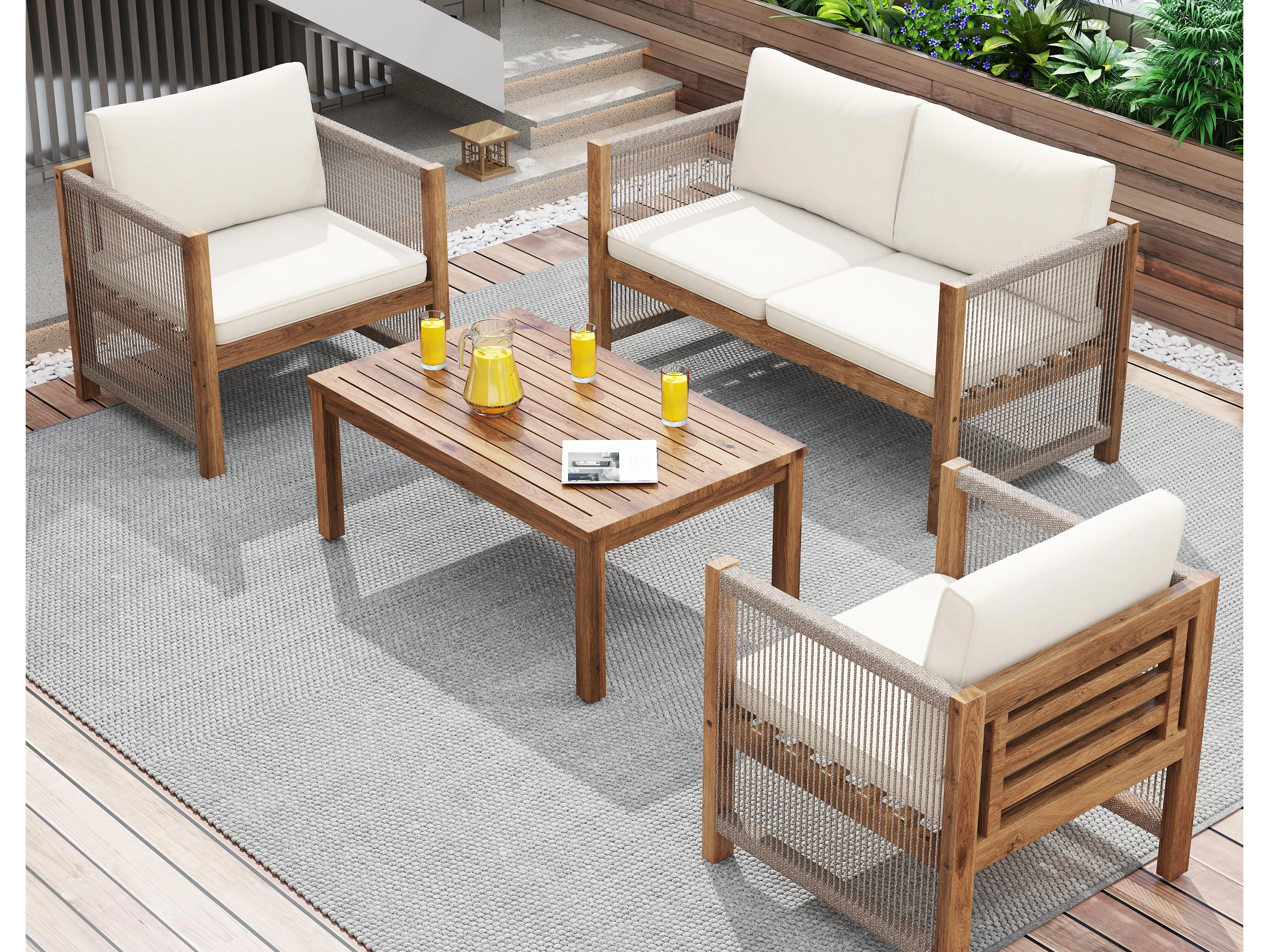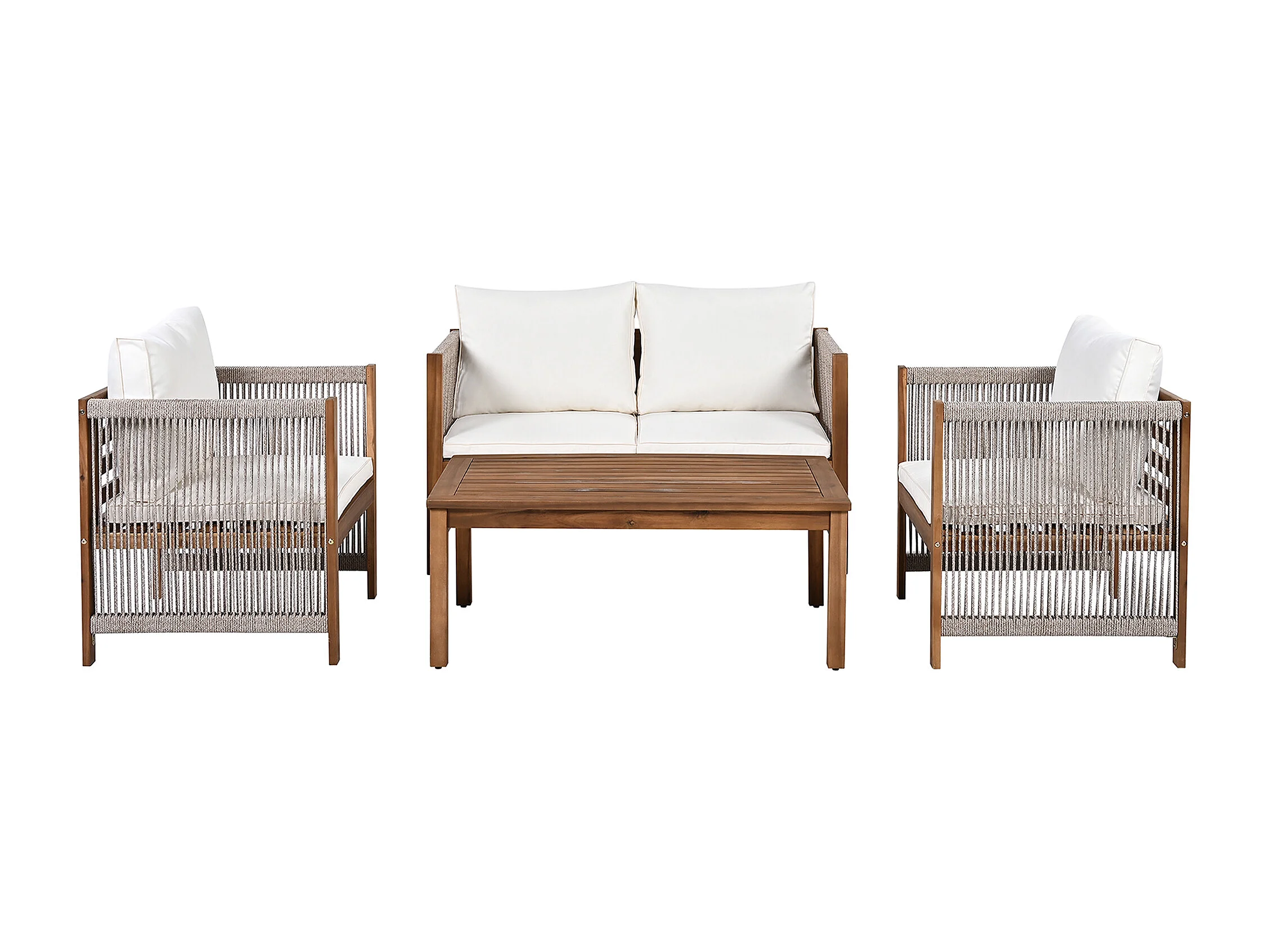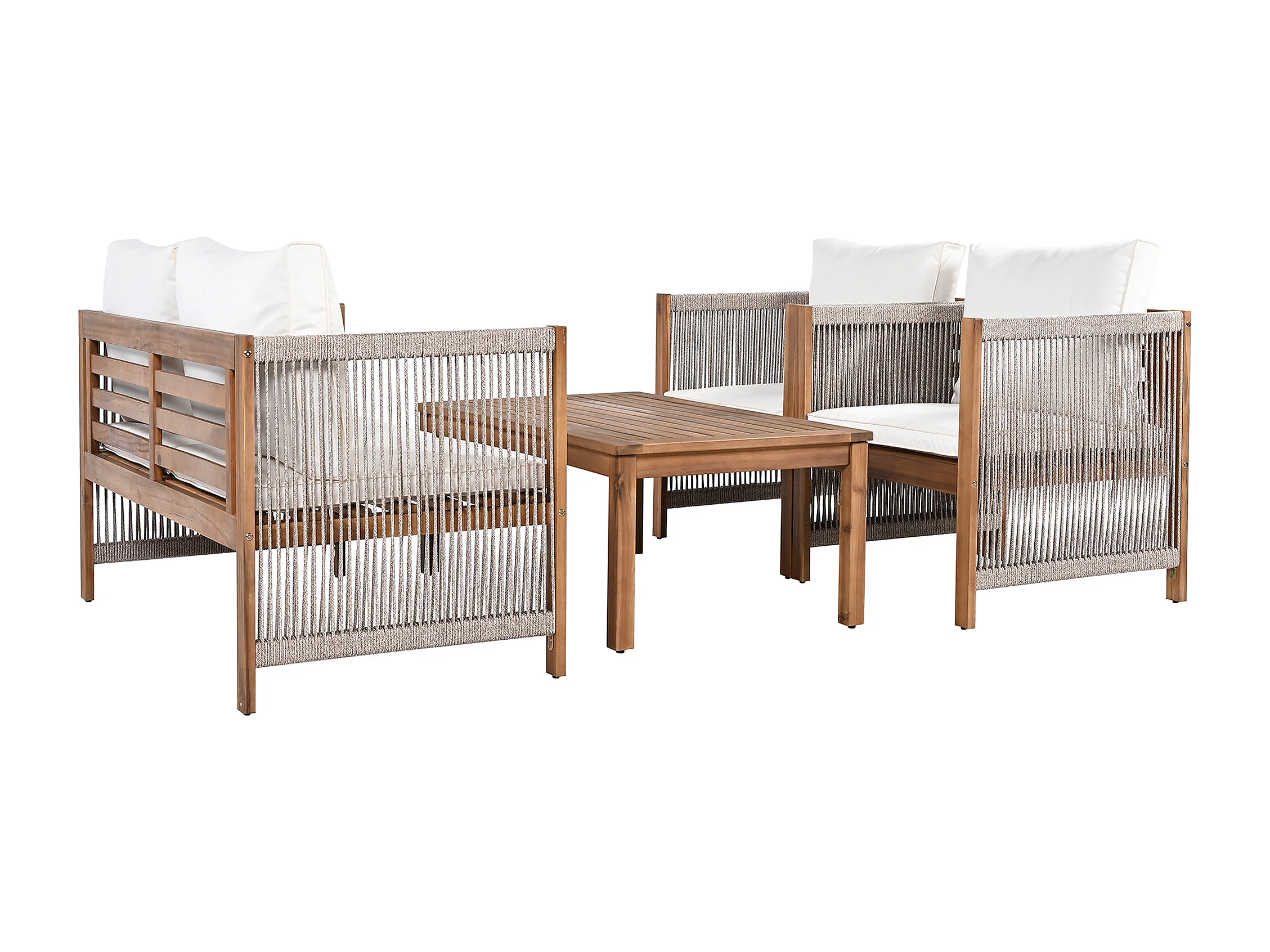 Salon de jardin en acier 4 places - canapé、2 fauteuils et table basse - en corde tressée et bois d'acacia - Beige