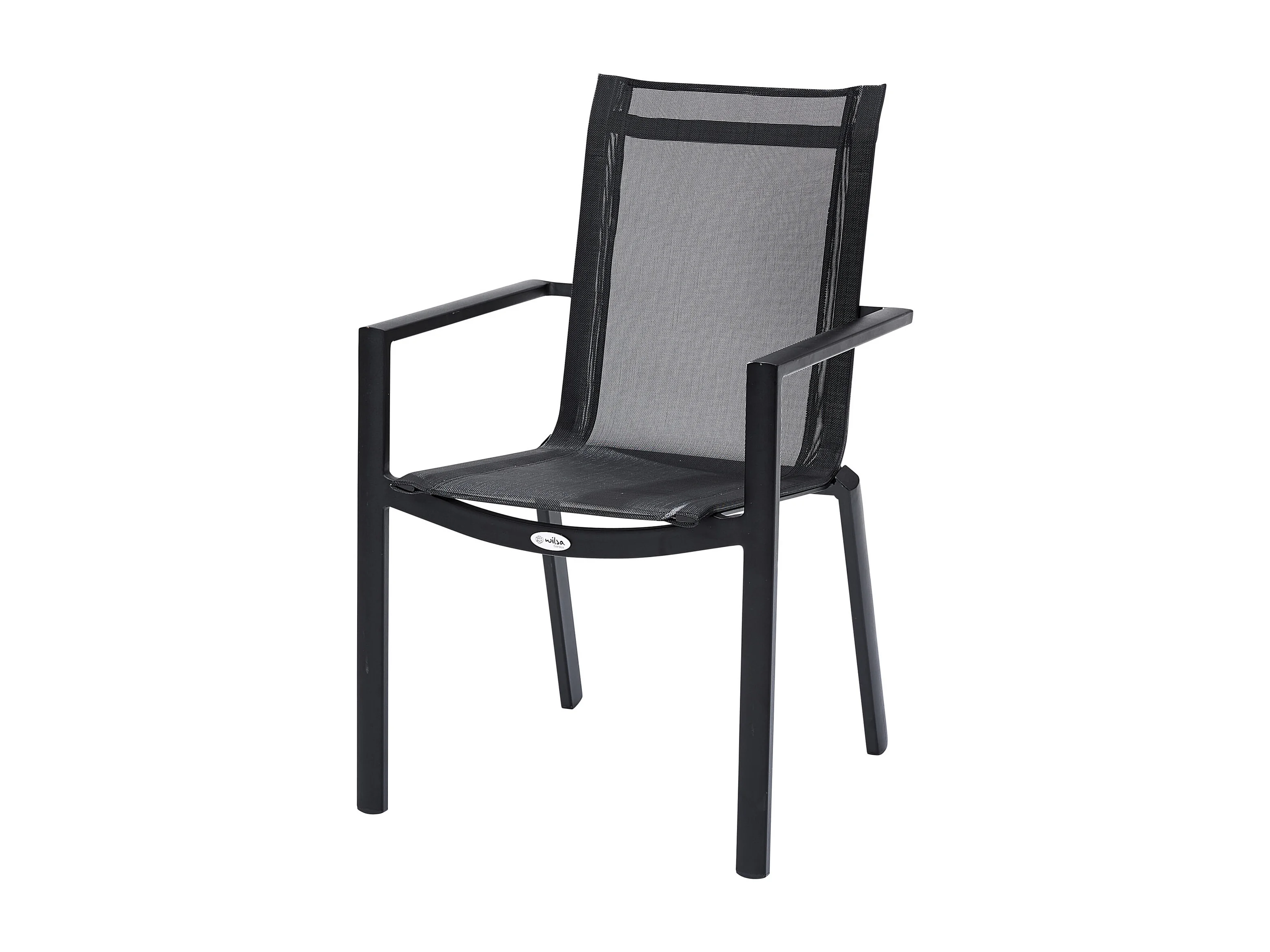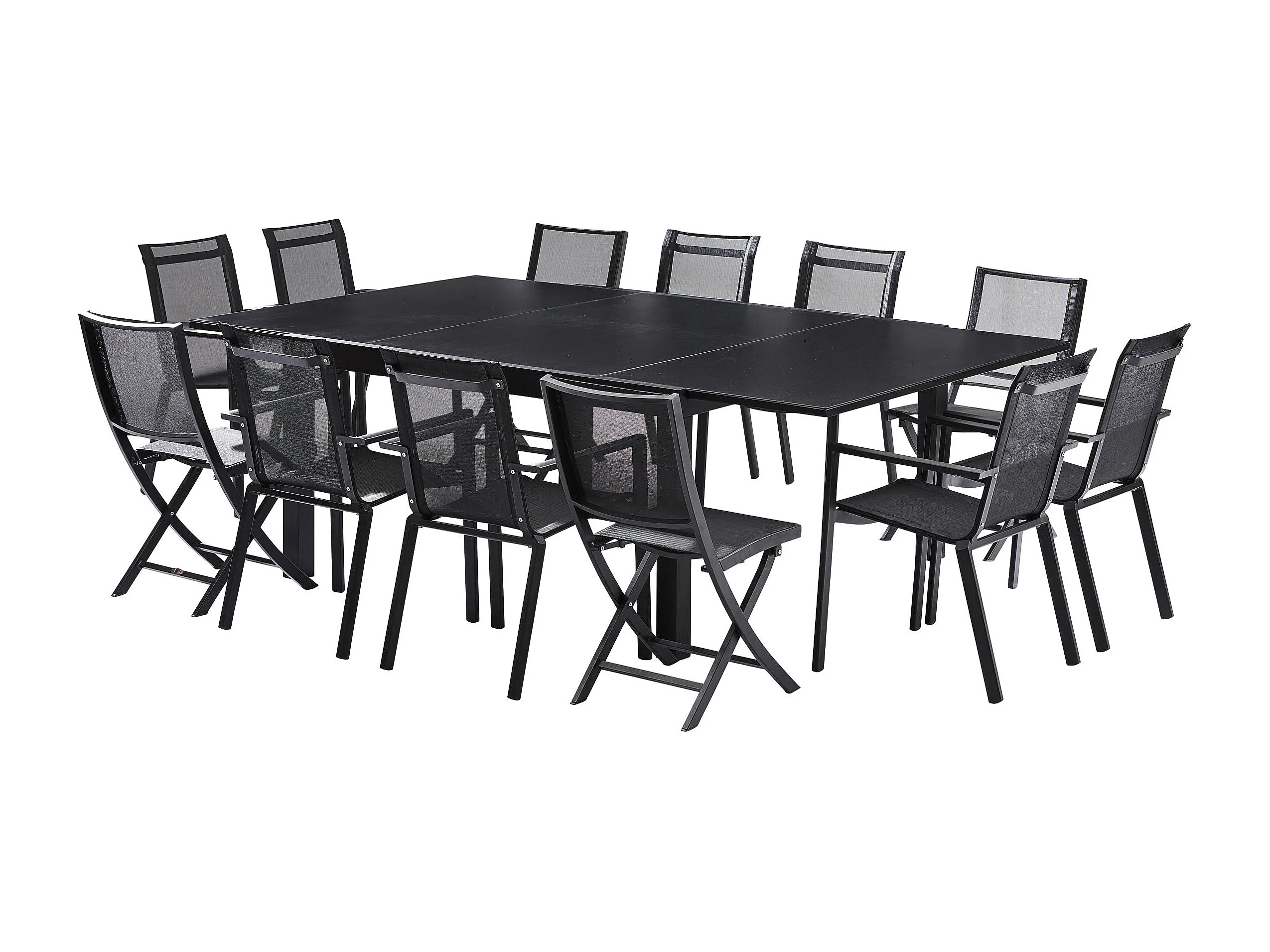 Ensemble BLACKSTAR 8/12p en aluminium noir et verre noir avec 8 fauteuils et 4 chaises pliantes en aluminium et textilène