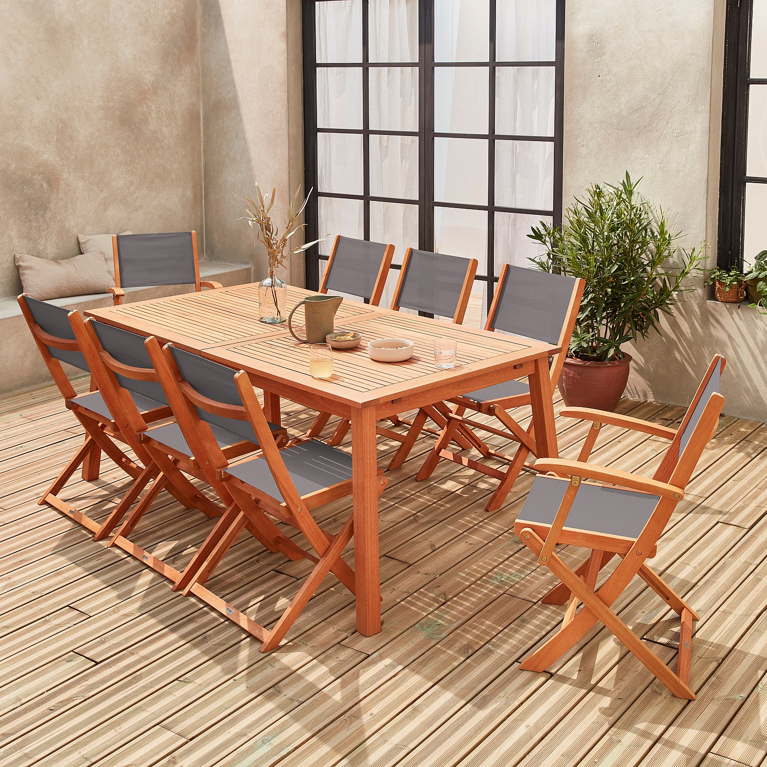 Table de jardin extensible bois d'eucalyptus + 8 assises. en bois d'Eucalyptus huilé et textilène gris anthracite