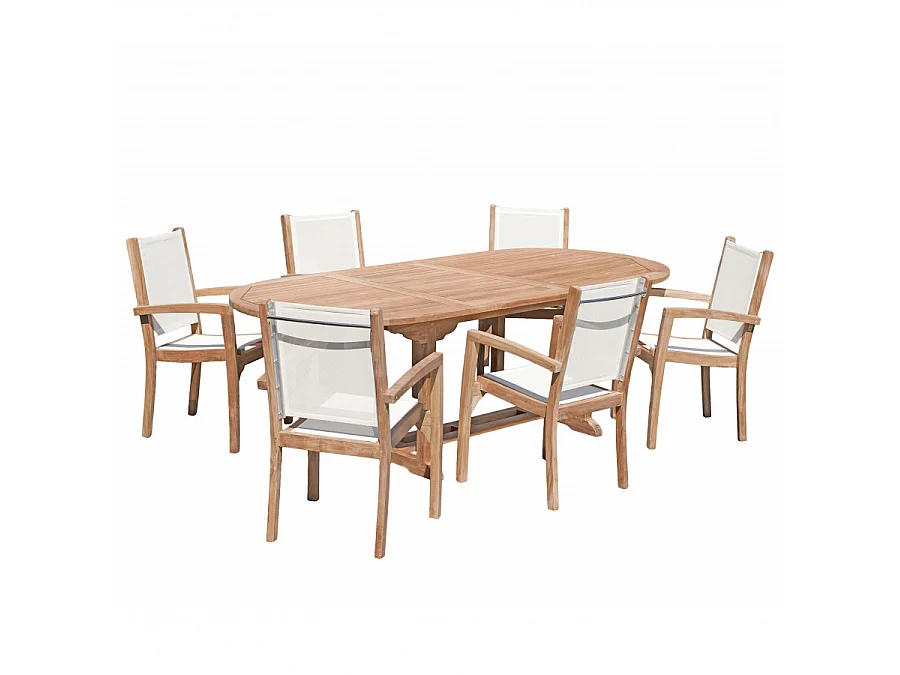 HARRIS - SALON DE JARDIN EN BOIS TECK 8/10 pers. - 1 Table ovale extensible 180*240/100cm et 6 fauteuils textilène