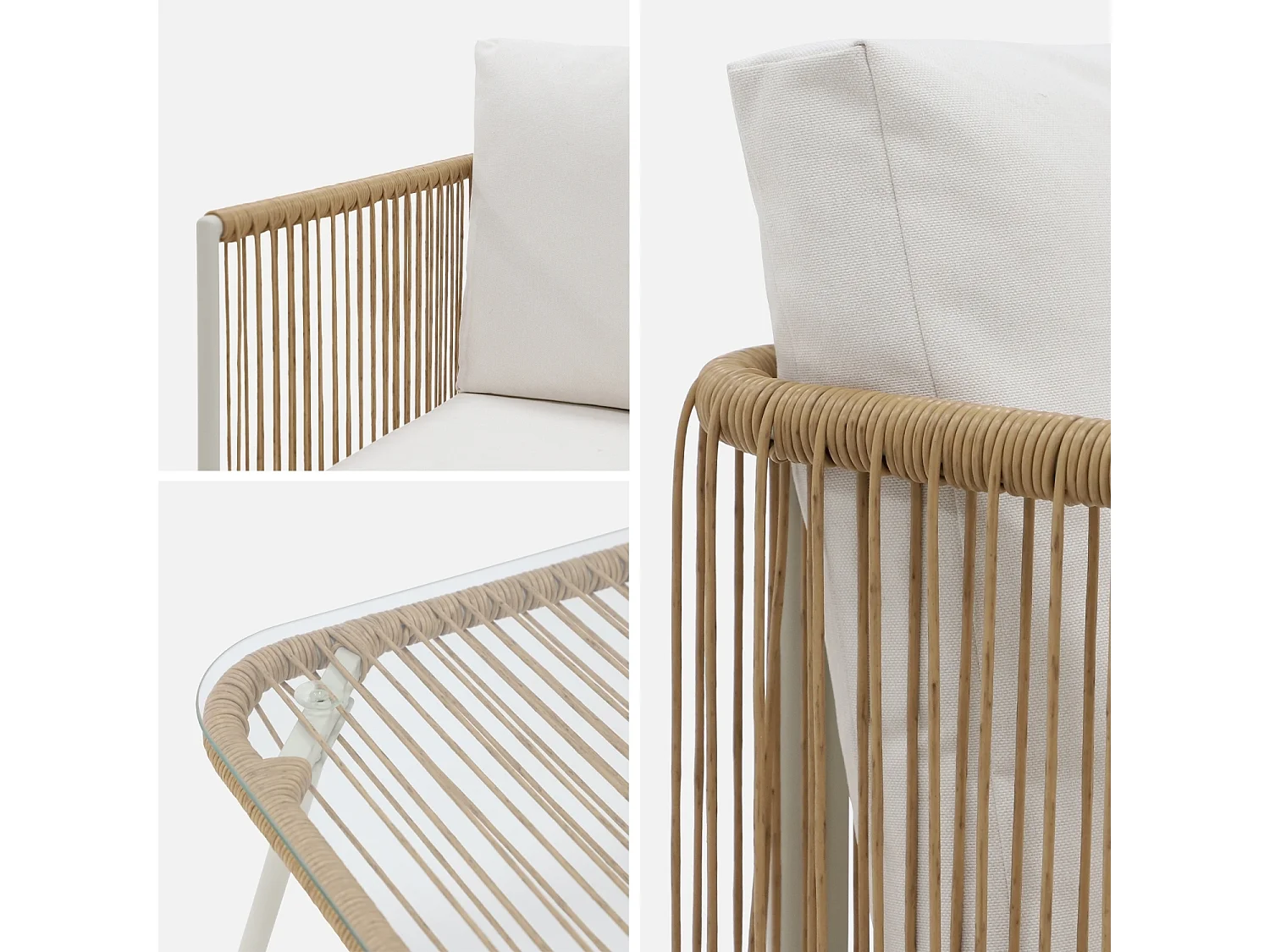 Salon de jardin en corde résine plastique et acier galvanisé. table basse en verre trempé. 4 places