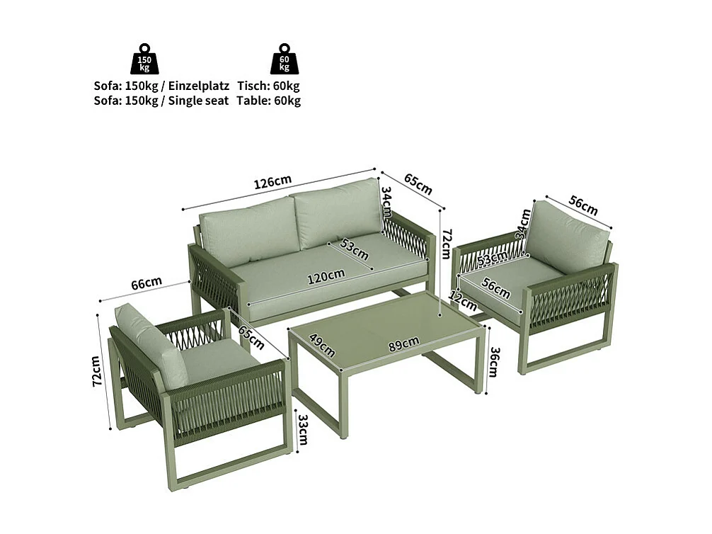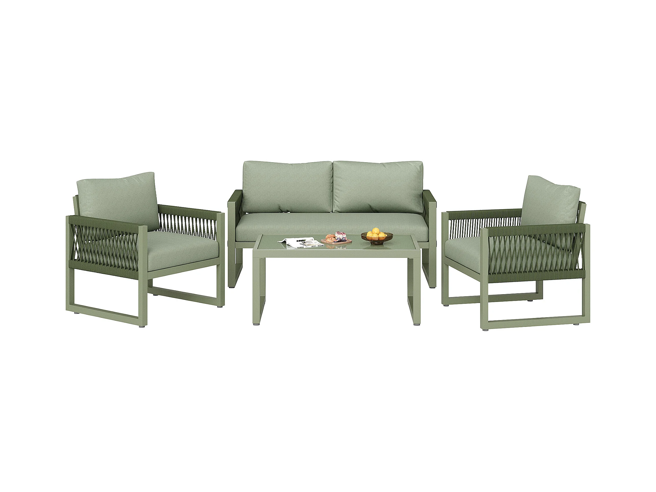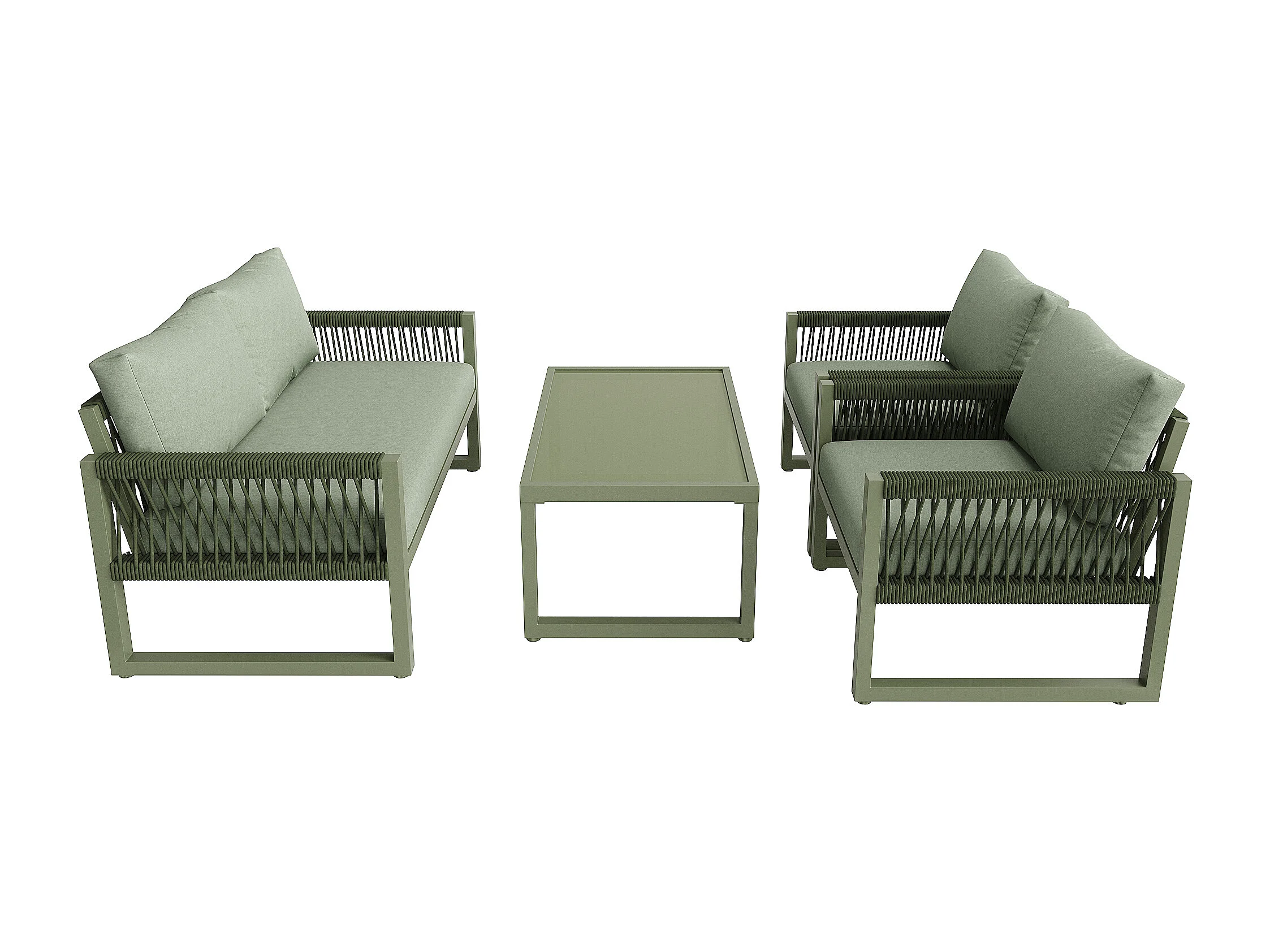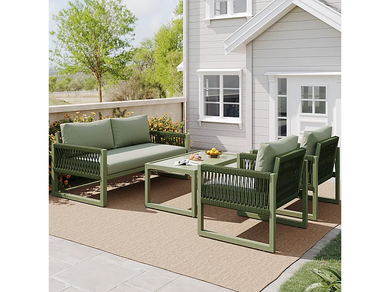 Salon de jardin en Fer galvanisé - 1 canapé 2 fauteuils et 1 table basse en verre - décoré de Corde - 4 places- Vert Avocat