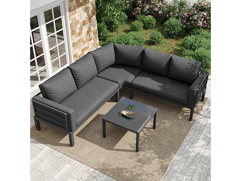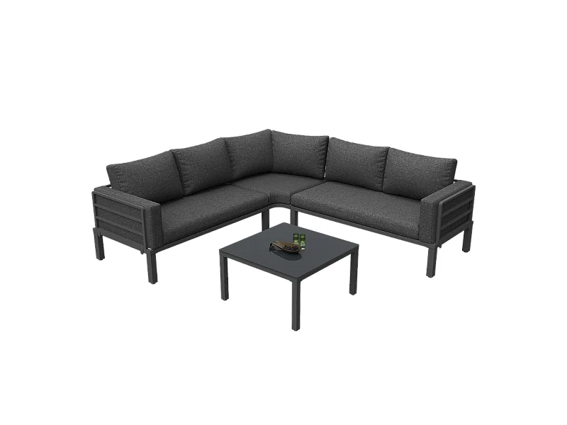 Salon de jardin en fer galvanisé 4 places - 2 canapés, 1 tables basse en verre trempé - avec coussins - Gris