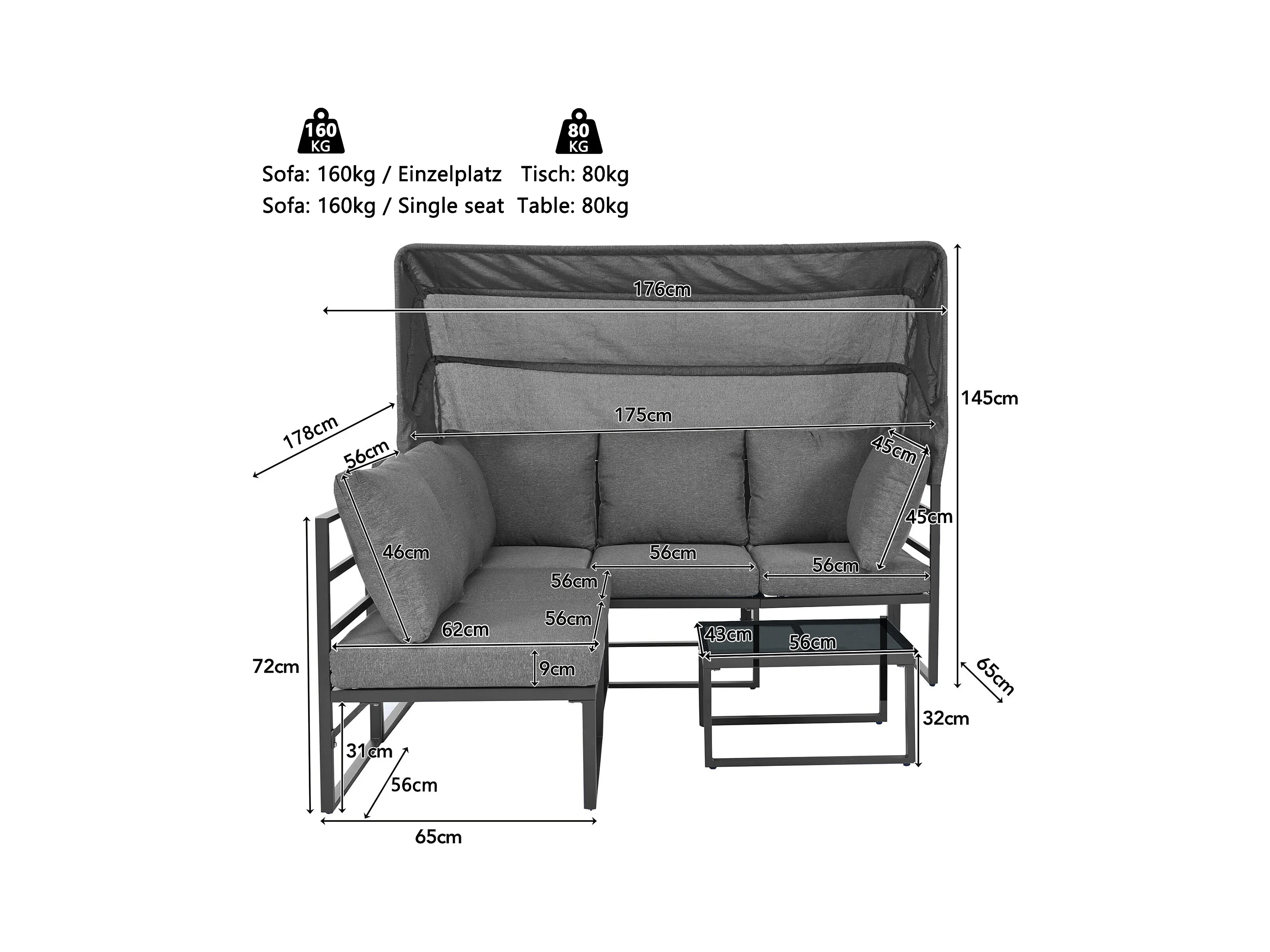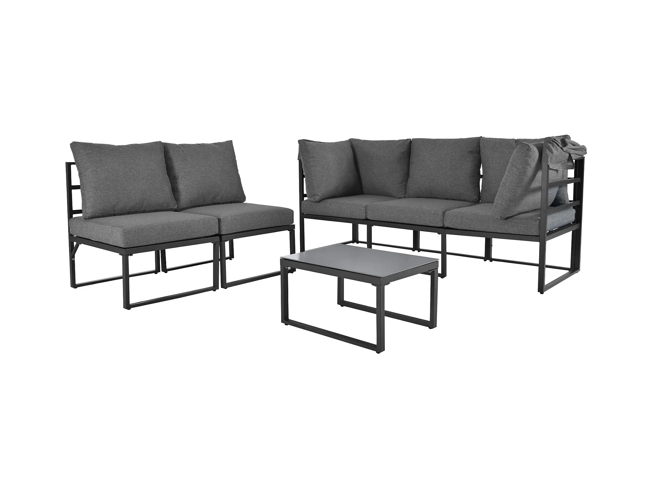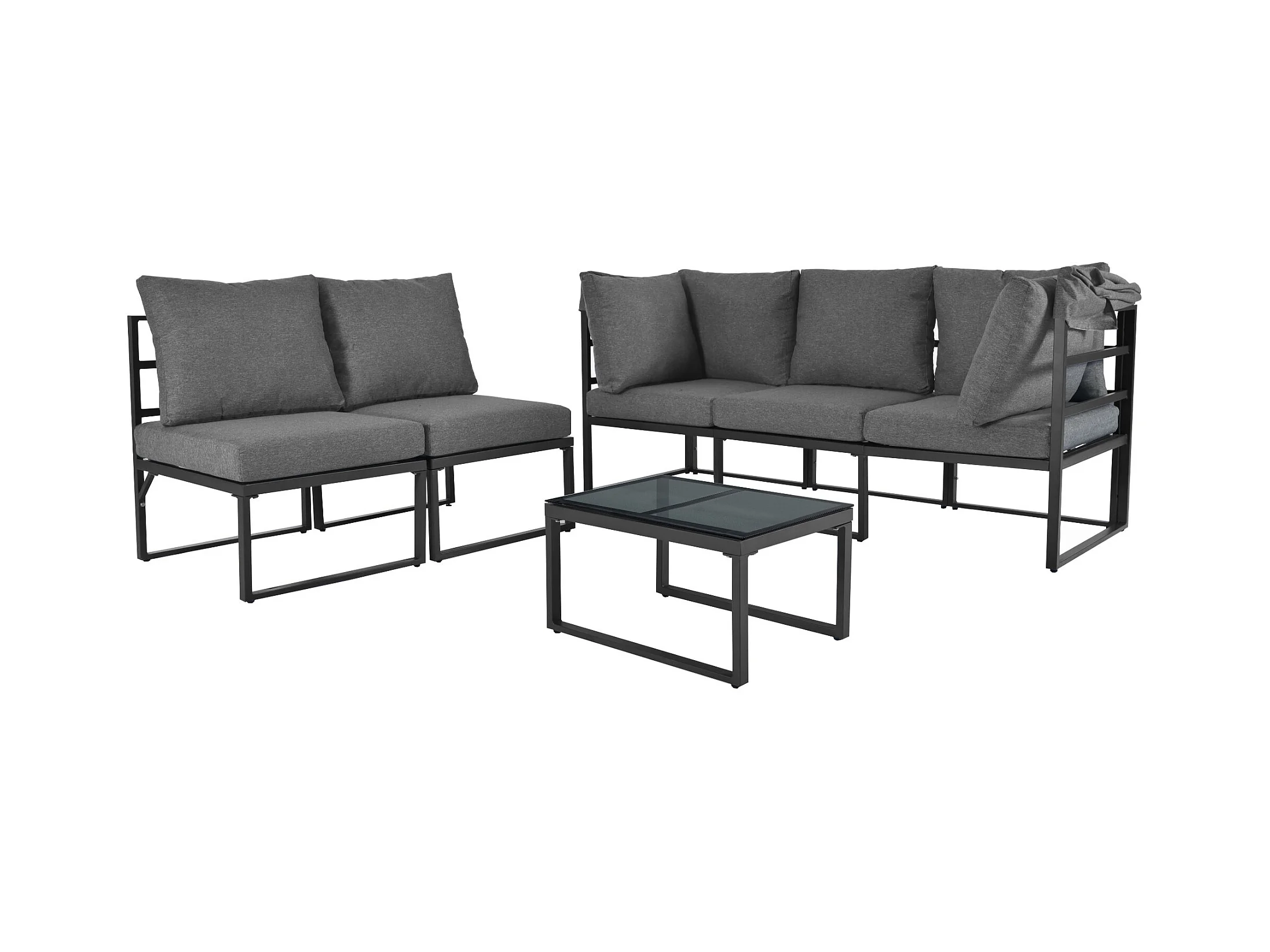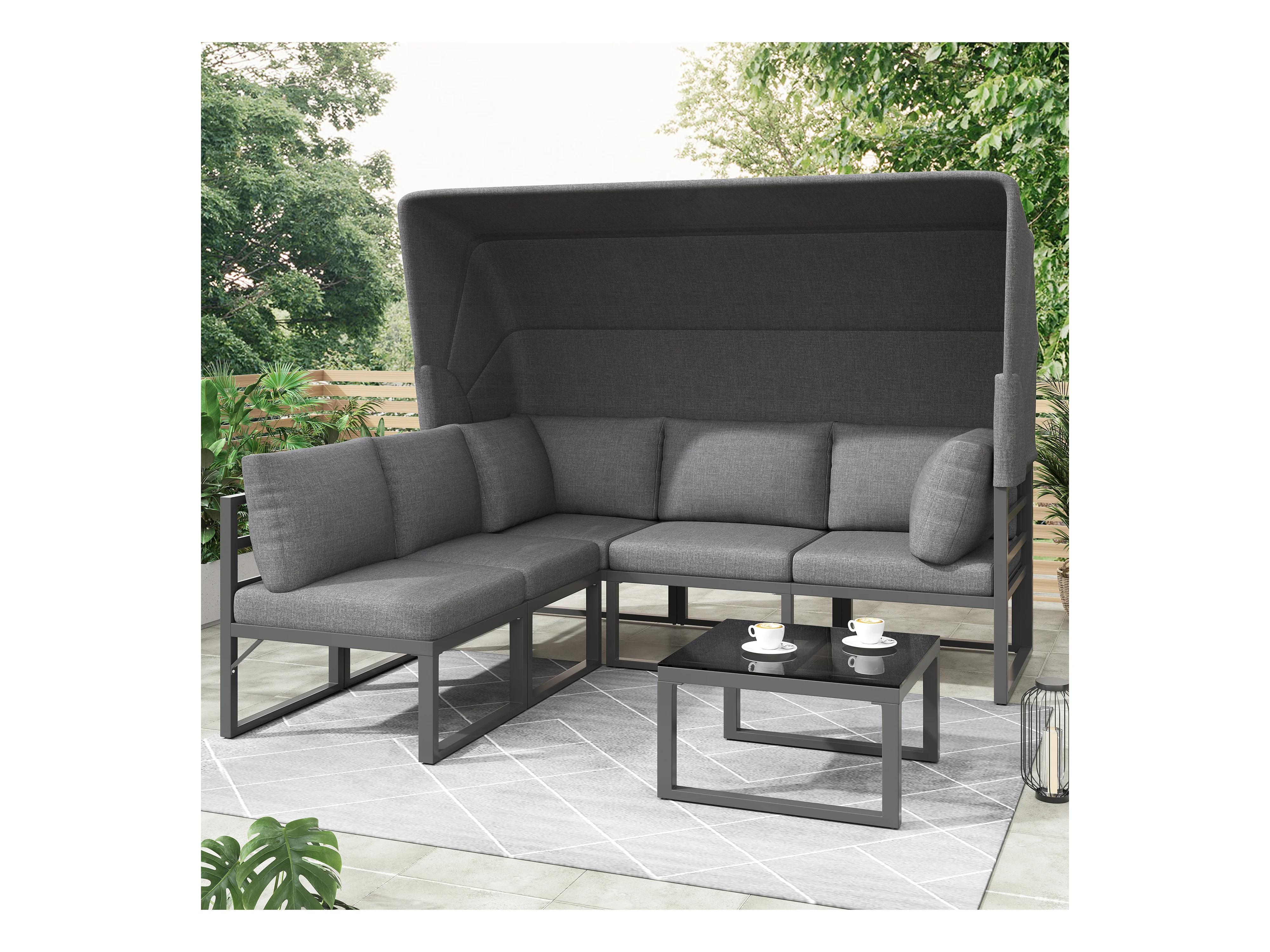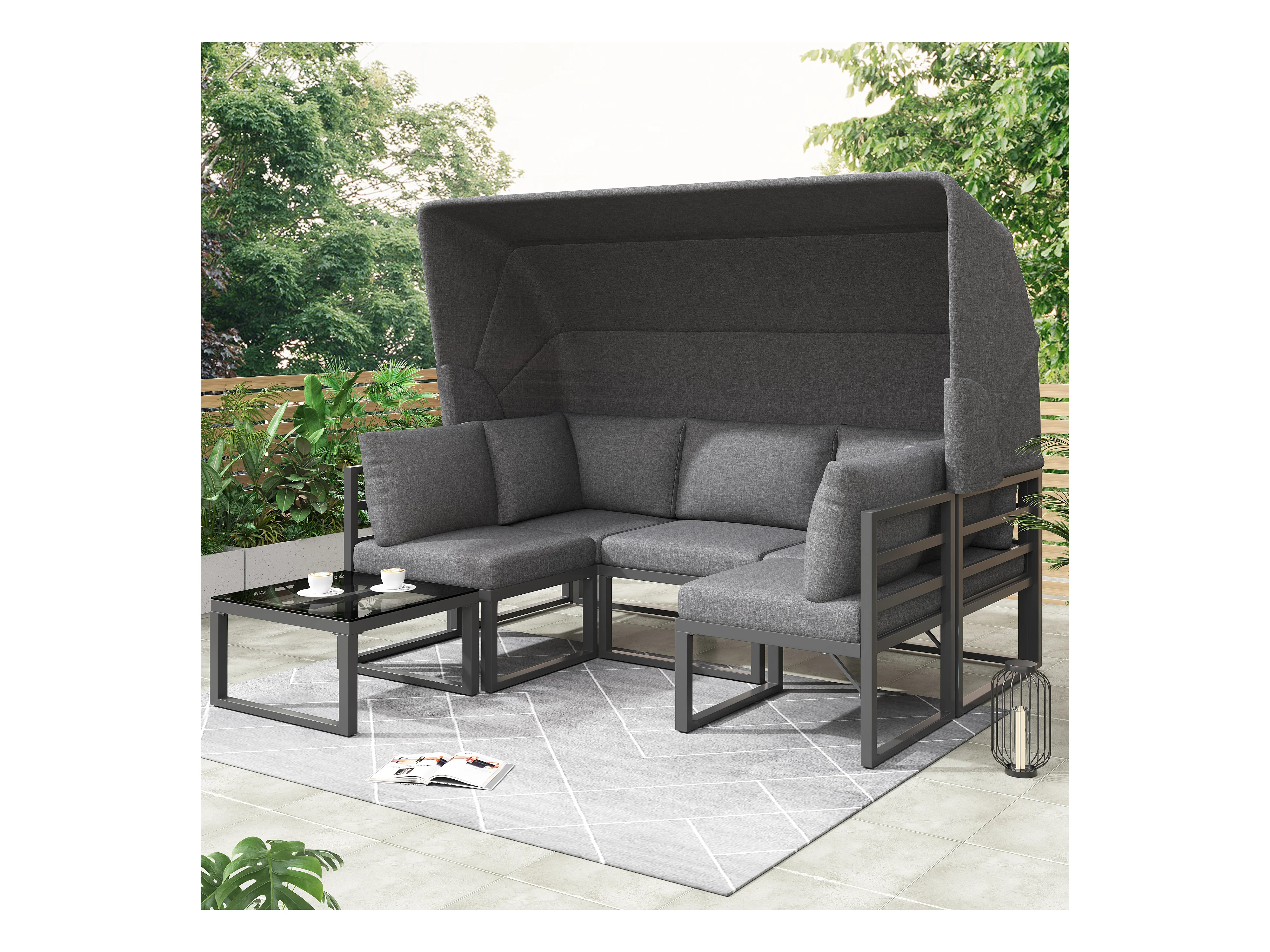 Salon de jardin en métal avec pare-soleil pliable 5 places - 1 Canapé 3 places + 2 fauteuils + 1 table basse - Gris