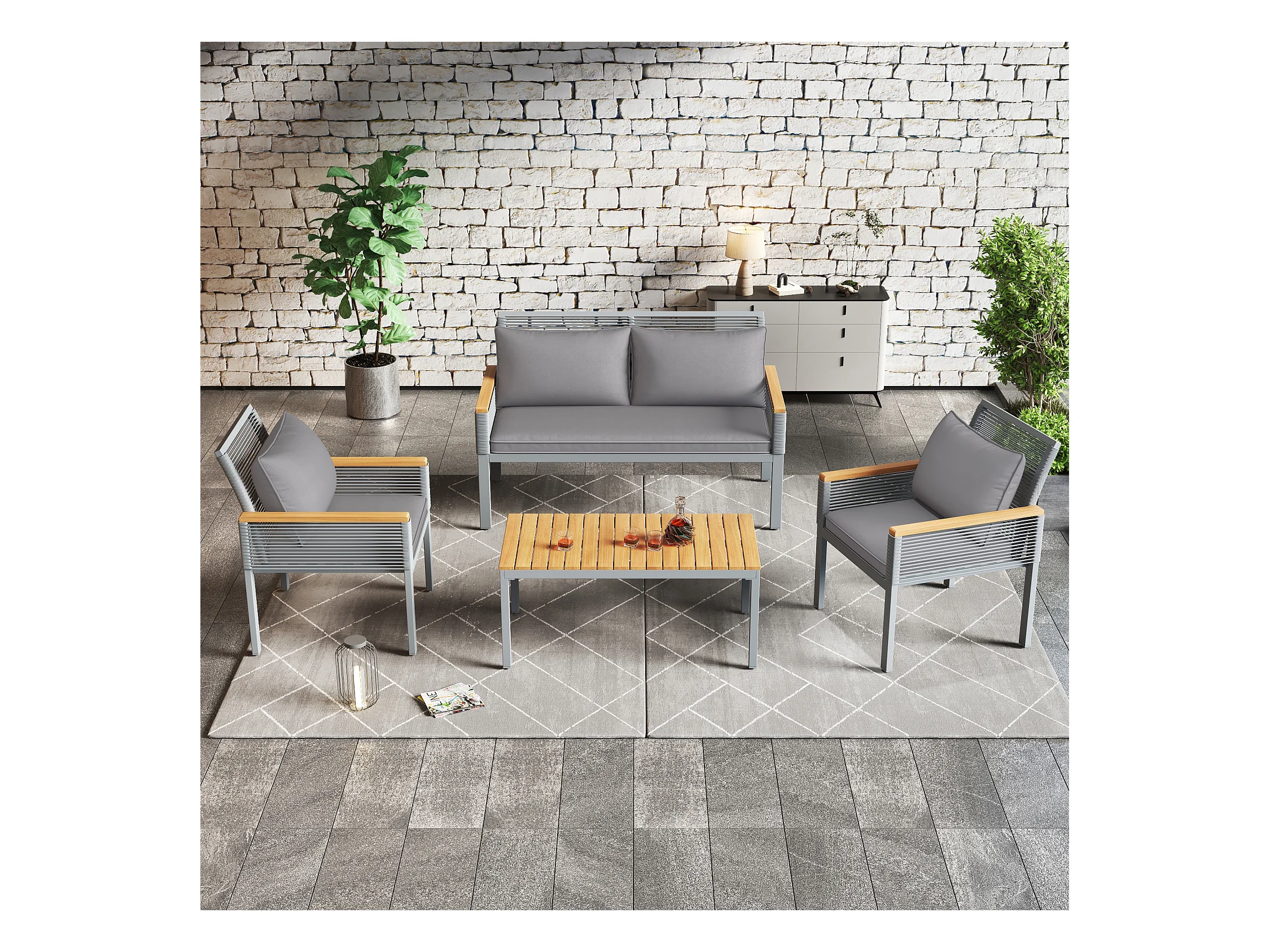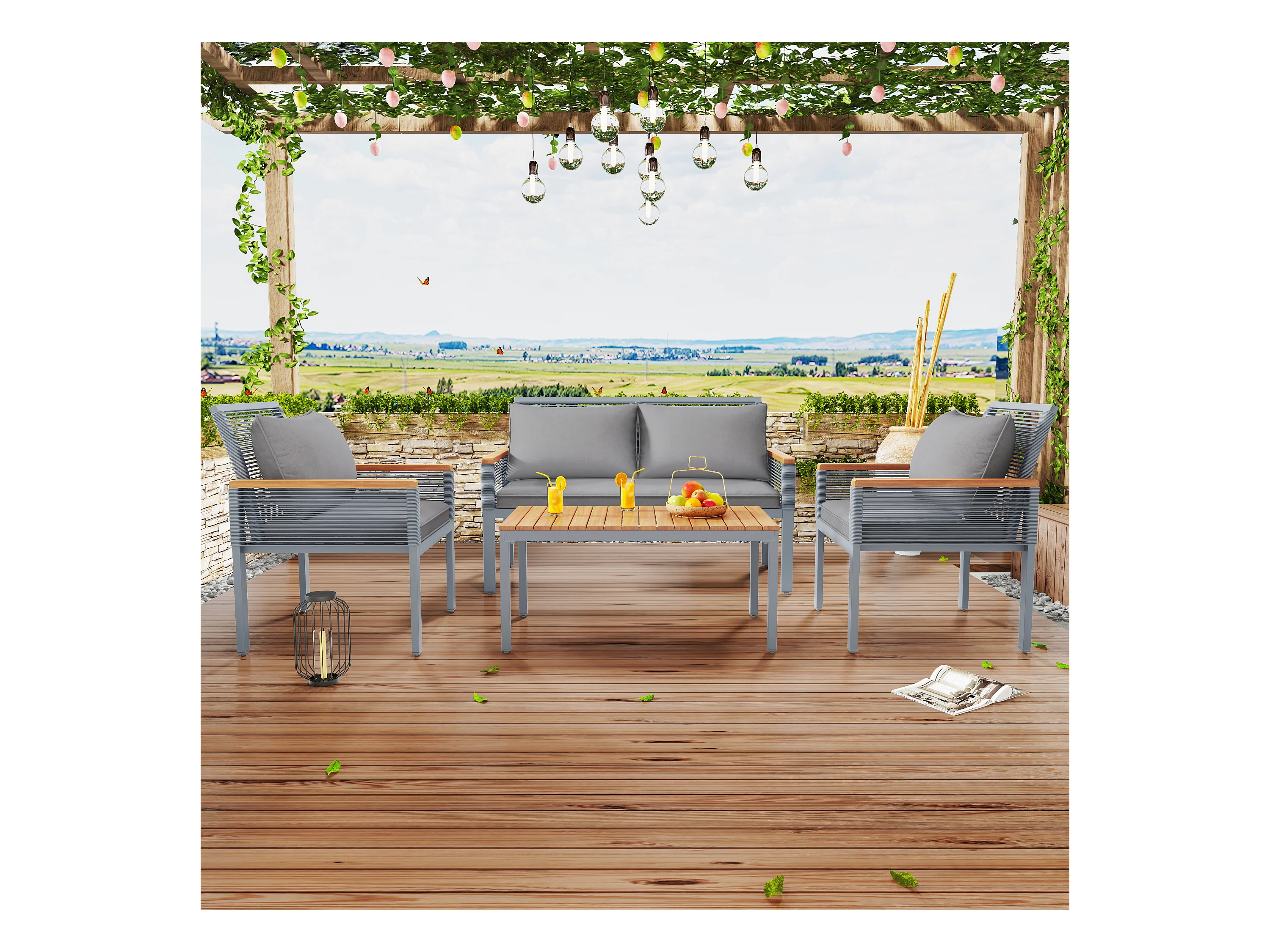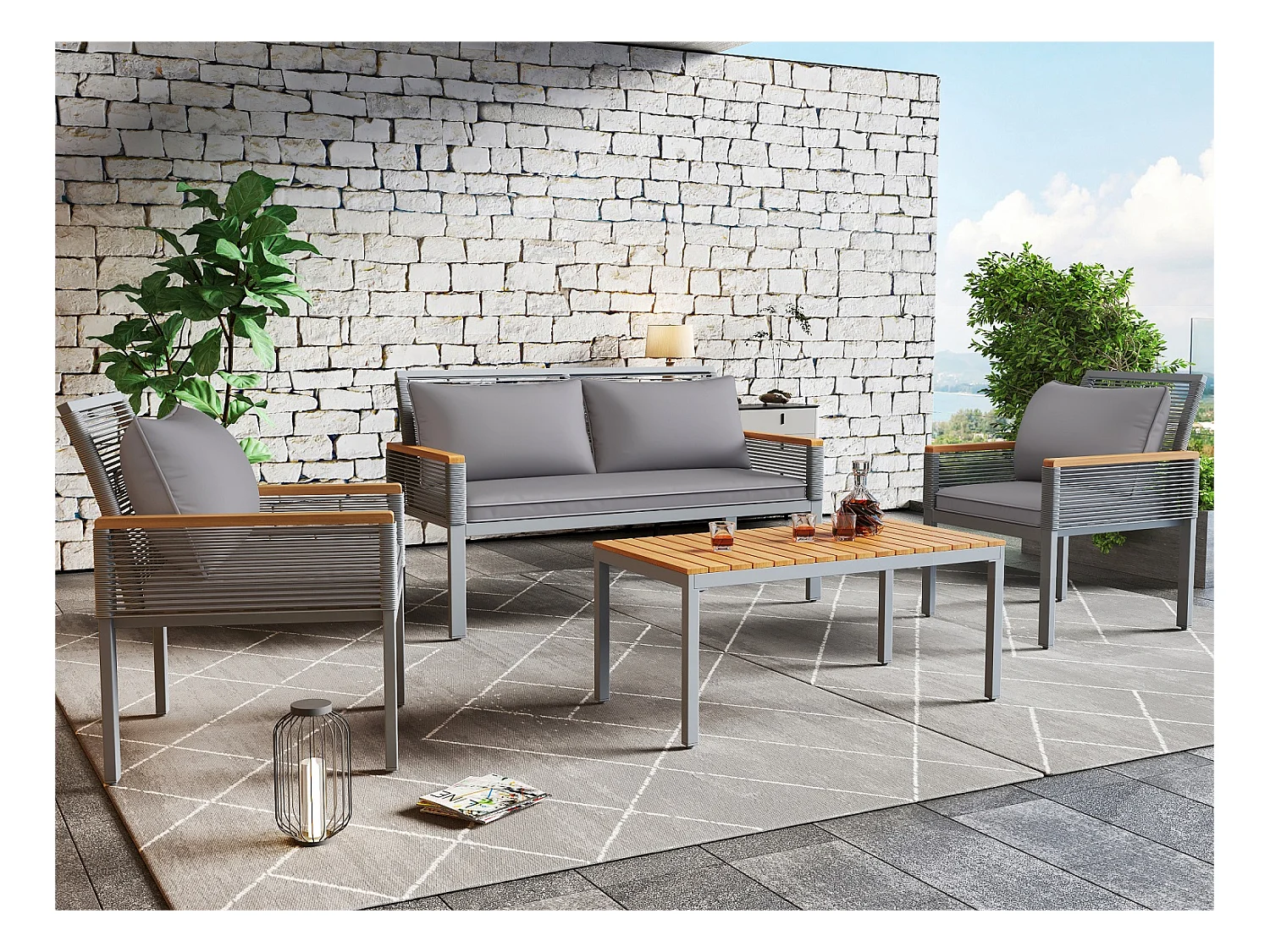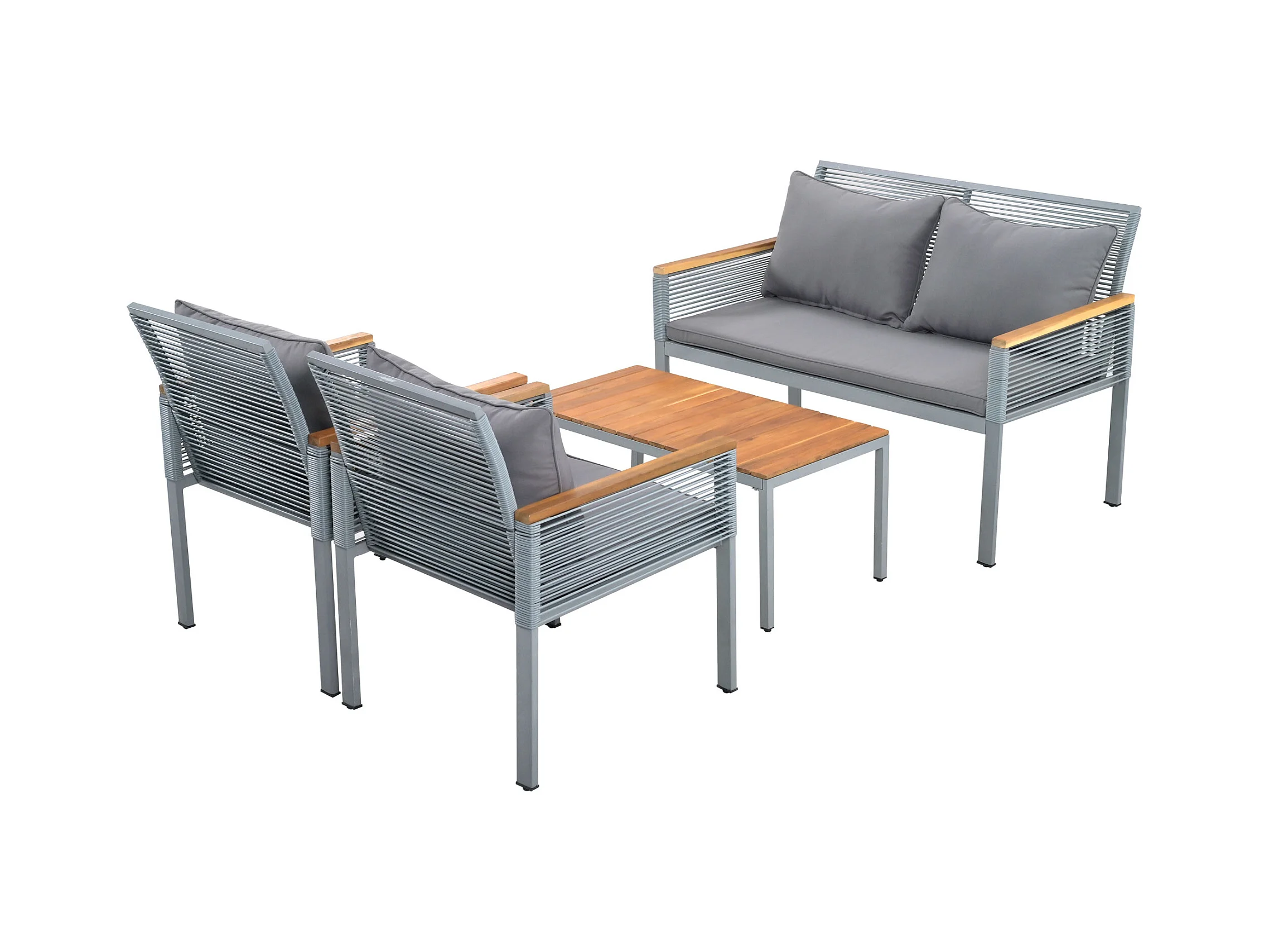 Salon de jardin en métal: un canapé 2 places + 2 fauteuils + 1 table basse - gris + bois naturel