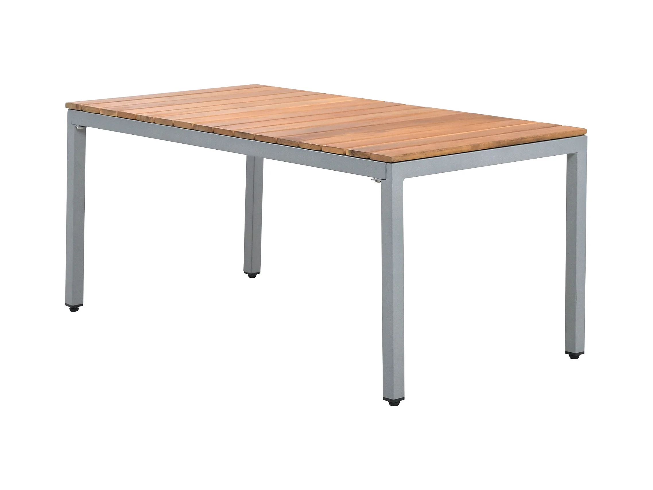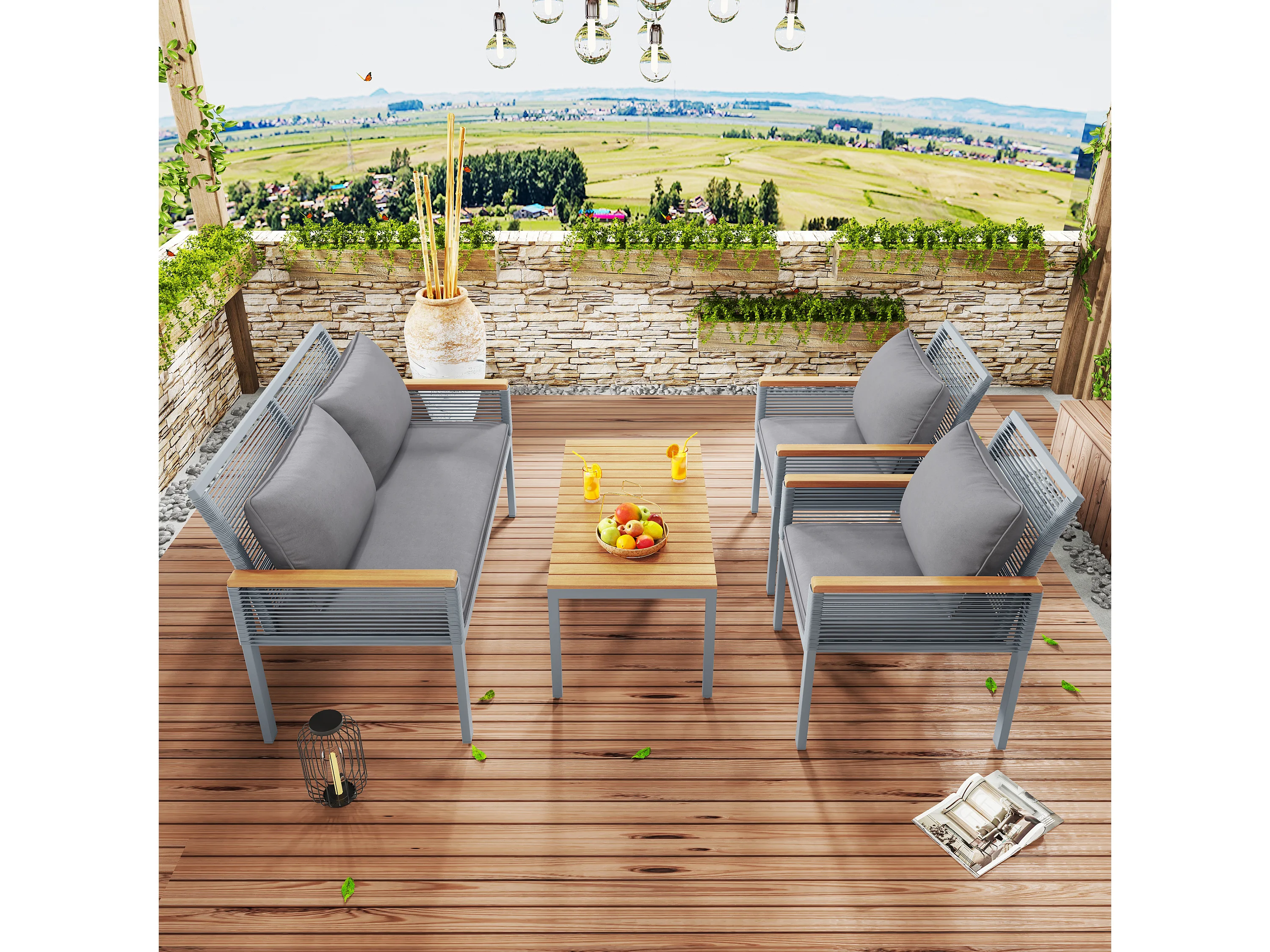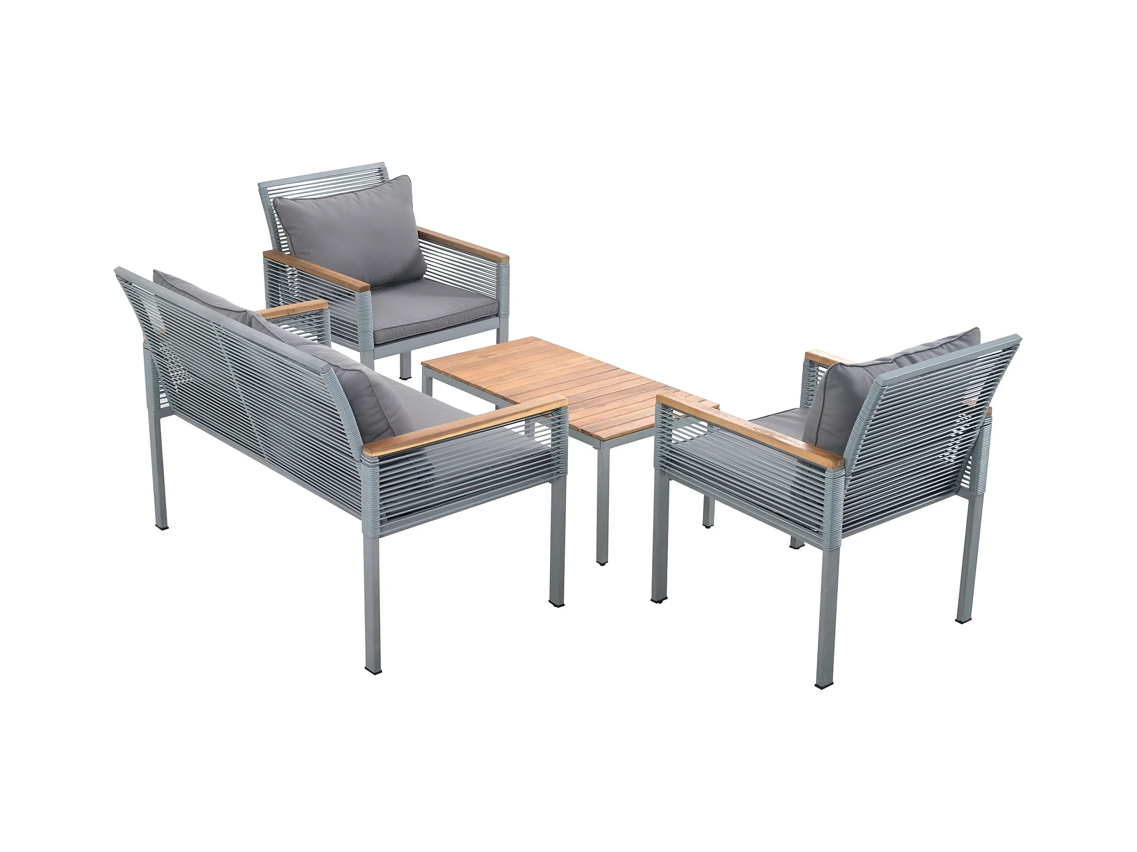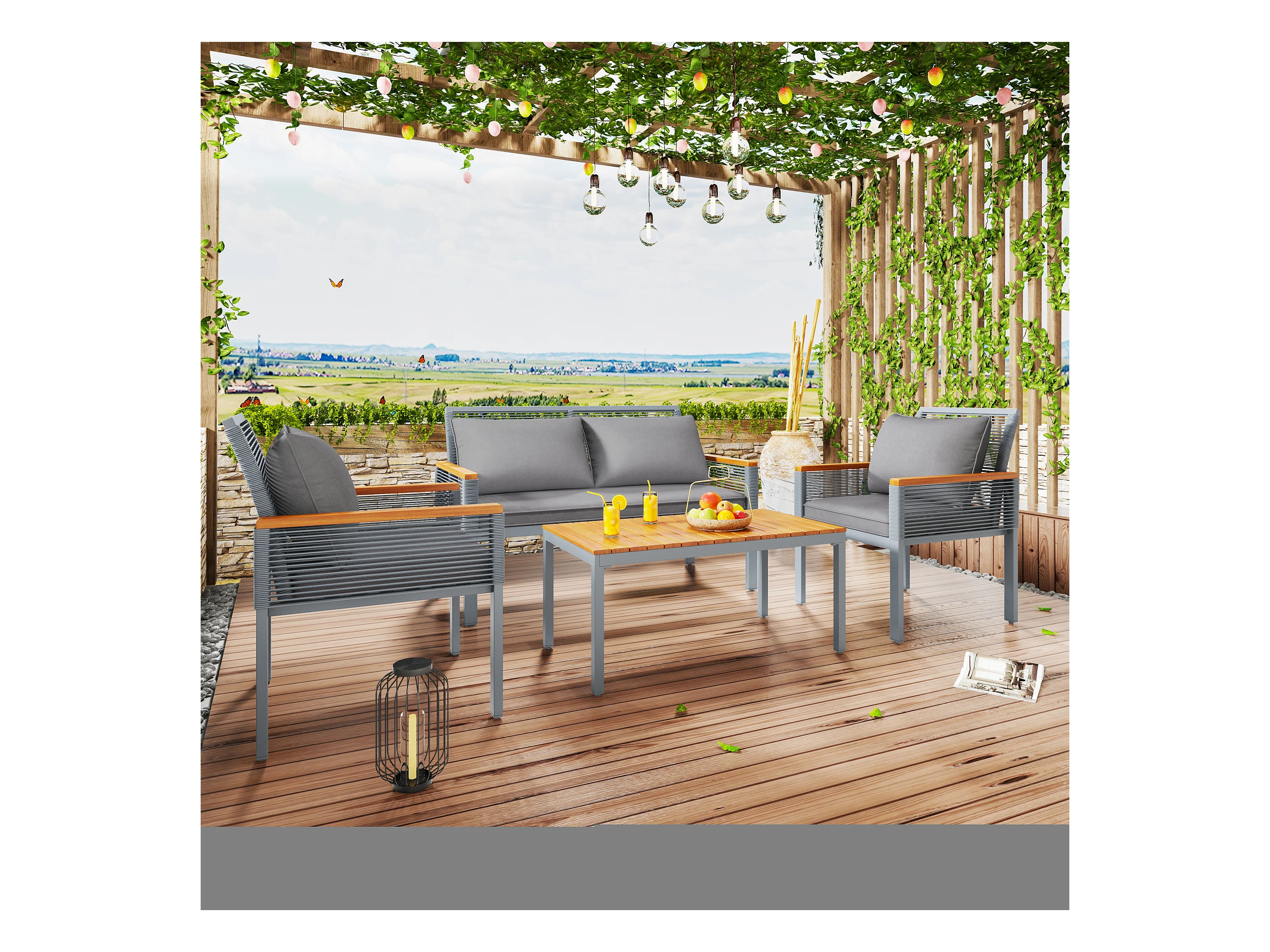 Salon de jardin en métal: un canapé 2 places + 2 fauteuils + 1 table basse - gris + bois naturel