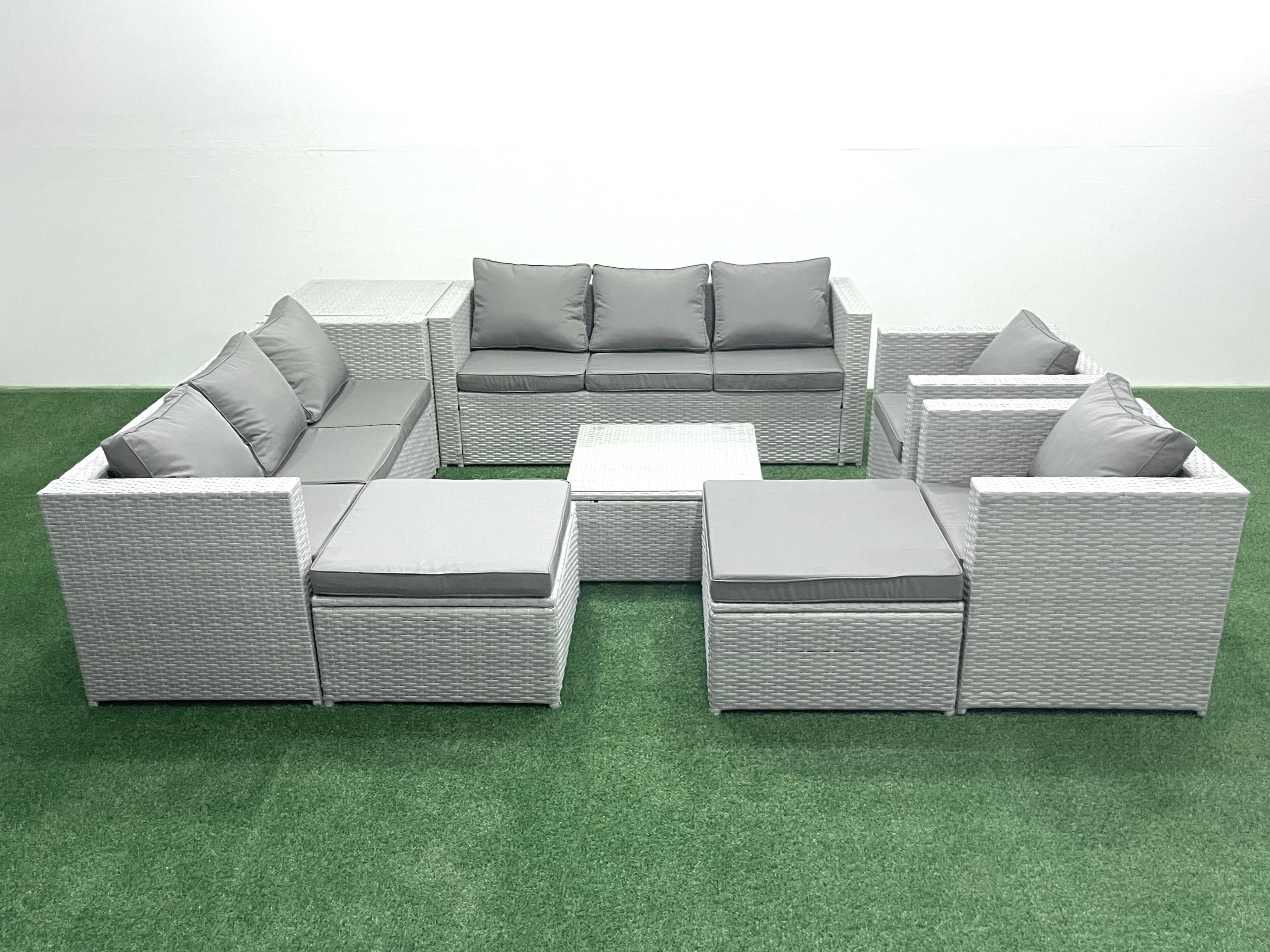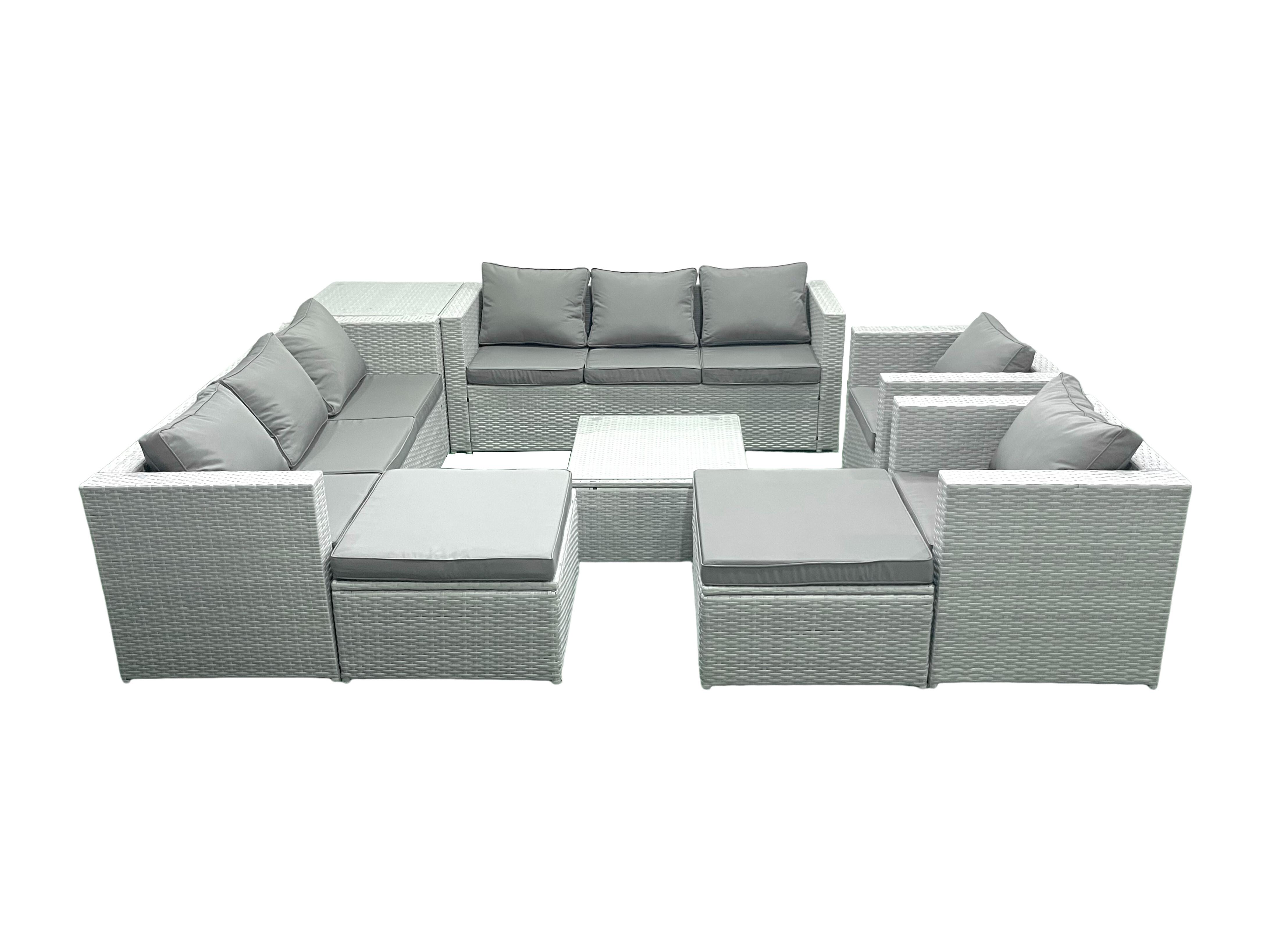 Salon de Jardin en rotin avec 2 Fauteuil Table basse carrée 2 Grand tabourets Table d'appoint Gris clair mixte