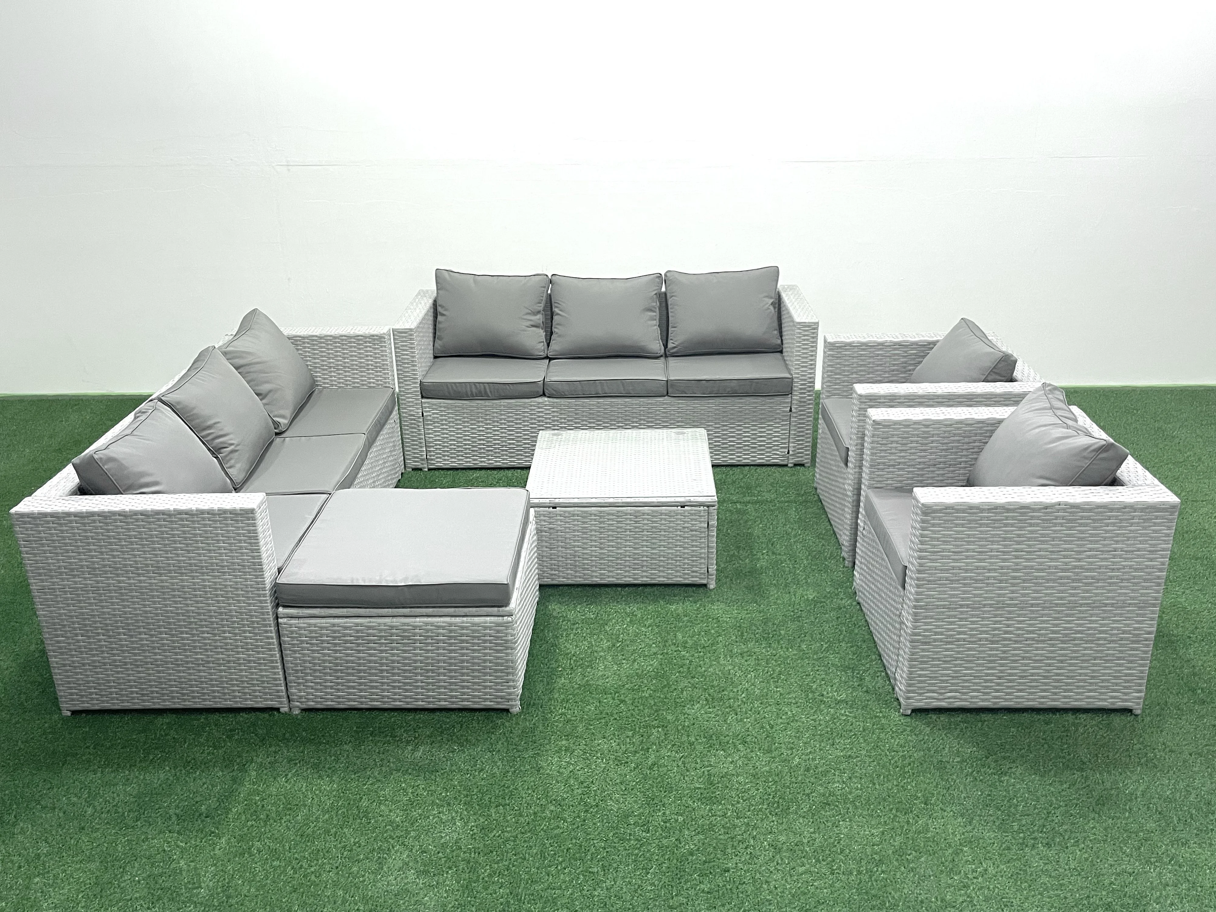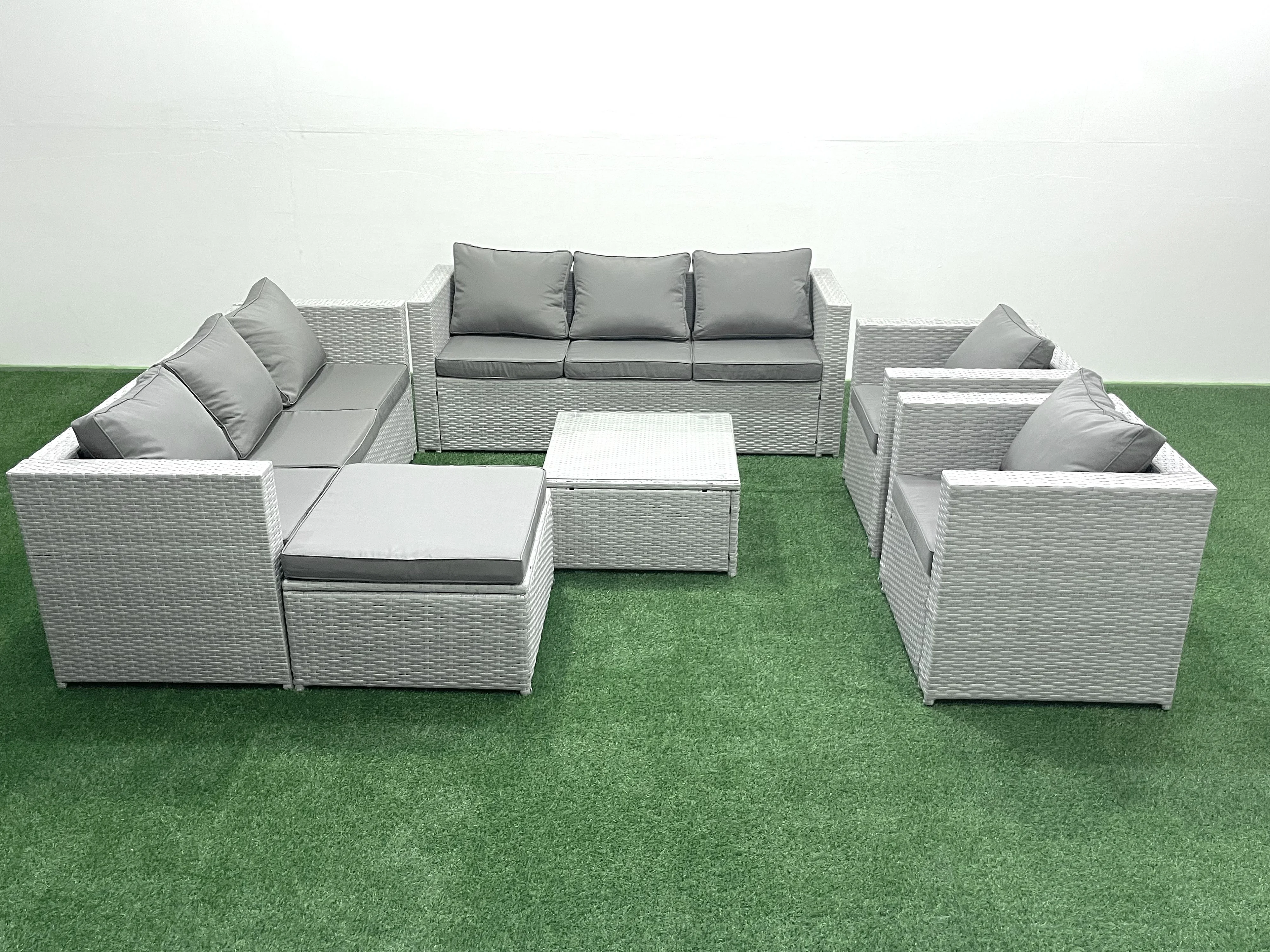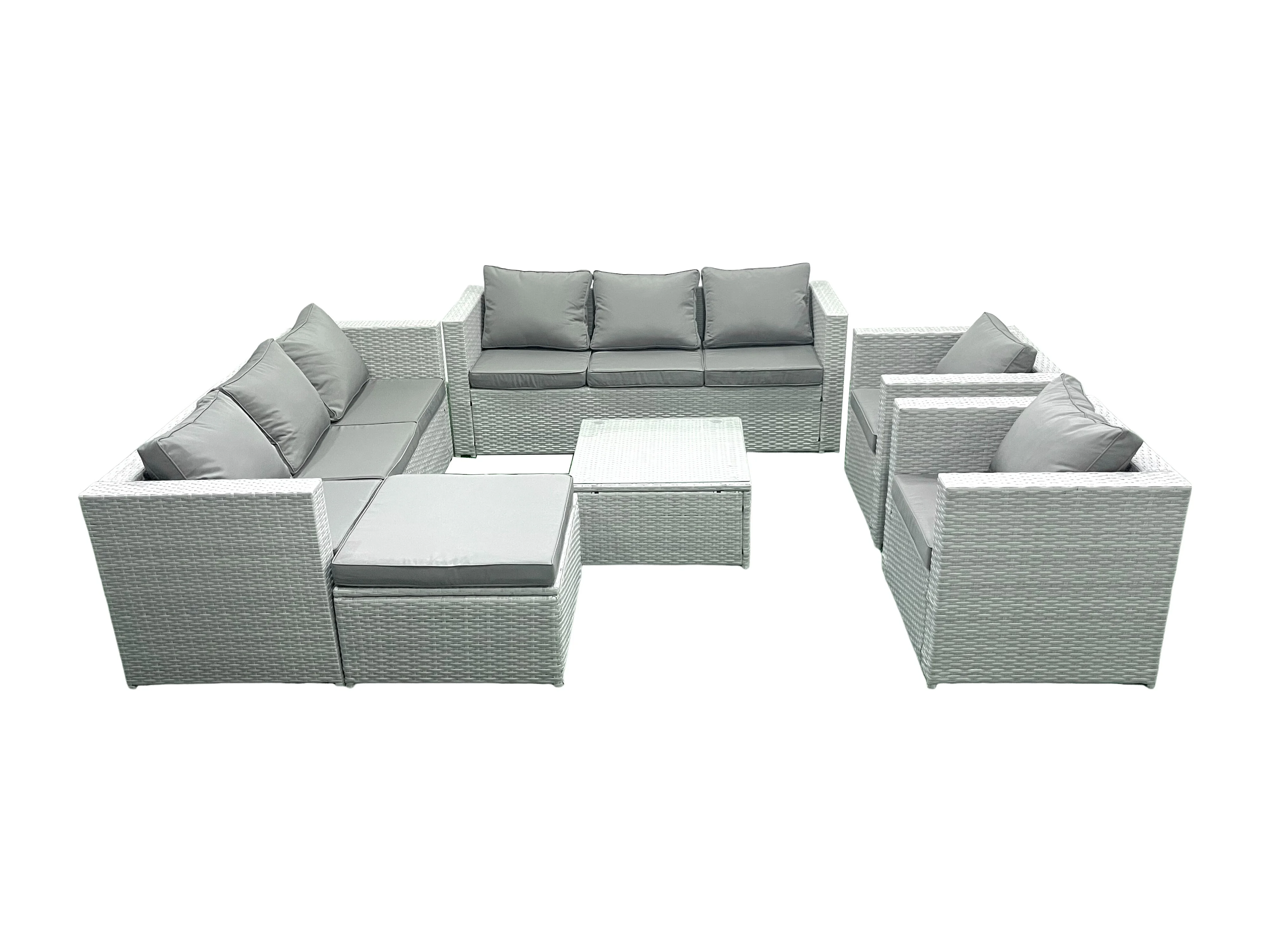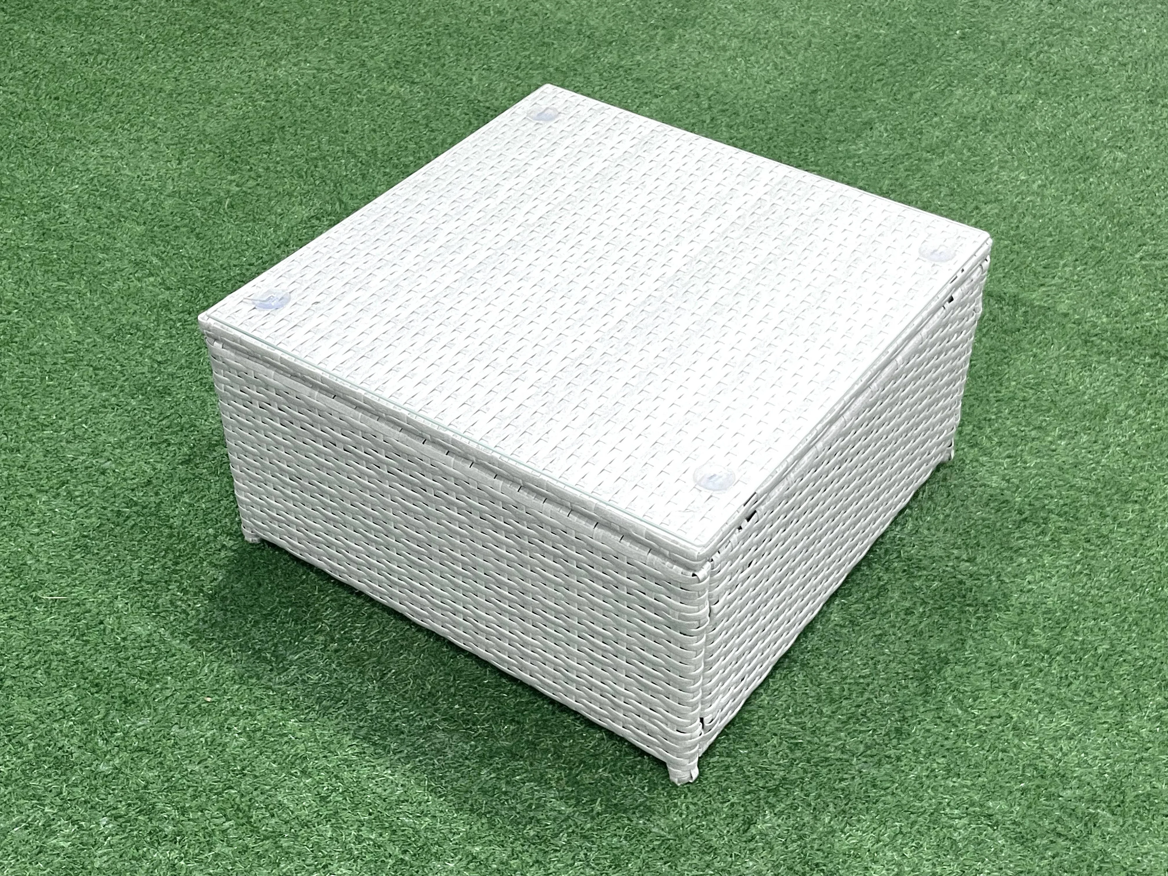 Salon de Jardin en rotin avec 2 Fauteuil Table basse carrée Grand tabouret Gris clair mixte