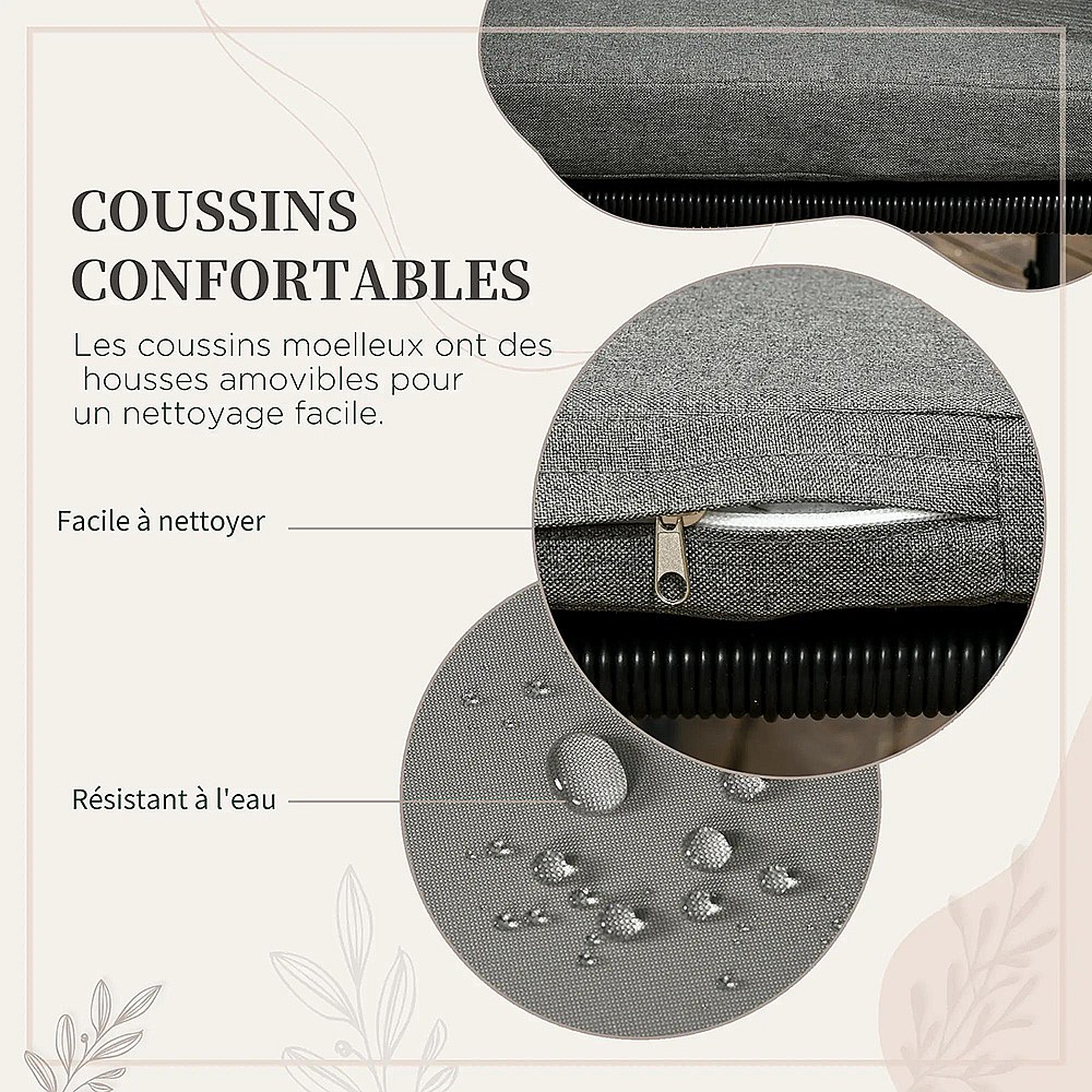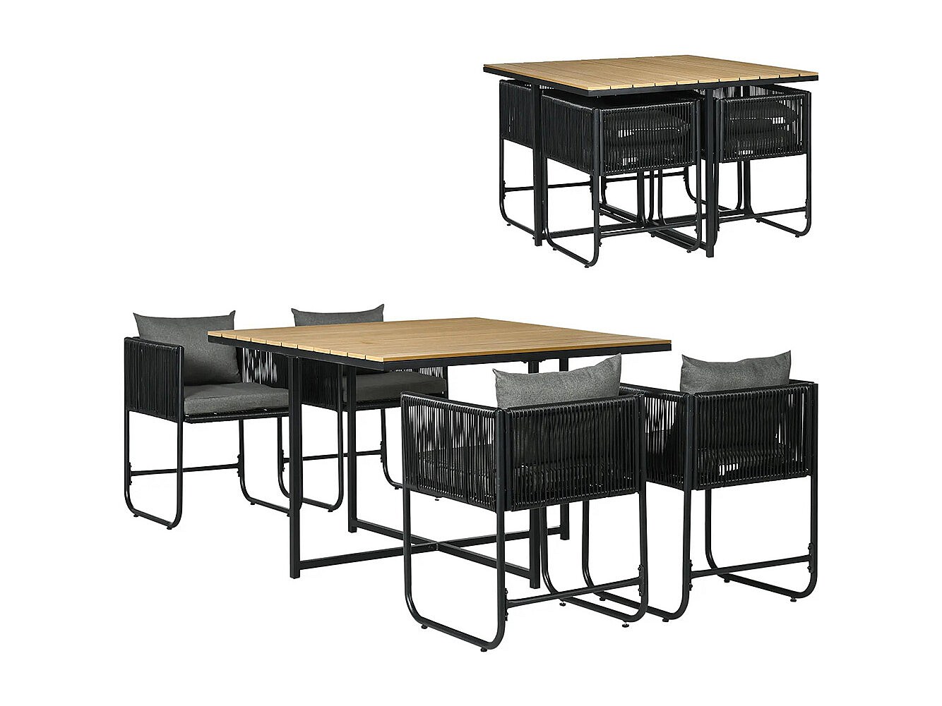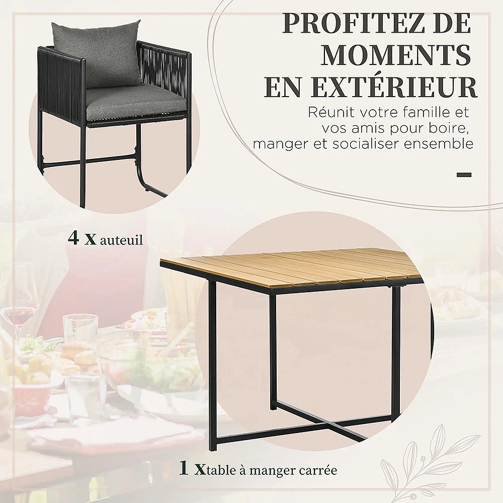 Salon de jardin ensemble 5 pièces avec 1 table et 4 fauteuils 8 coussins table en composite plateau aspect bois naturel