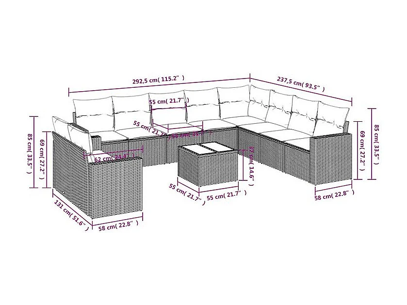 Salon de jardin et coussins 11 pcs marron résine tressée