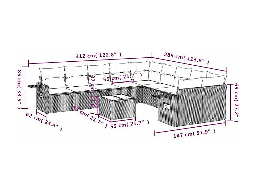 Salon de jardin et coussins 11 pcs marron résine tressée