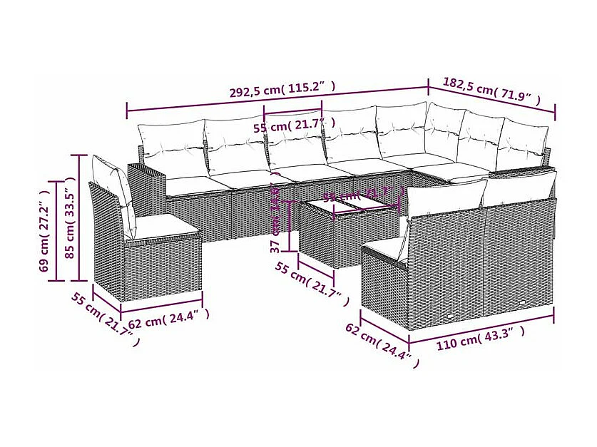 Salon de jardin et coussins 11 pcs marron résine tressée