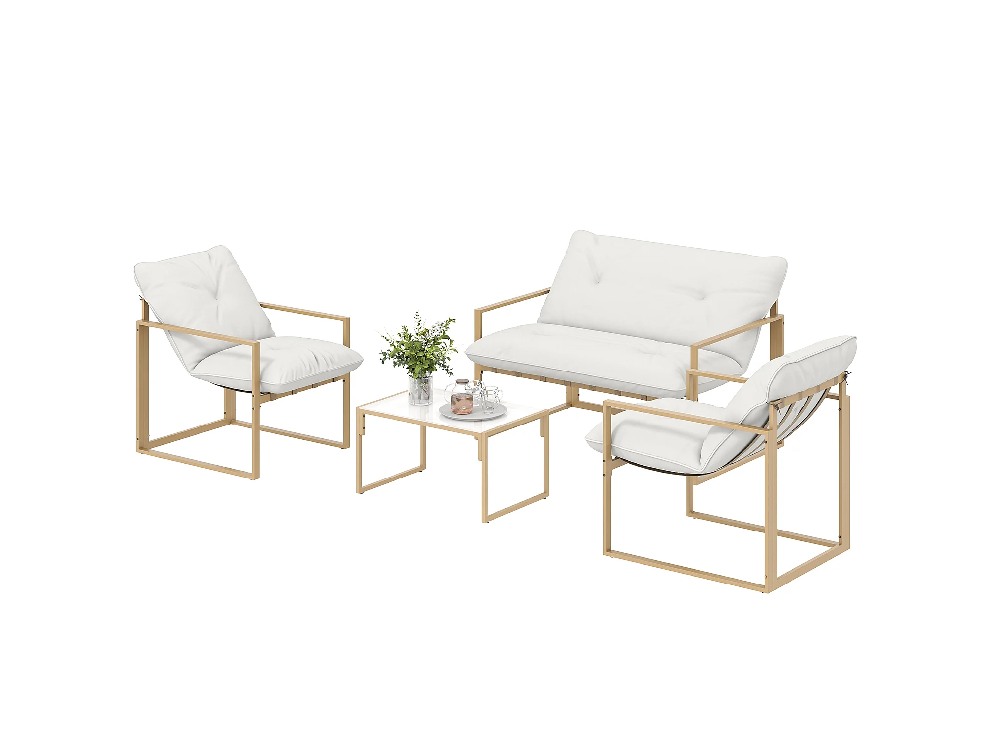 Salon de jardin extérieur 4 pièces avec coussins ultra-épais 15cm - canapé 2 places avec table basse et 2 fauteuils, cadre acier kaki