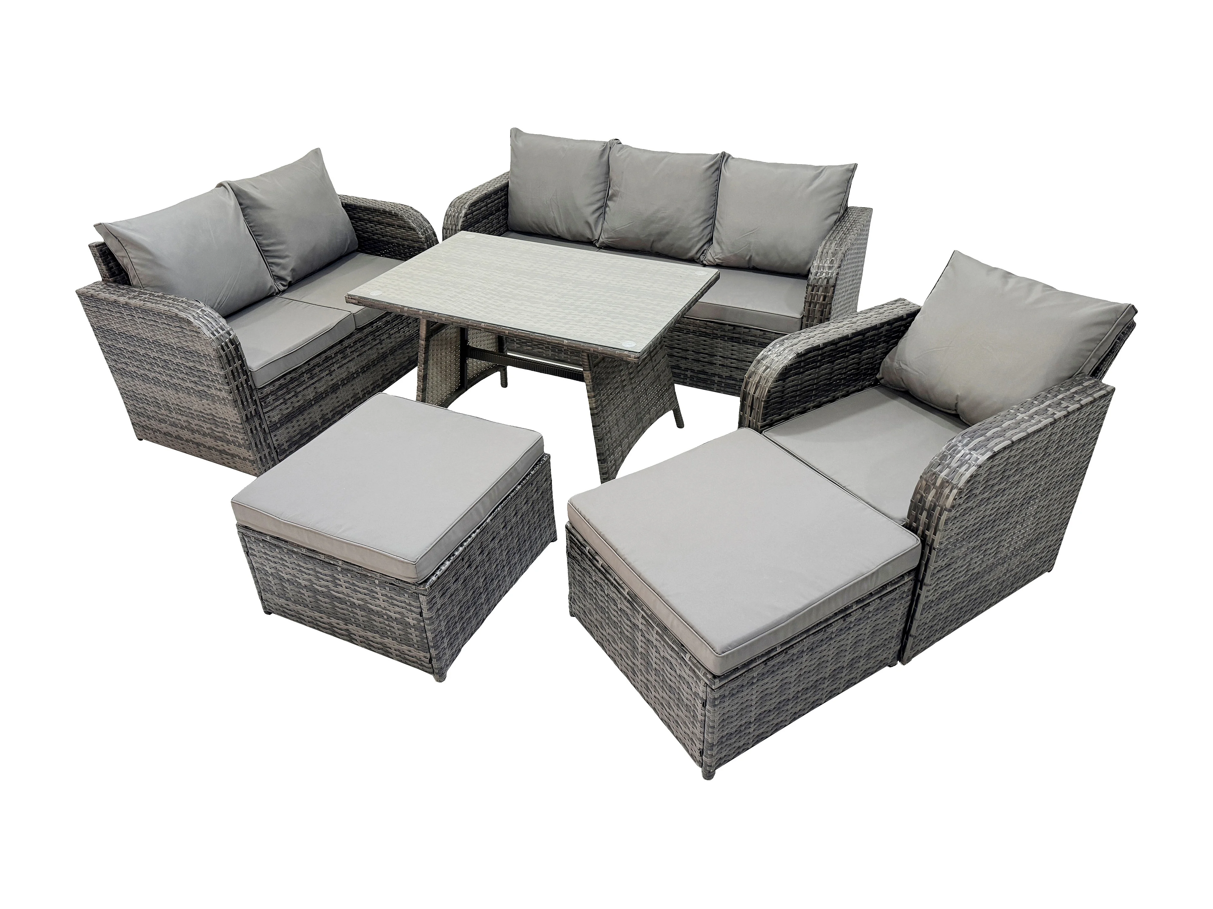 Salon de jardin exterieur 8 places Table à manger rectangulaire 2 Grand tabourets Canapé d'amour Chaise inclinable Gris foncé mixte