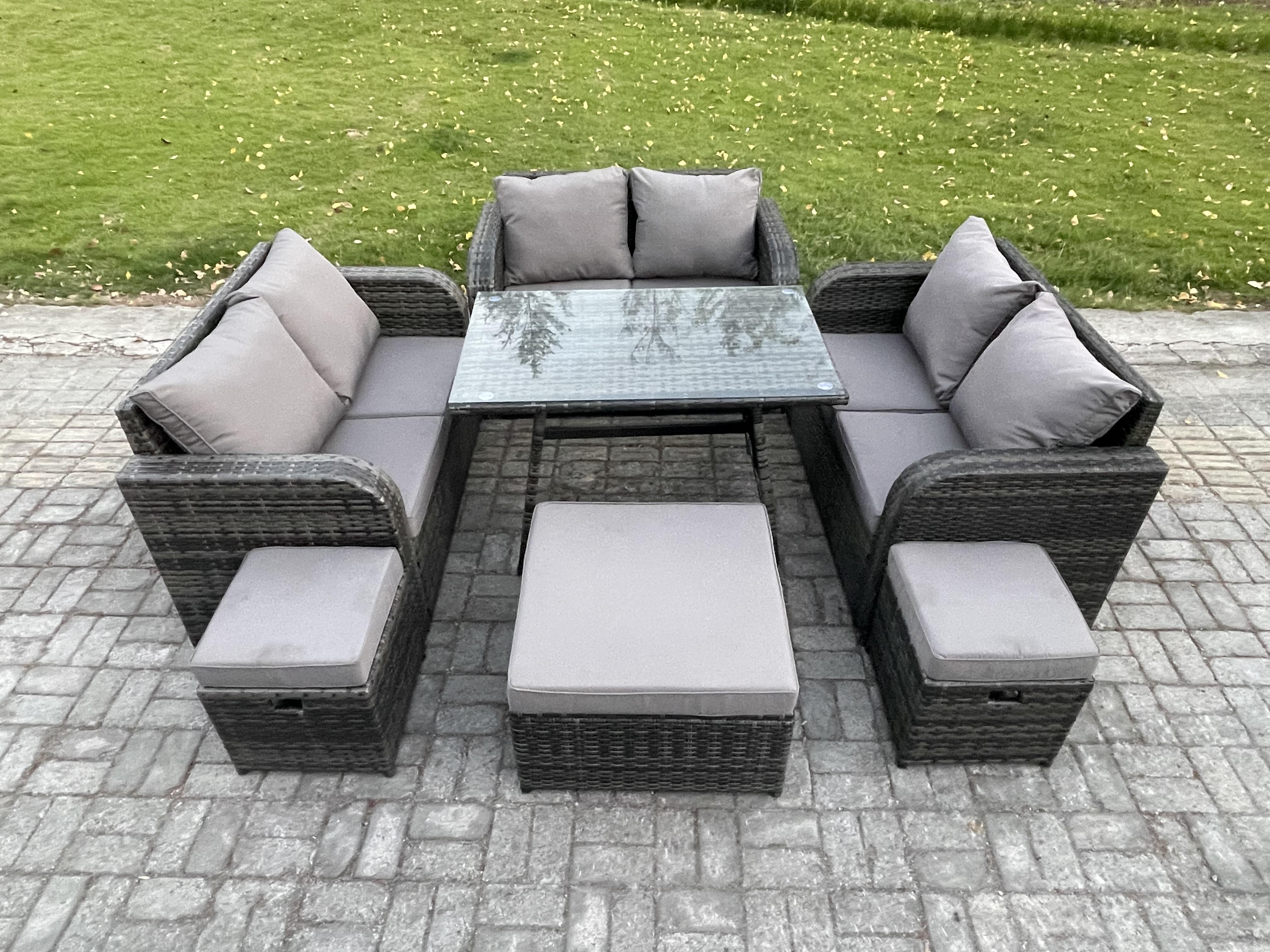 Salon de jardin exterieur 9 places avec Canapé d'amour Table à manger rectangulaire 3 Tabourets Gris foncé mixte
