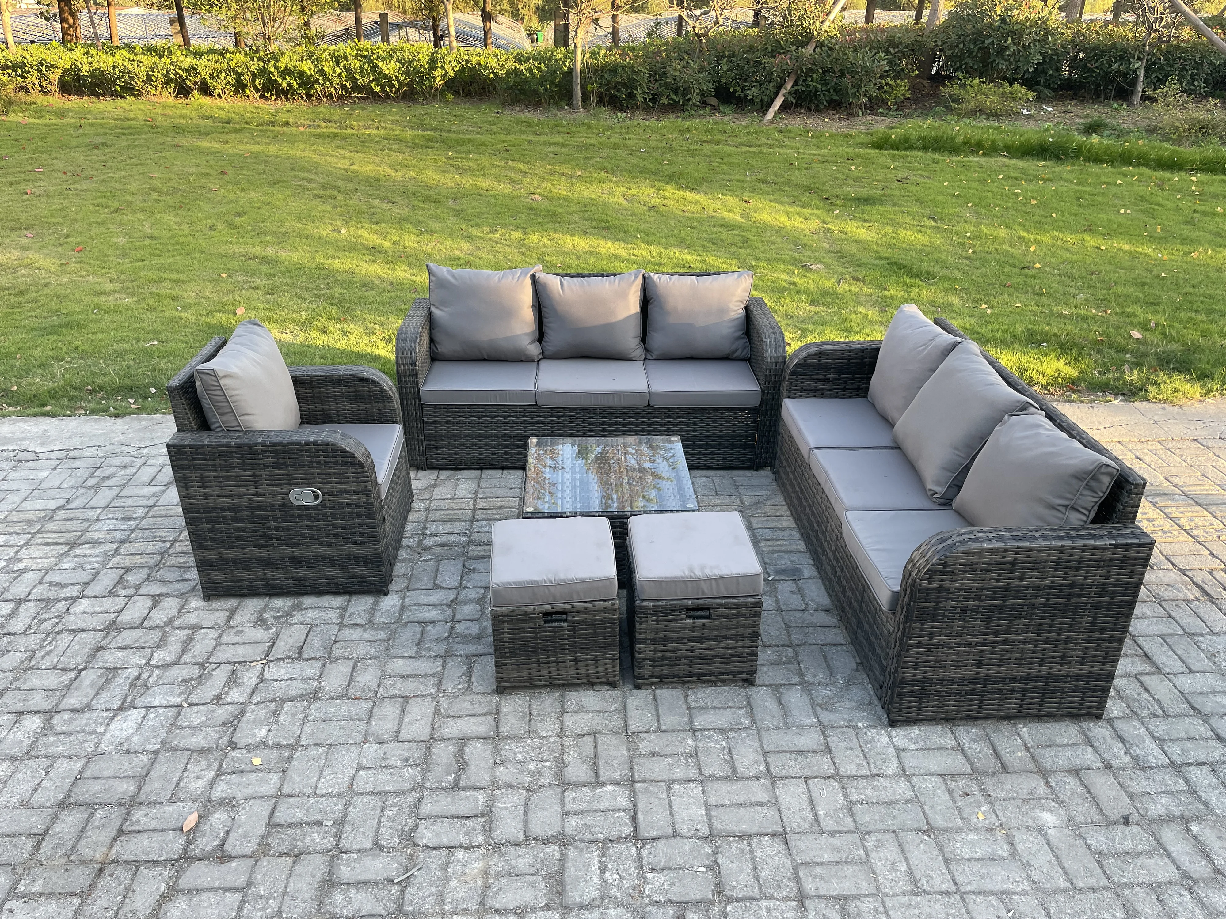 Salon de jardin exterieur avec Canapés Table basse carrée Chaise inclinable 2 Petits tabourets Gris foncé mixte