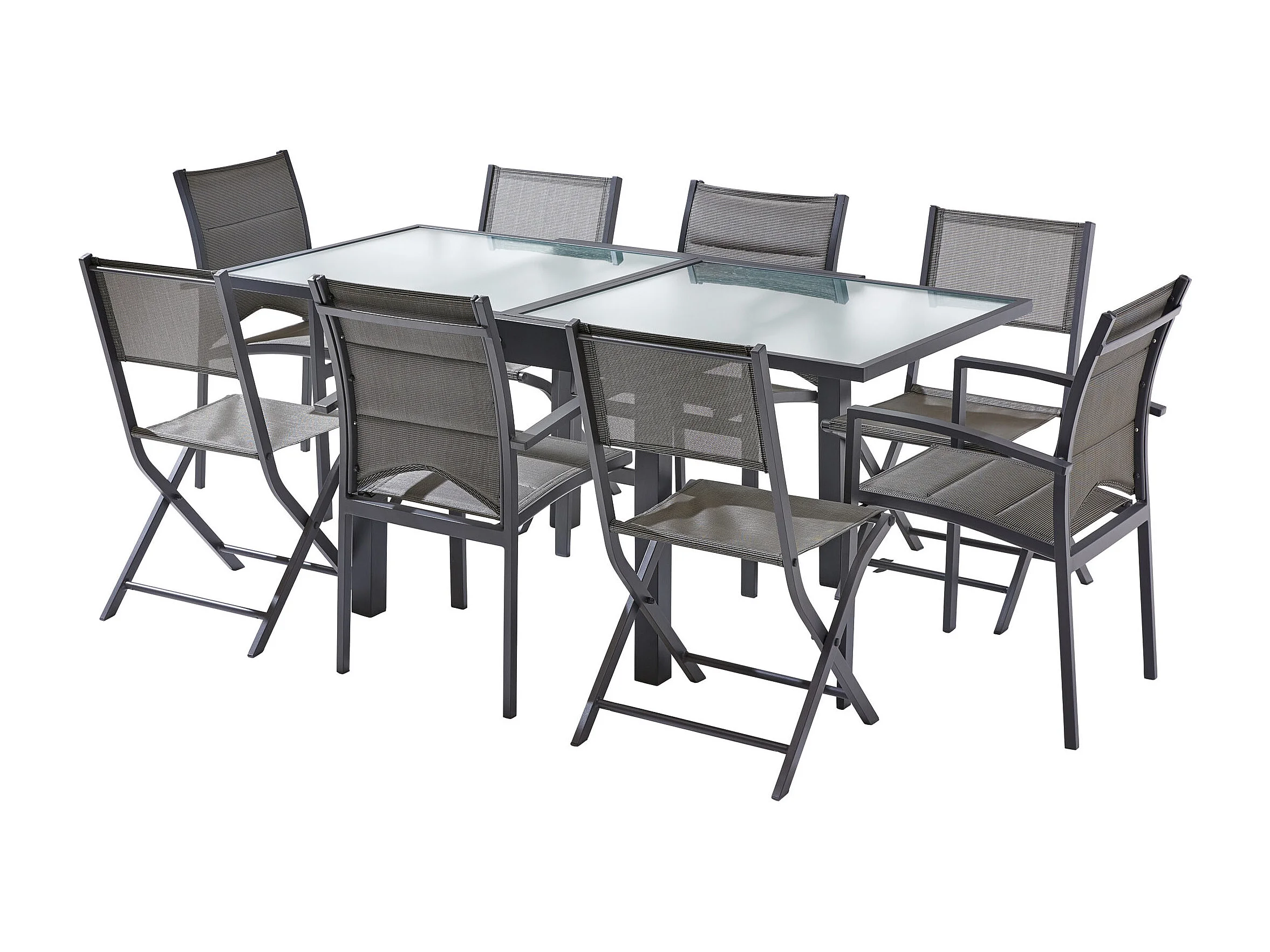Ensemble MODULO 4/8p en aluminium gris et verre modulable et 4 fauteuils aluminium et assise en textilène