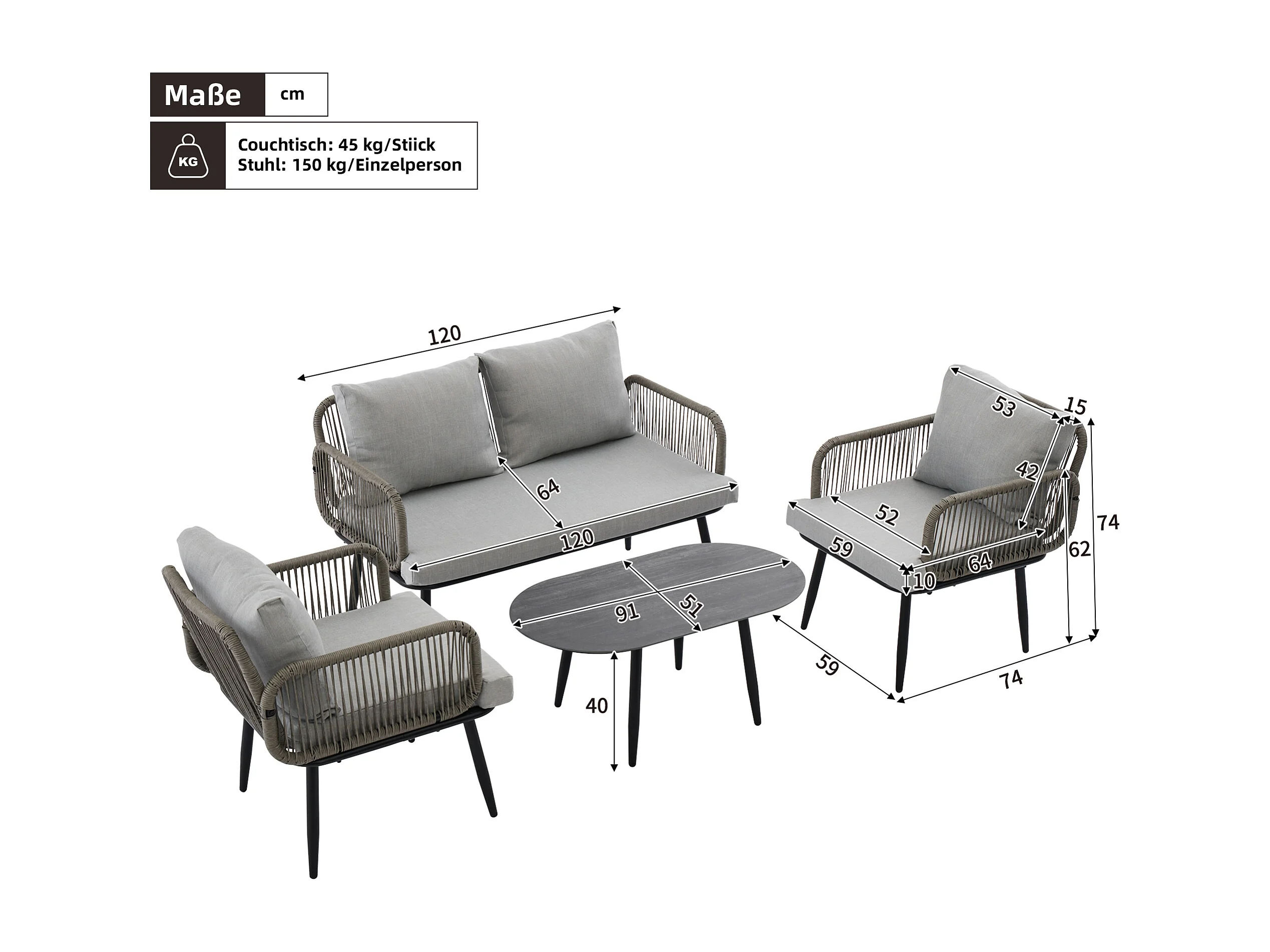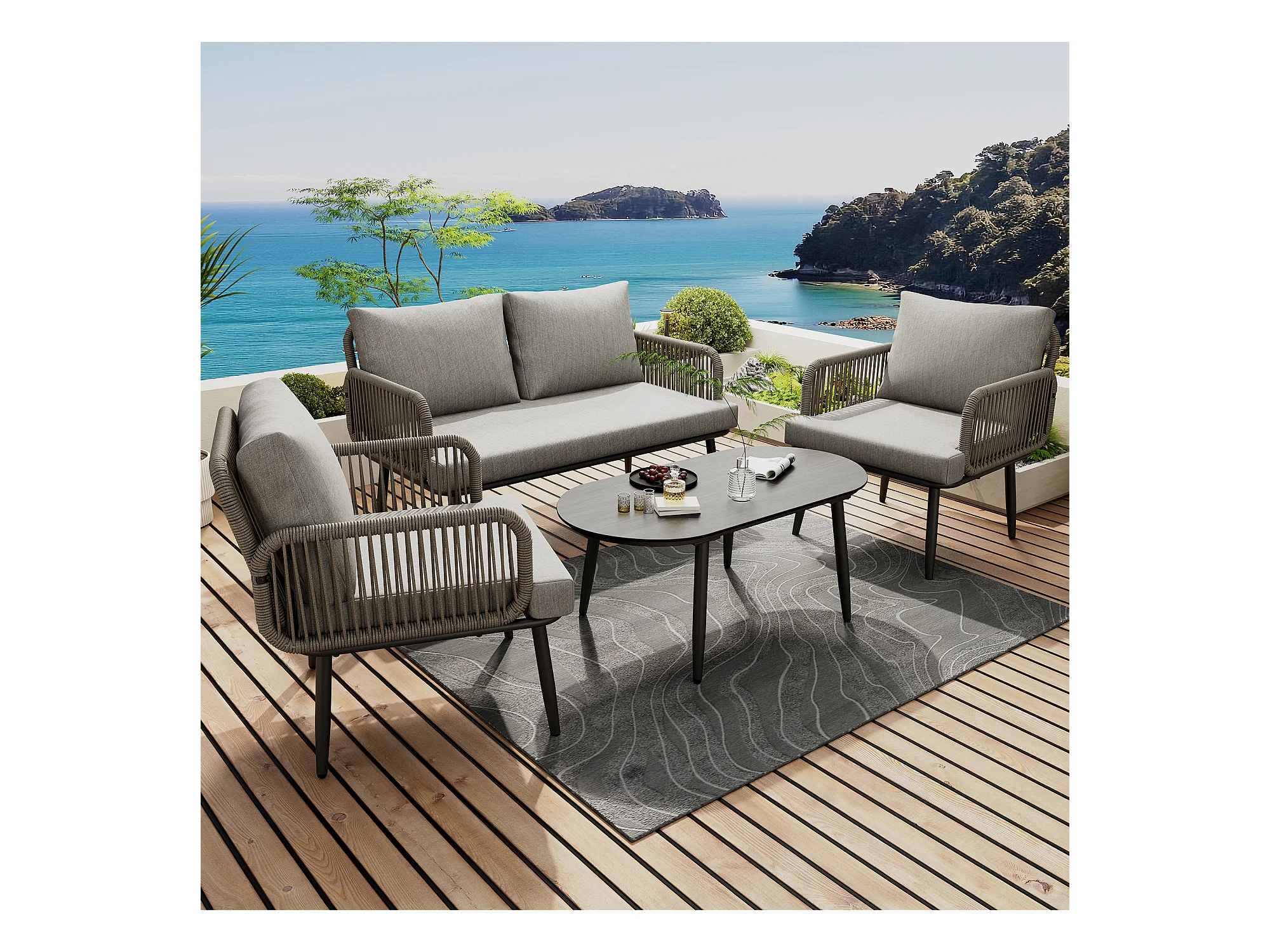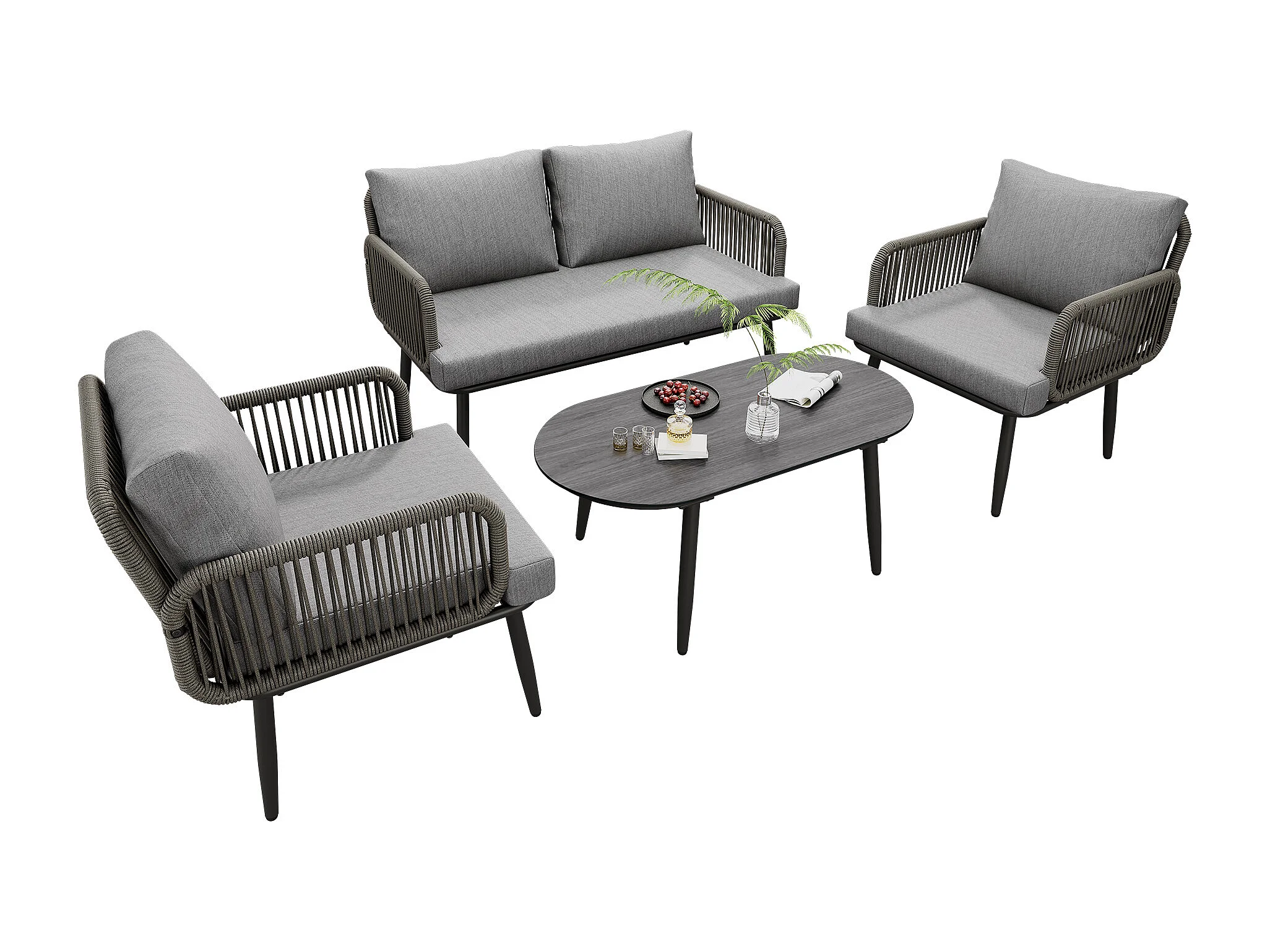 Salon de jardin modulable 4 places en acier galvanisé : 1 canapé 2 places + 2 fauteuils + table basse ovale - Gris