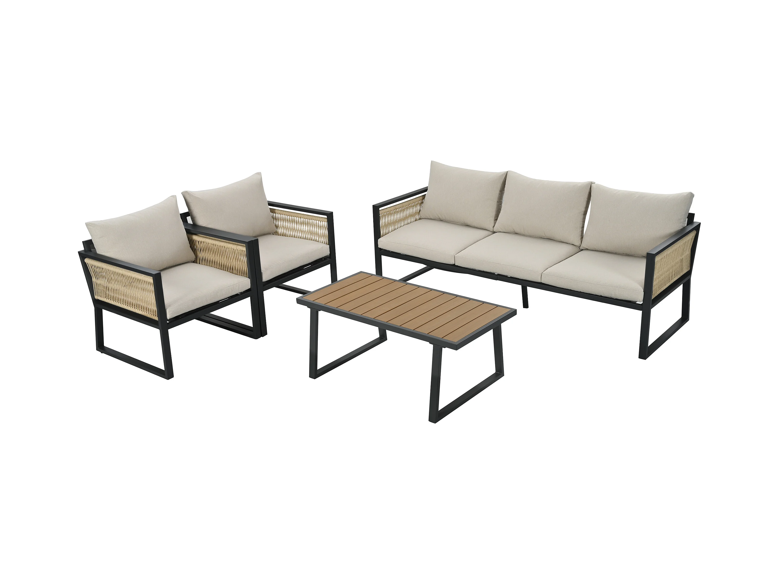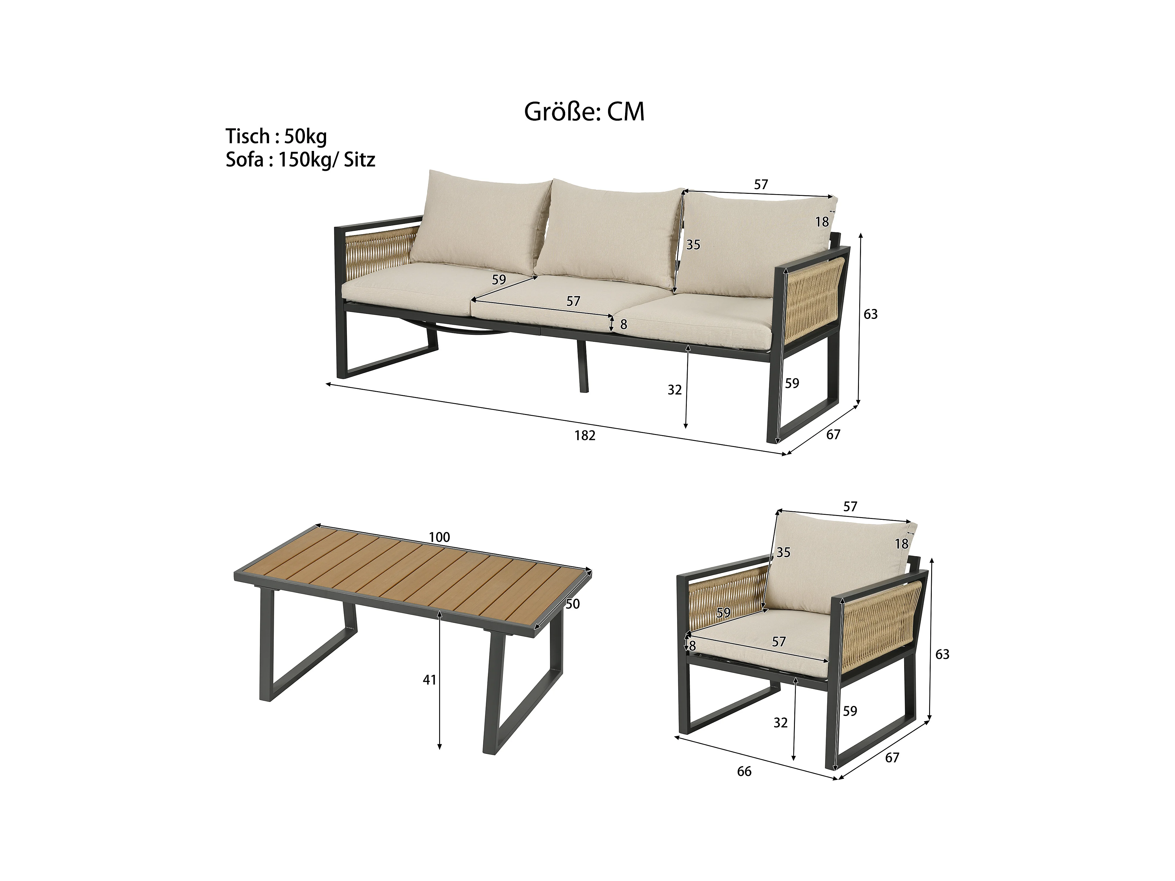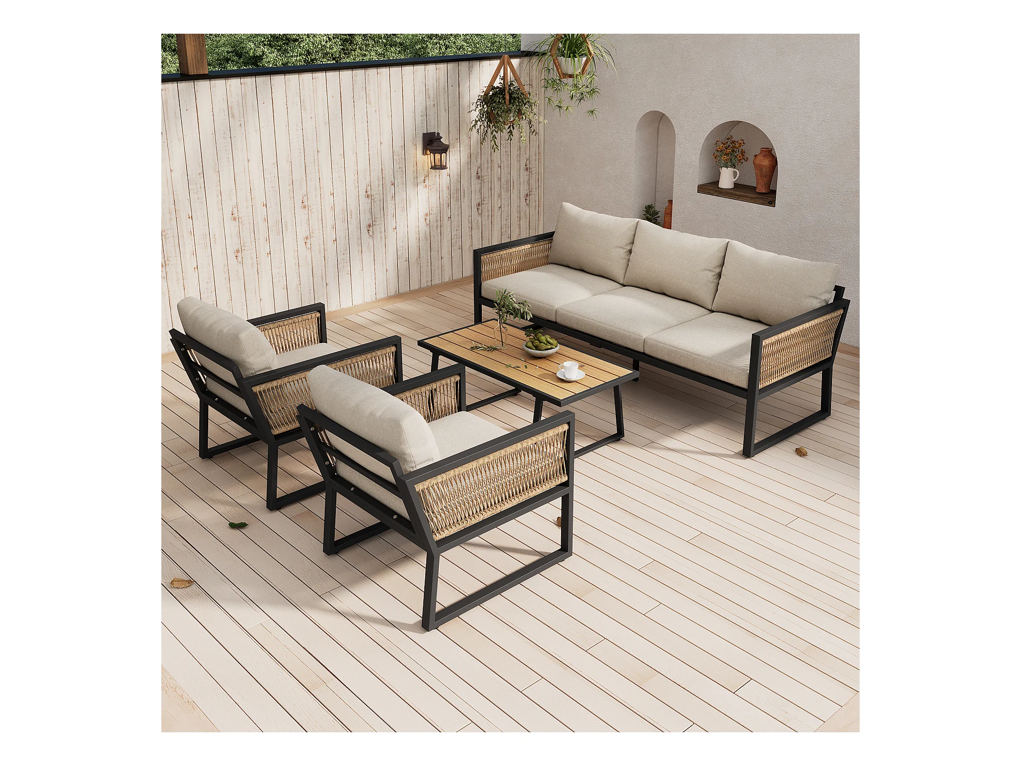 Salon de jardin modulable 5 places en acier galvanisé : 1 canapé 3 places + 2 fauteuils + table basse rectangulaire - Beige