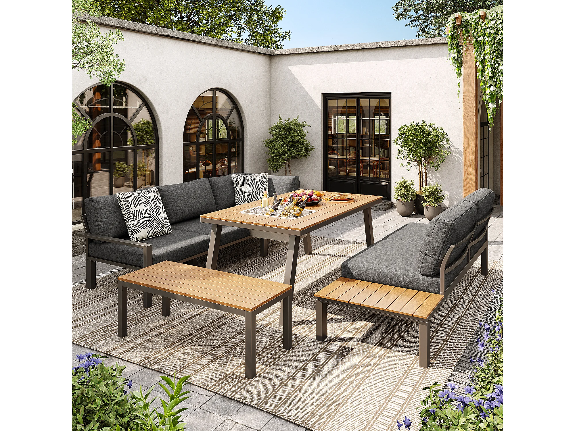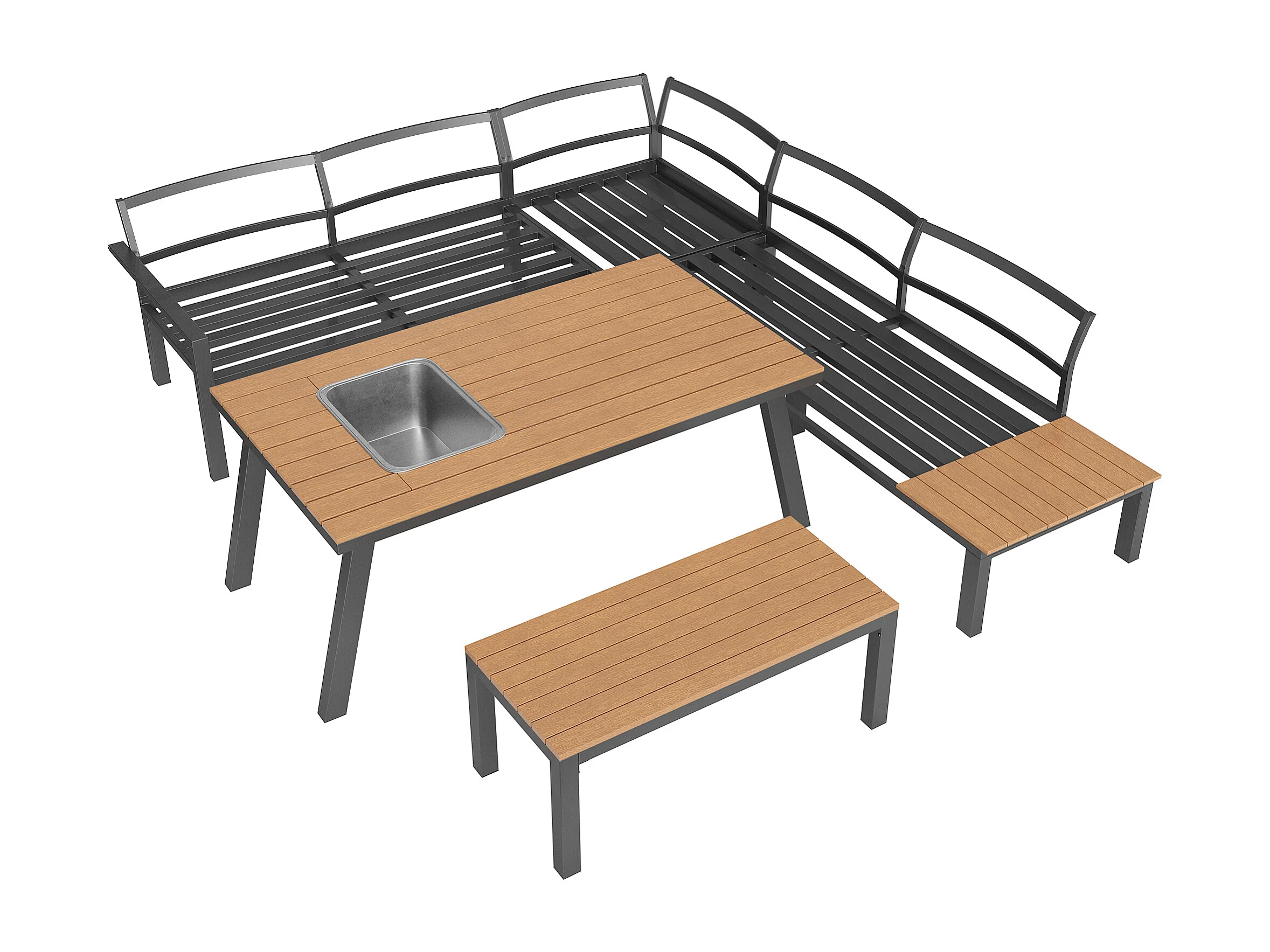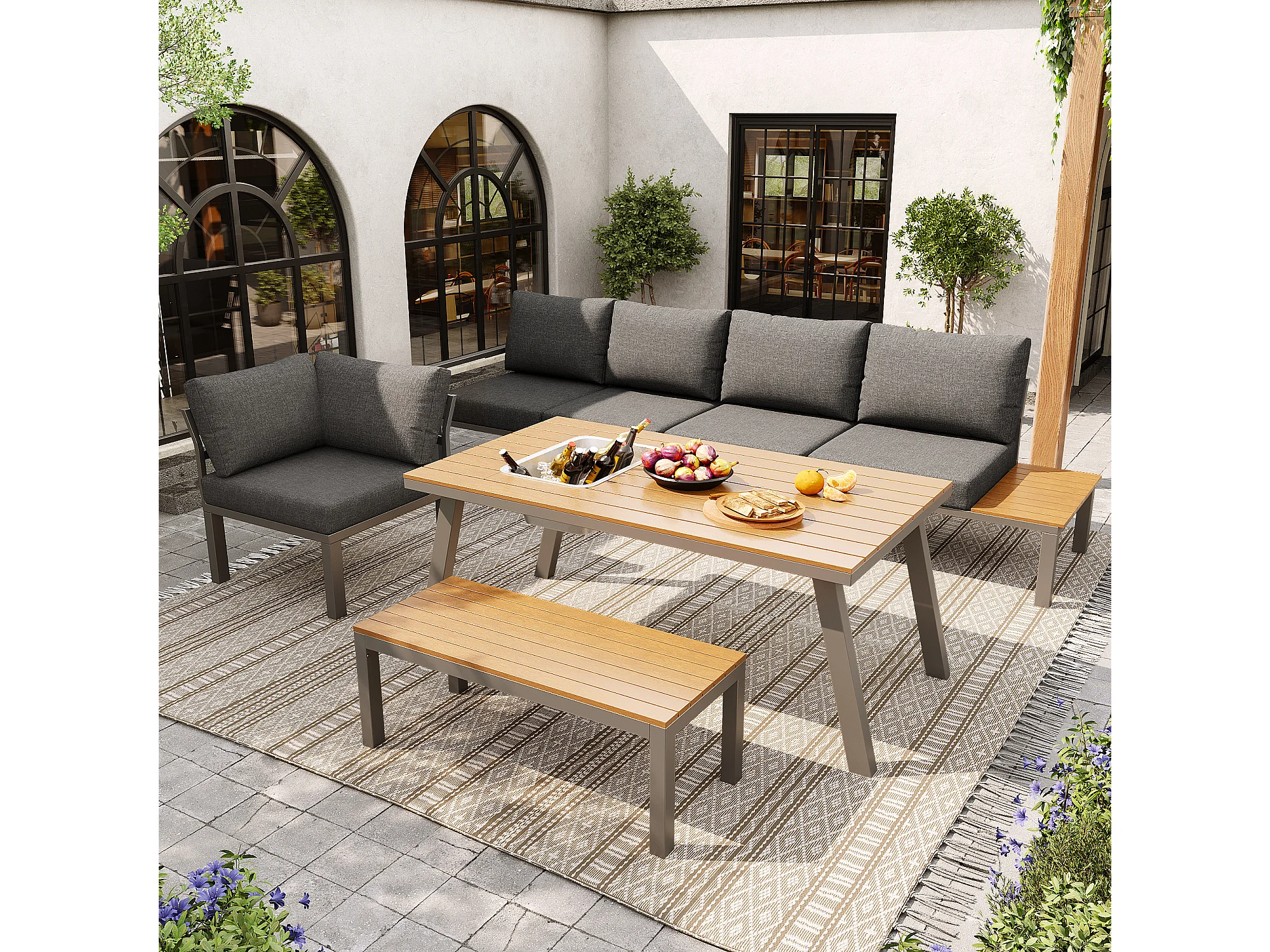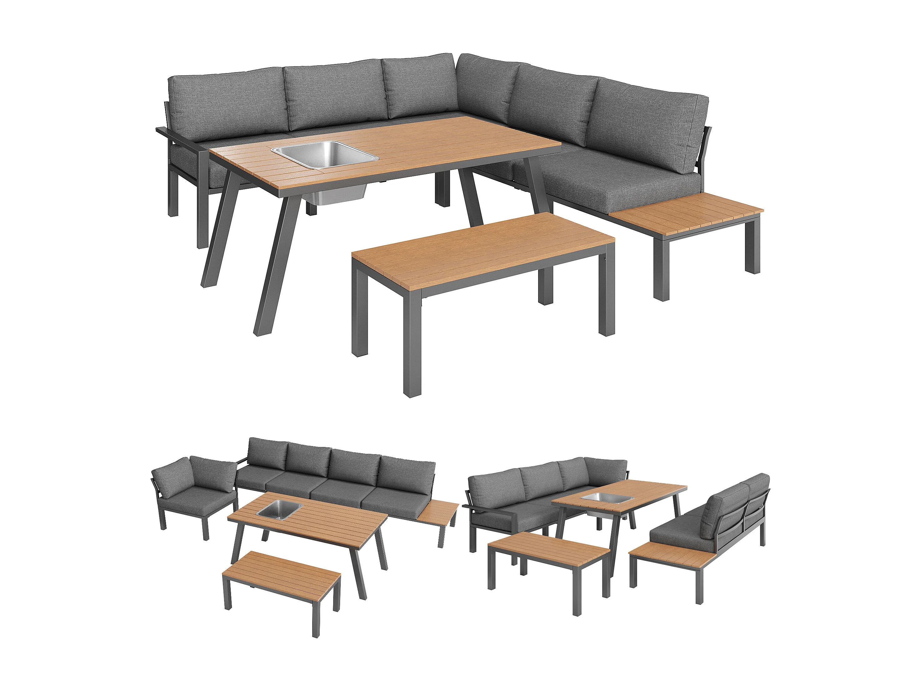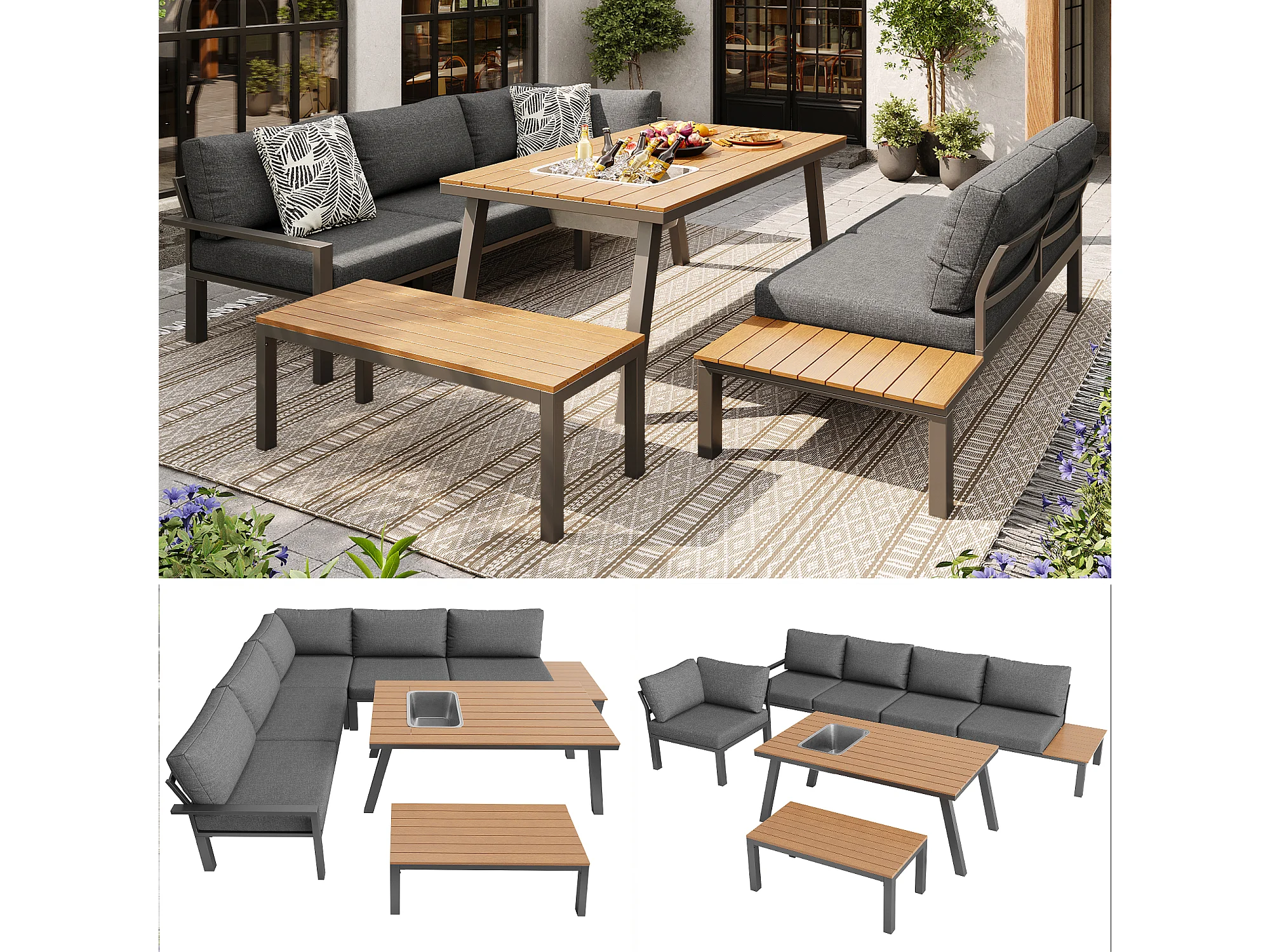 Salon de jardin modulable en fer galvanisé : 1 canapé d'angle 6 places + 1 banc + 1 table à manger - Gris + naturel