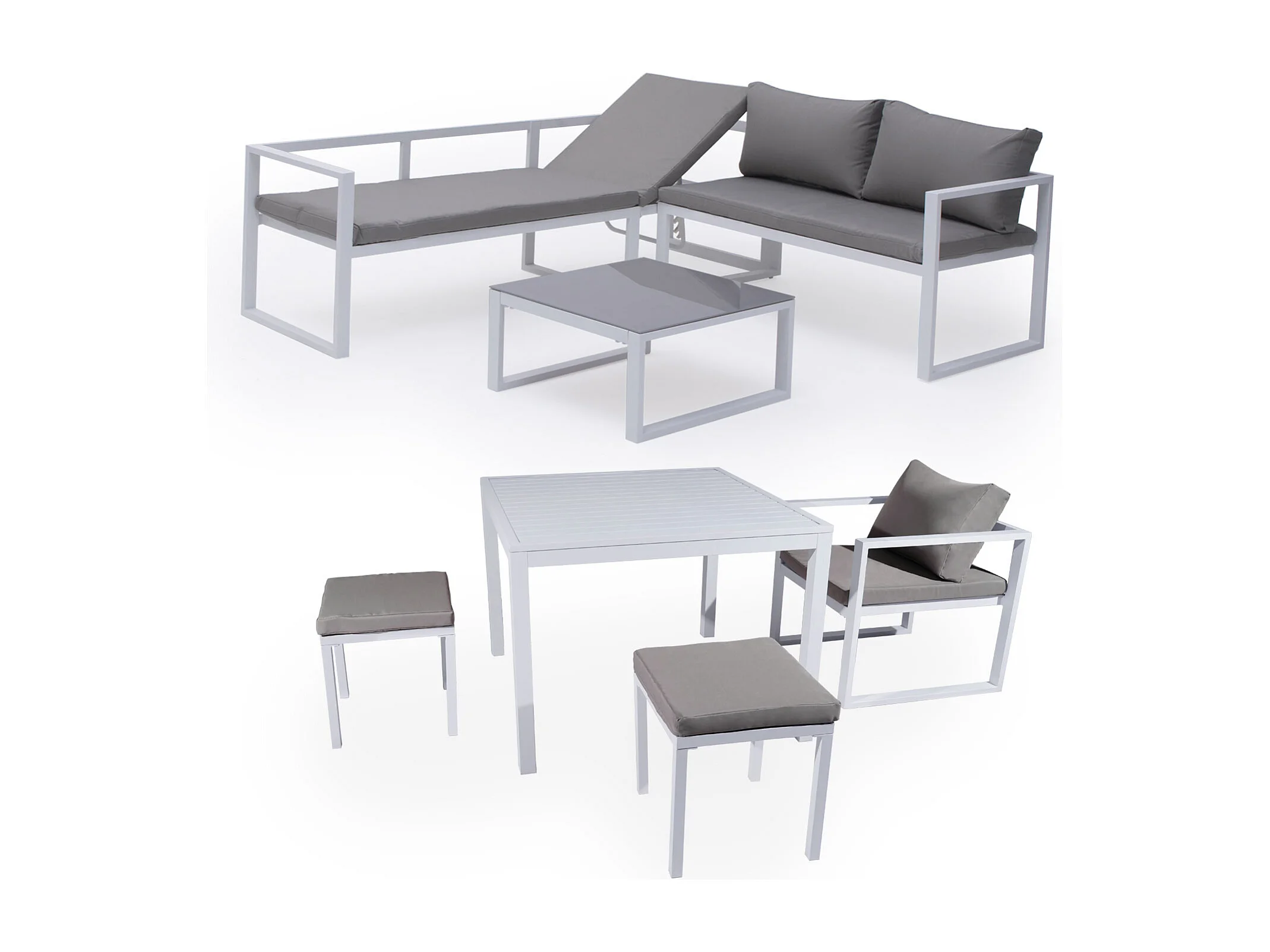 Salon de jardin modulable IBIZA en tissu gris 7 places - aluminium blanc - HAPPY GARDEN