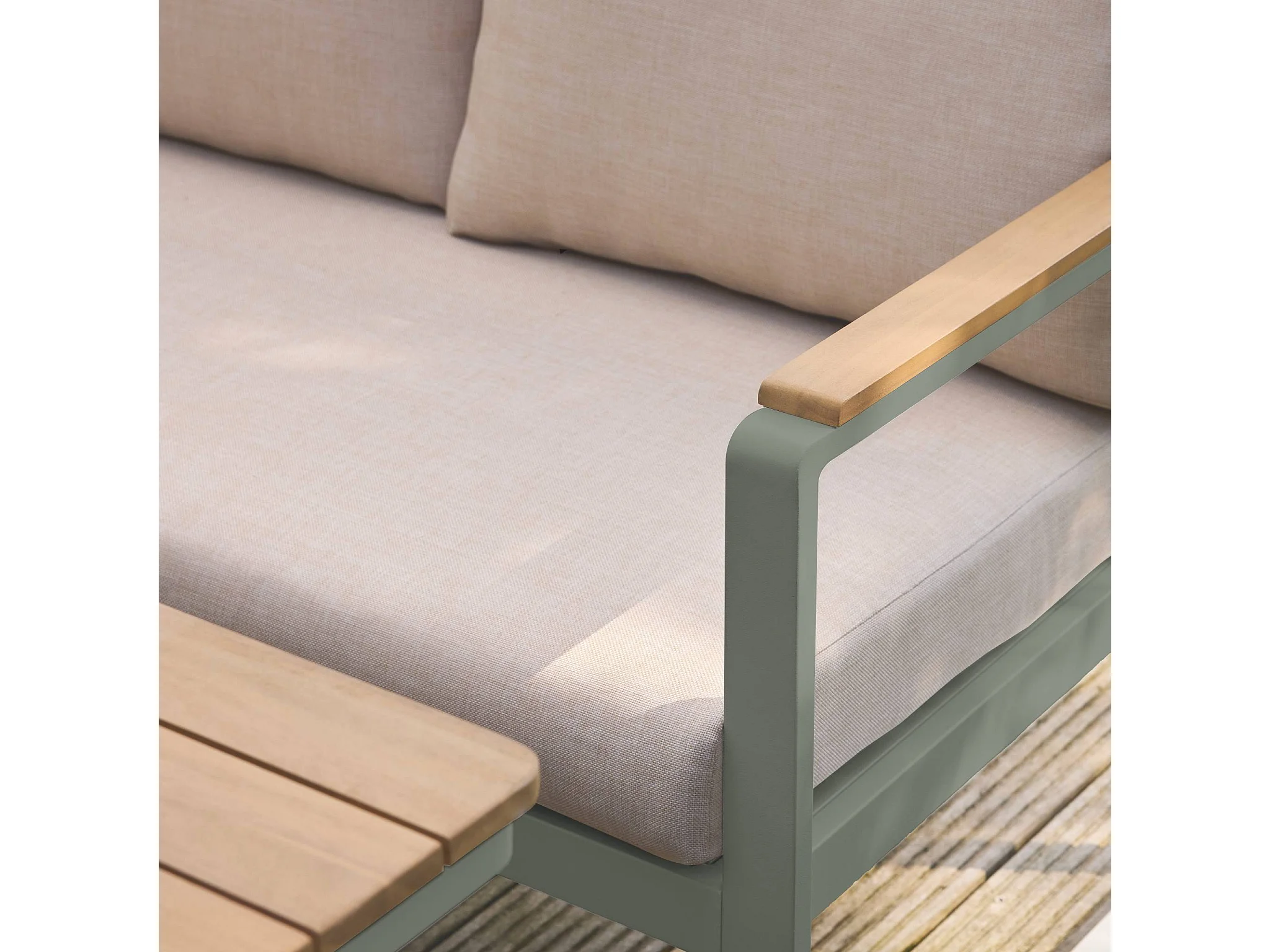 Salon de jardin PAMPAS 8 places en bois d'acacia et aluminium. coussins beiges en polyester. avec table rectangulaire