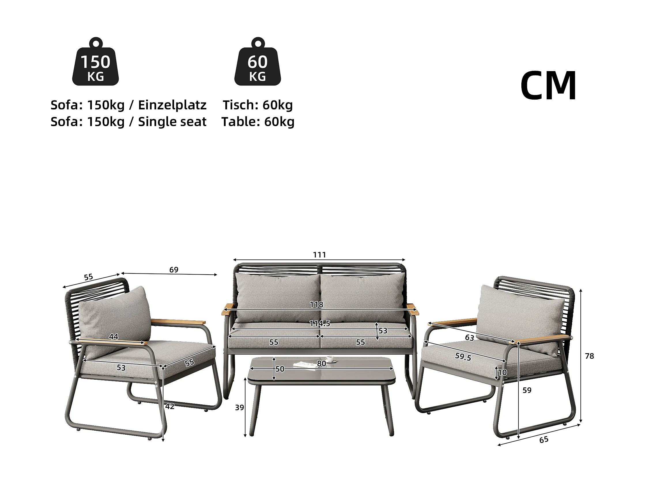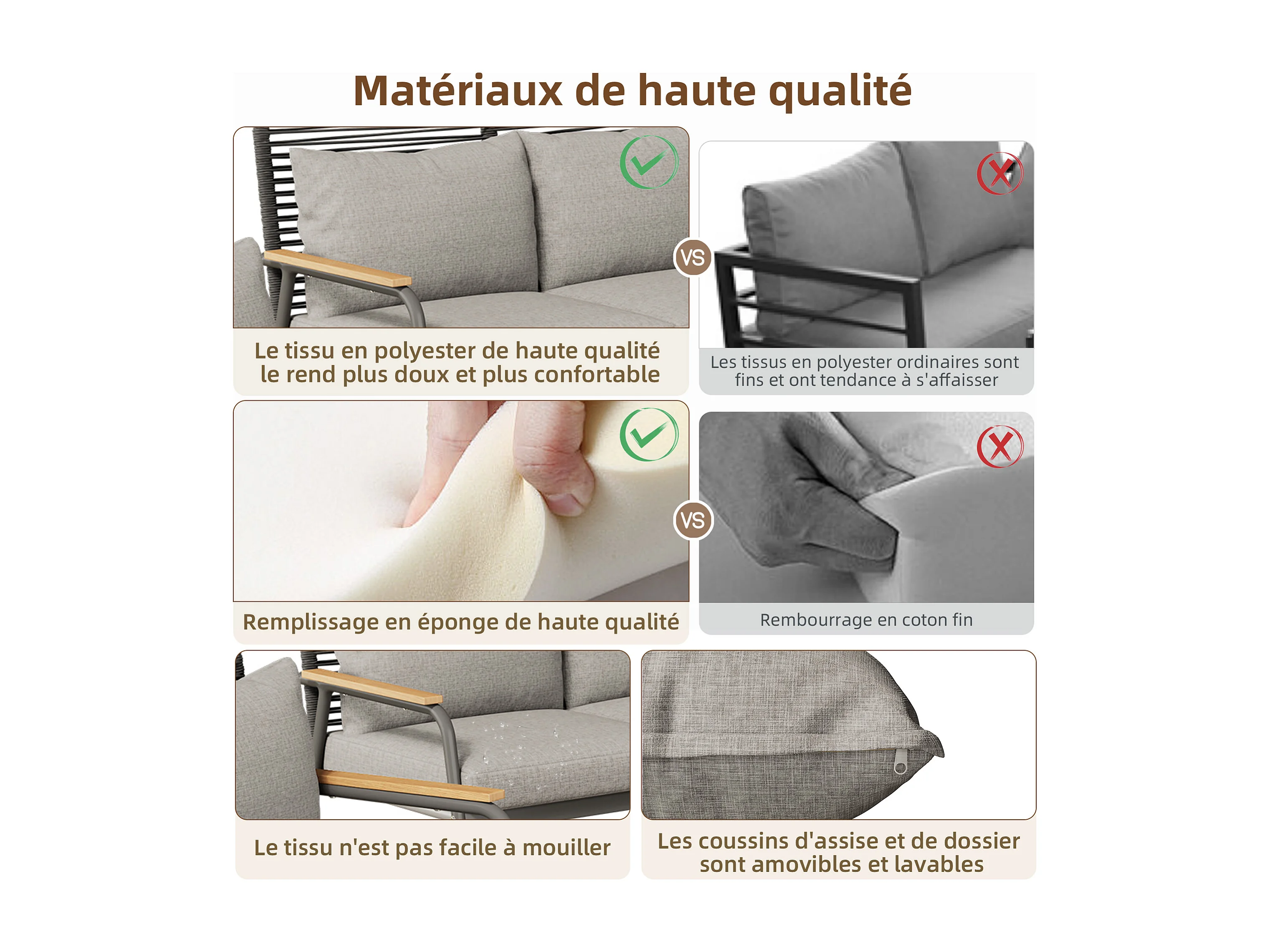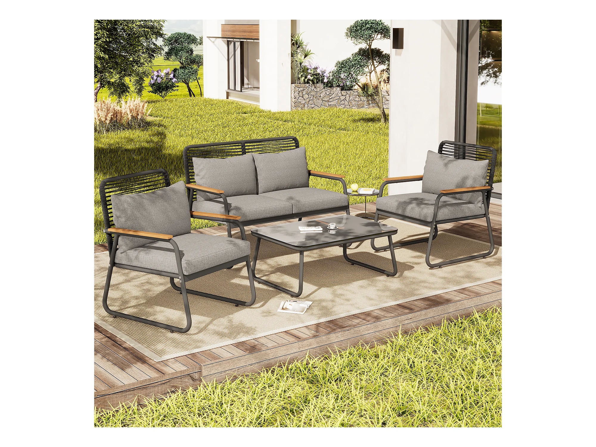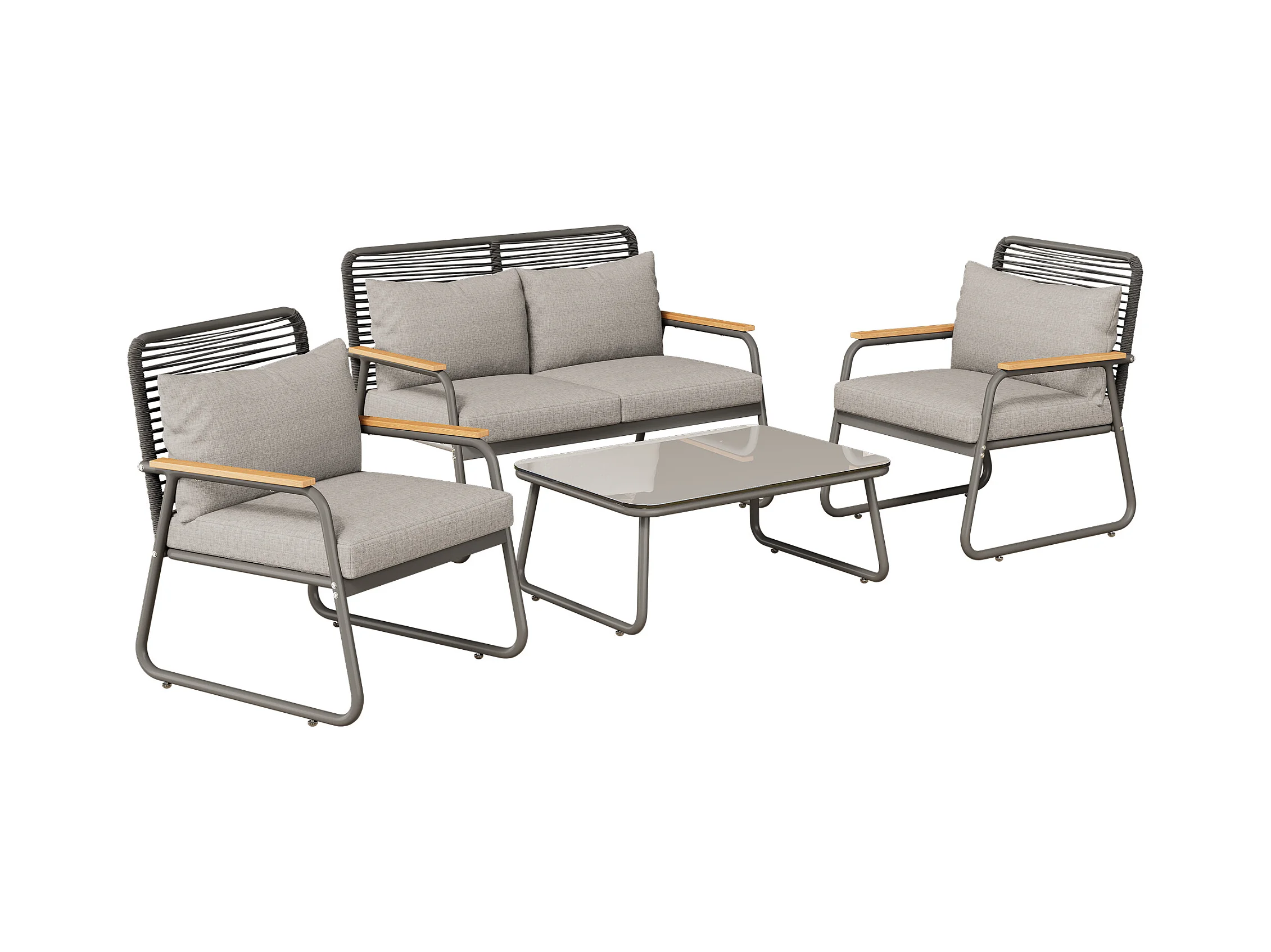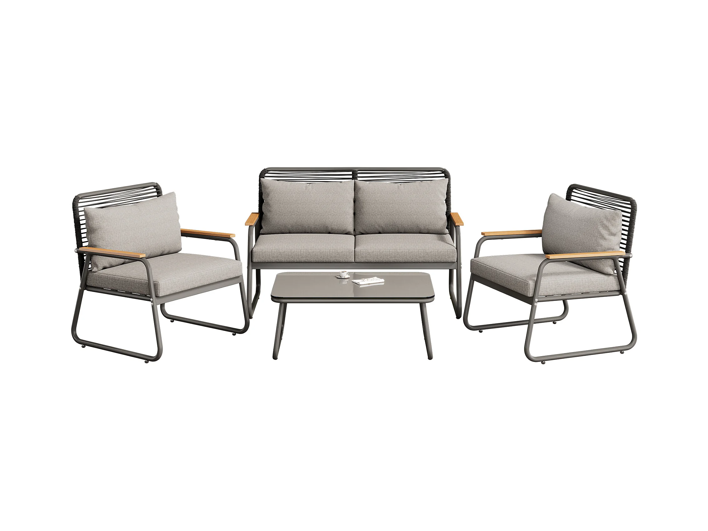 Salon de jardin pour 4 personnes, structure en fer galvanisé, pieds réglables, 1 canapé - 2 fauteuils et 1 table basse, gris