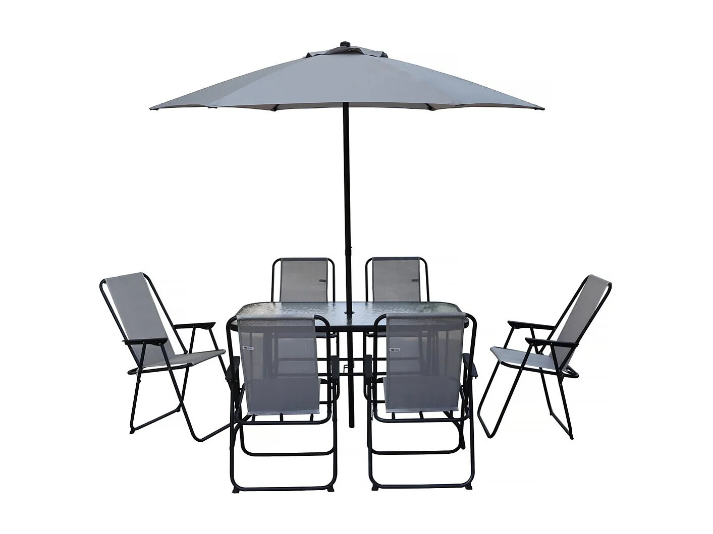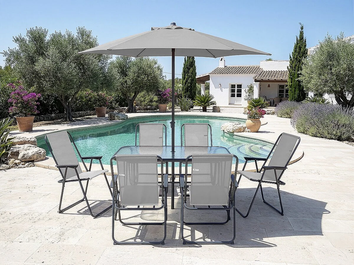 Salon de jardin repas avec parasol en métal "Convivia" - 6 places - Gris clair