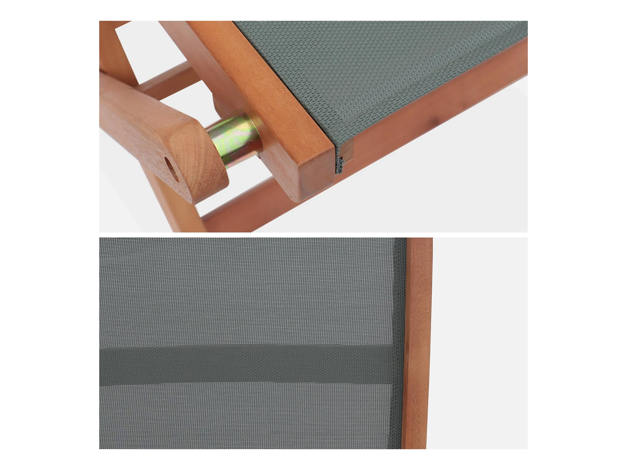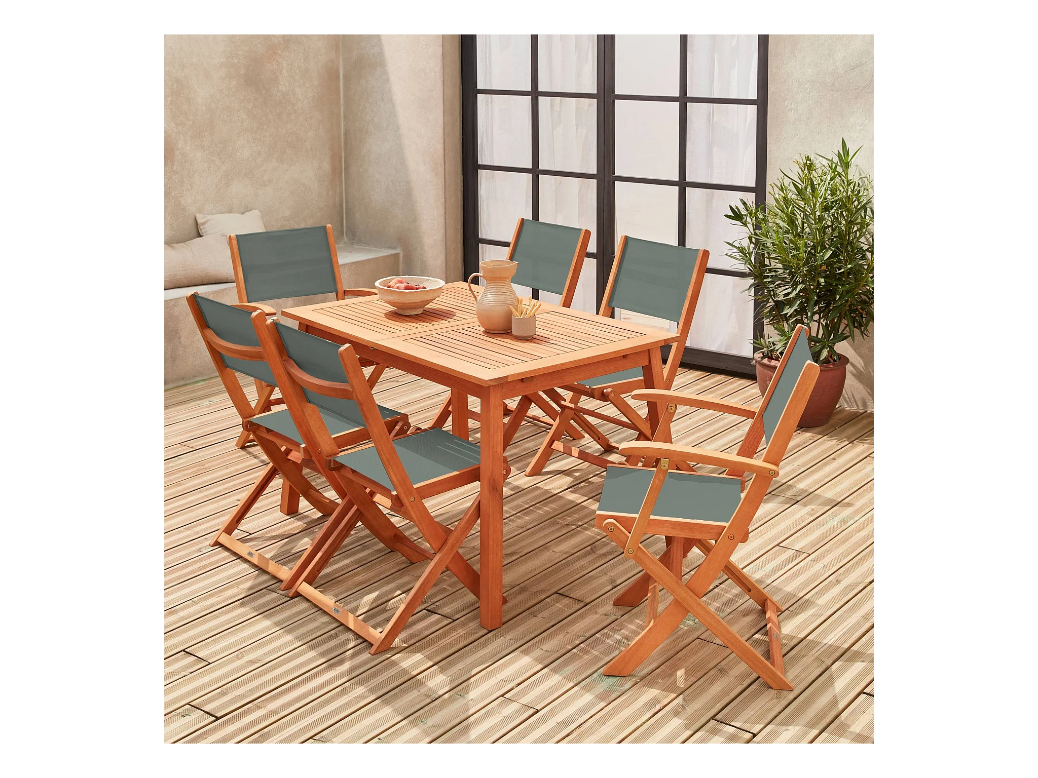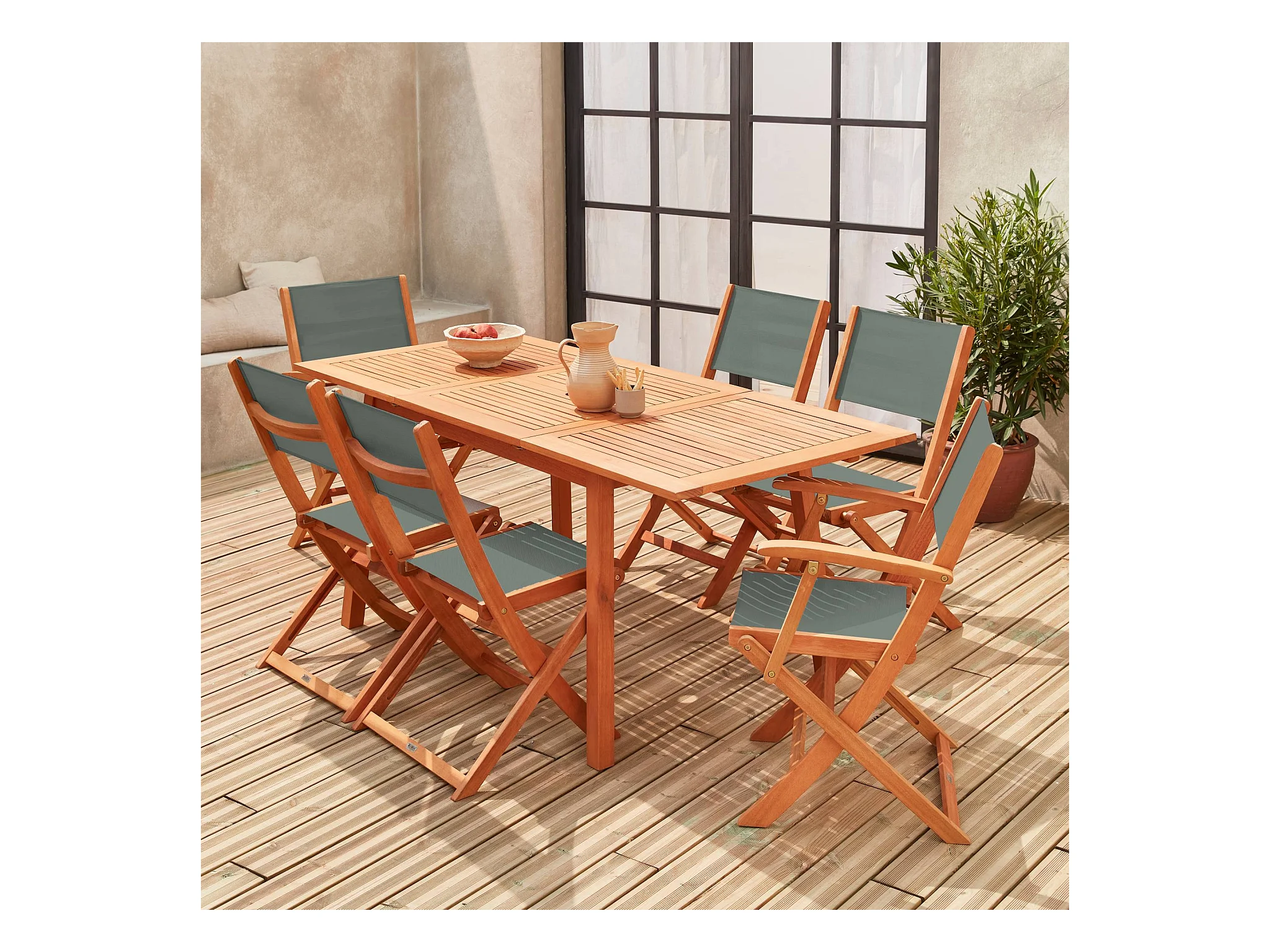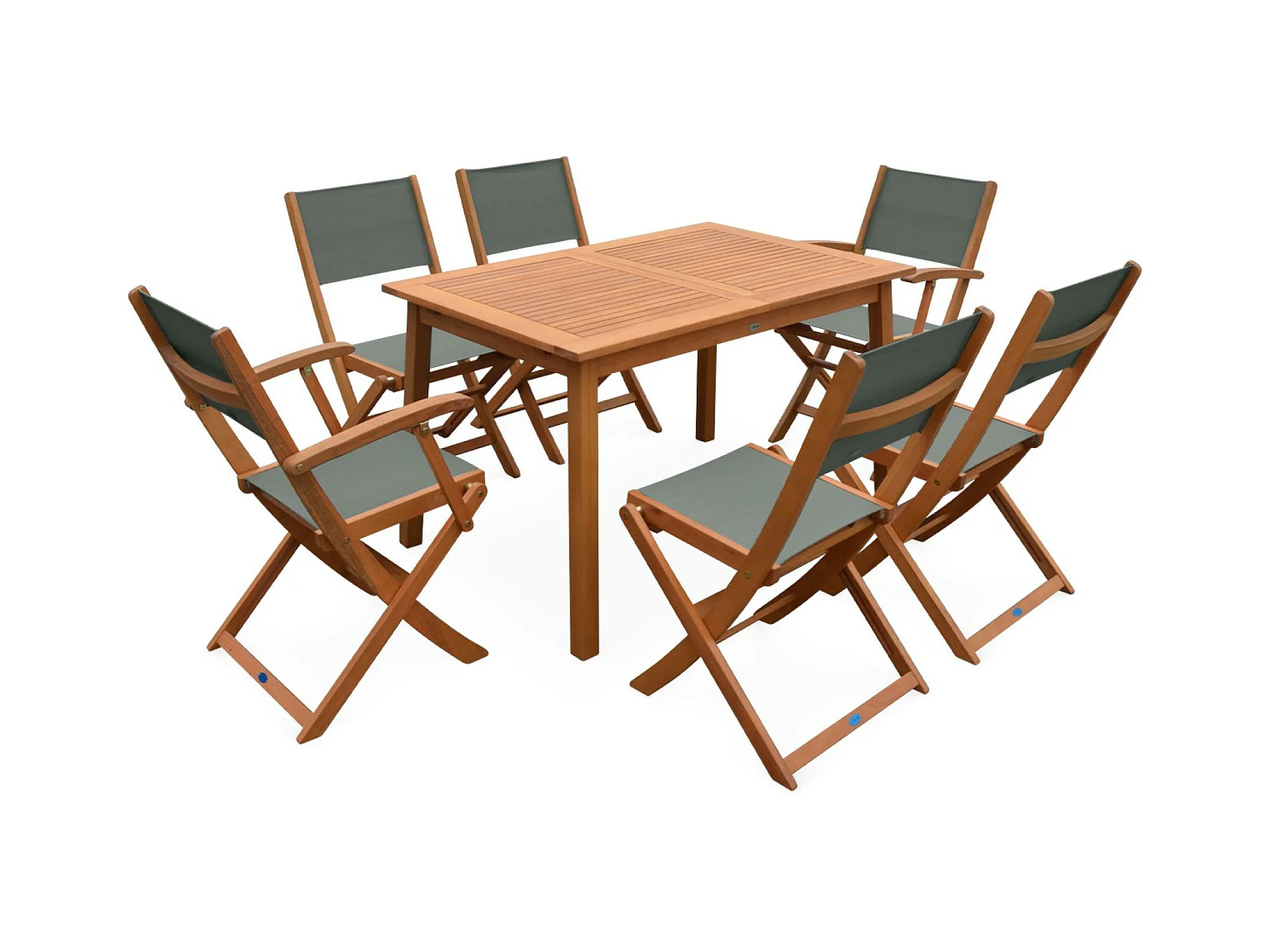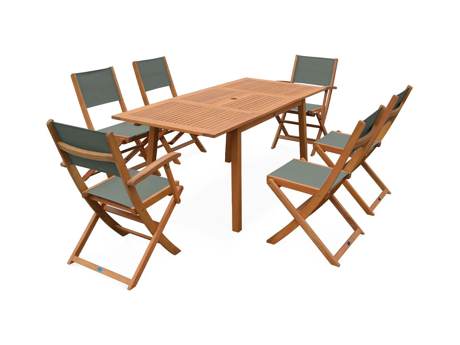 Salon de jardin savane extensible - Almeria - Table 120/180cm avec rallonge. 2 fauteuils et 4 chaises. en bois d'Eucalyptus huilé et textilène kaki