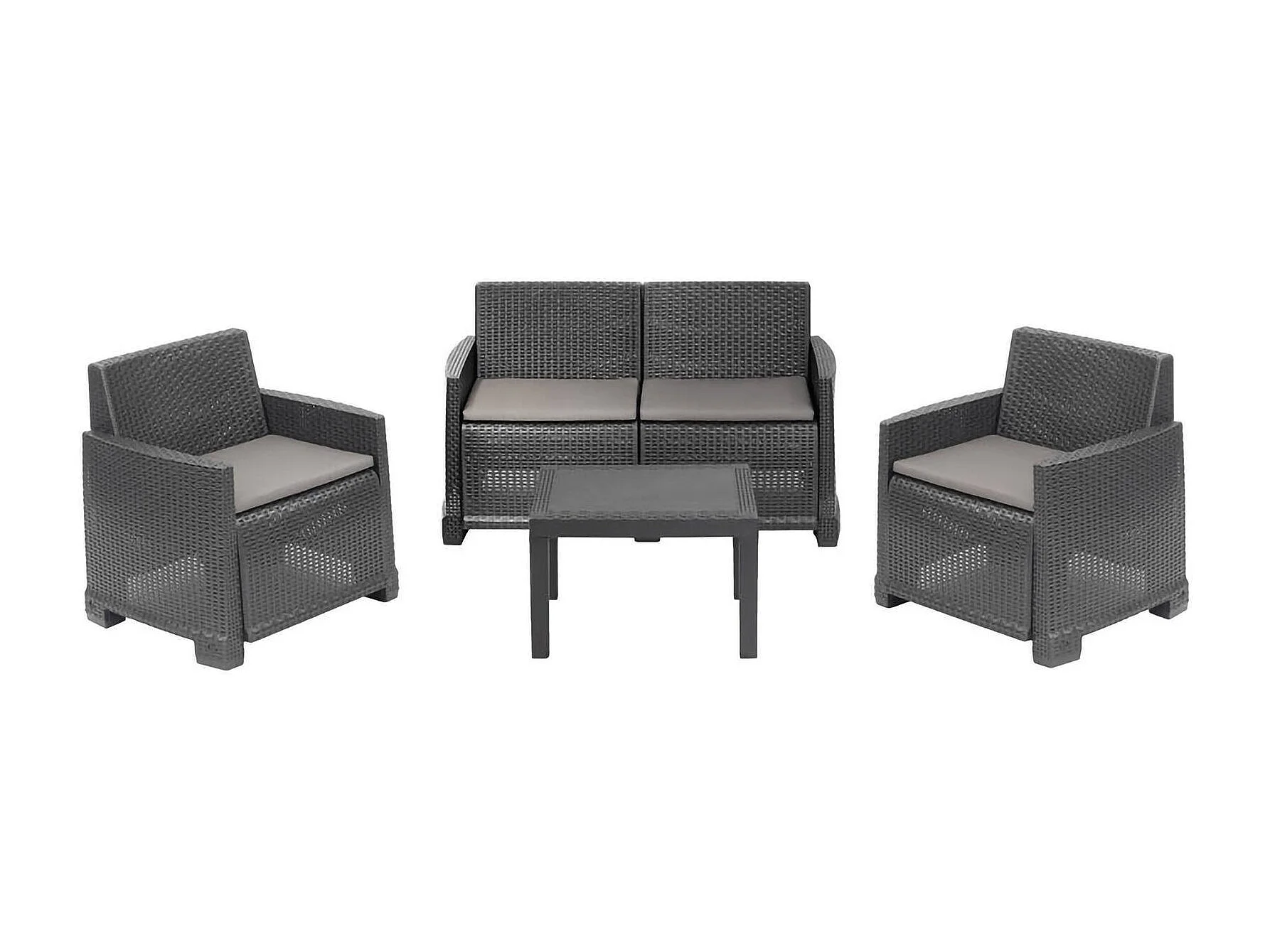 Salon d'extérieur Dbagnolin, Ensemble de jardin avec 2 fauteuils, 1 canapé et 1 table basse, Effet rotin avec coussins, 100% Made in Italy, Anthracite
