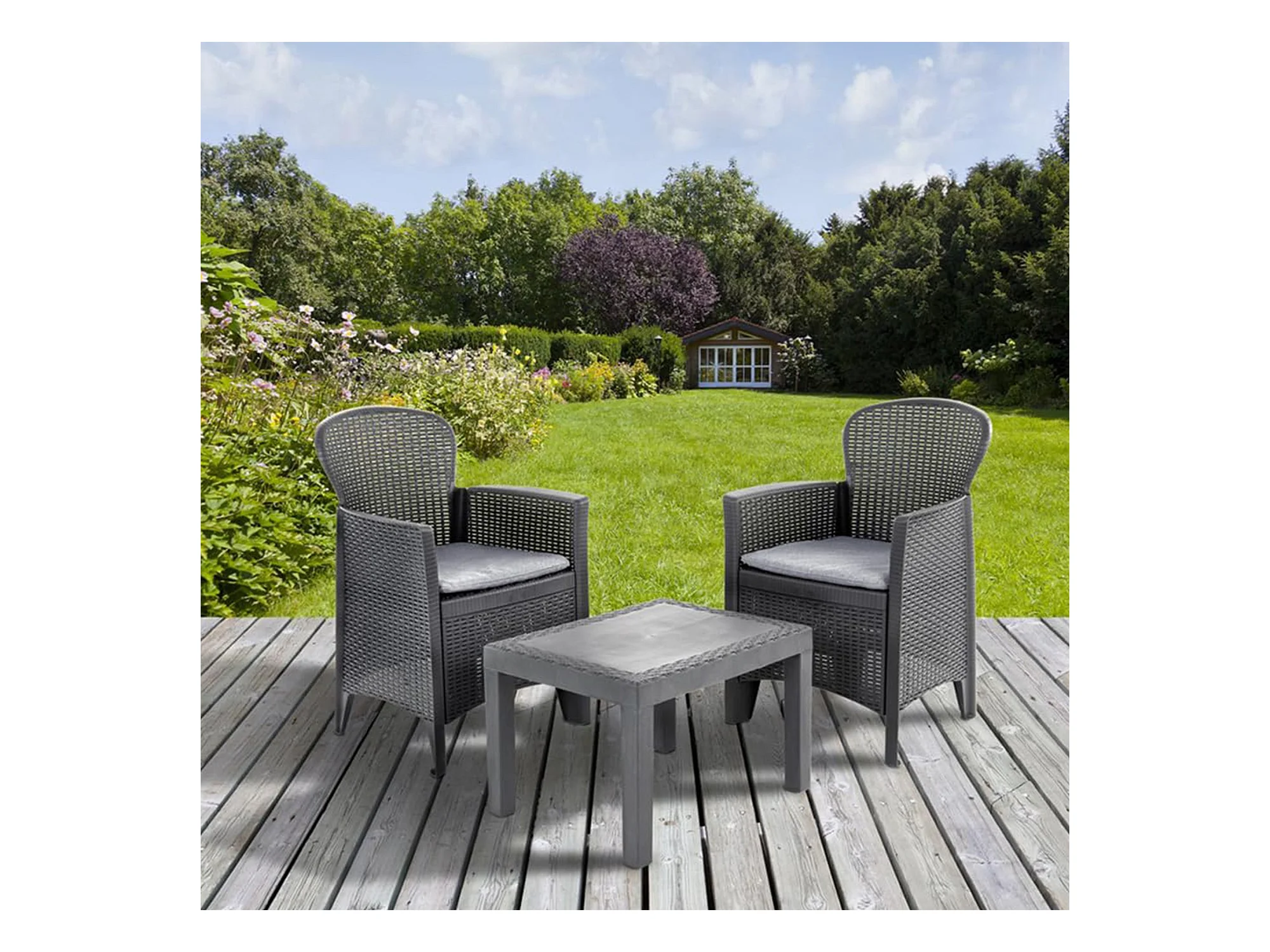 Set salon d’extérieur Dakain, Salon de jardin composé de 2 fauteuils et 1 table conteneur, Salon effet rotin, 100% Made in Italy, Anthracite