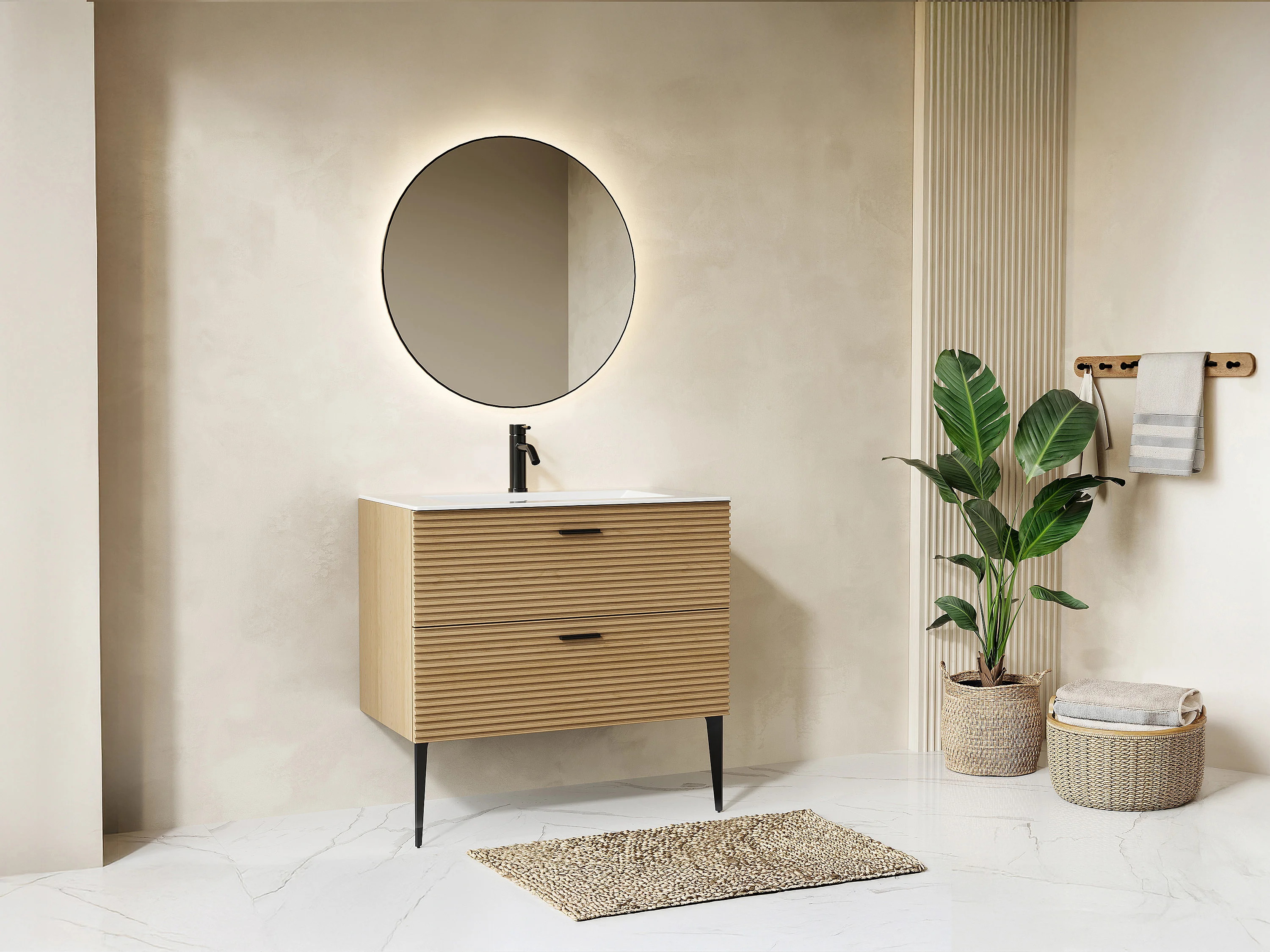Meuble de salle de bain strié sur pieds avec vasque à encastrer et robinet - 2 tiroirs - Naturel clair - 80 cm - SARONE