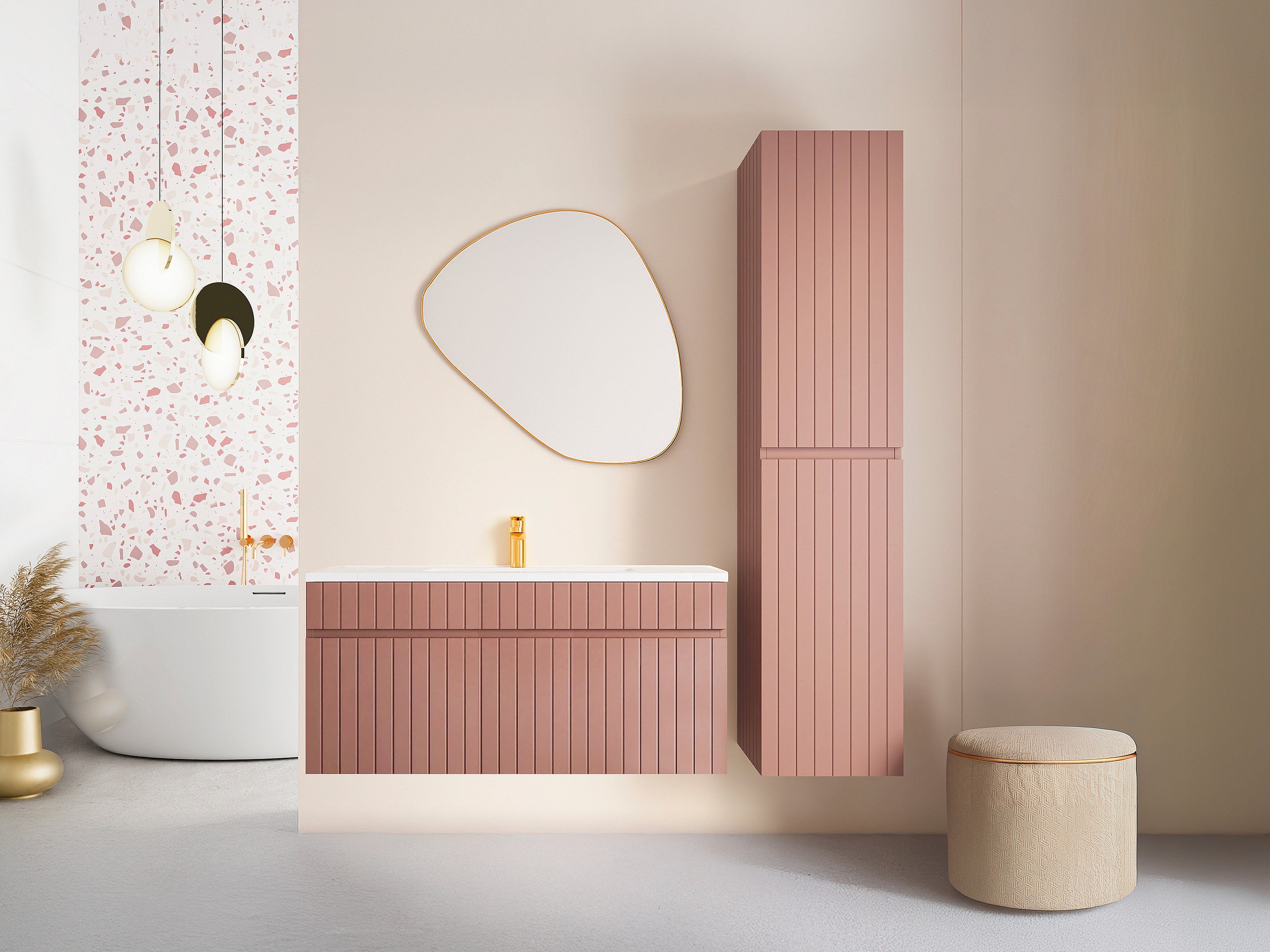 Meuble de salle de bain suspendu strié rose avec vasque à encastrer et colonne - 100 cm - SATARA