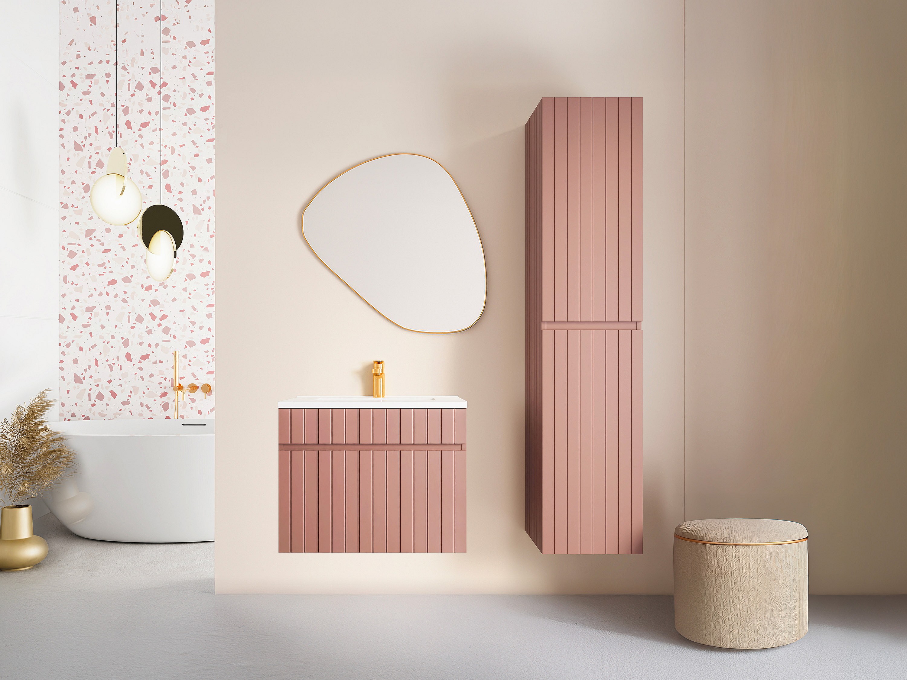 Meuble de salle de bain suspendu strié rose avec vasque à encastrer et colonne - 60 cm - SATARA