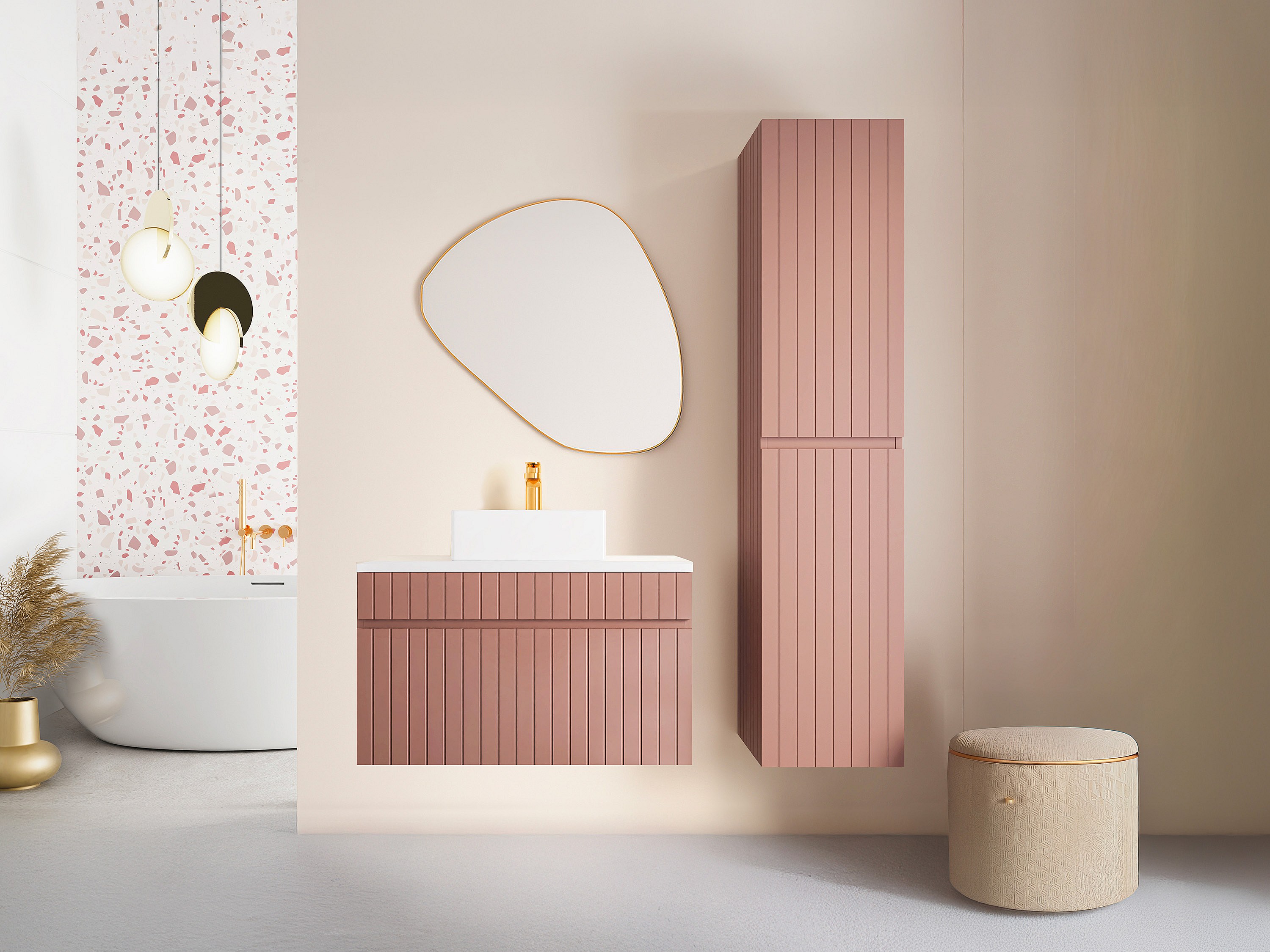 Meuble de salle de bain suspendu strié rose avec vasque à poser et colonne - 80 cm - SATARA