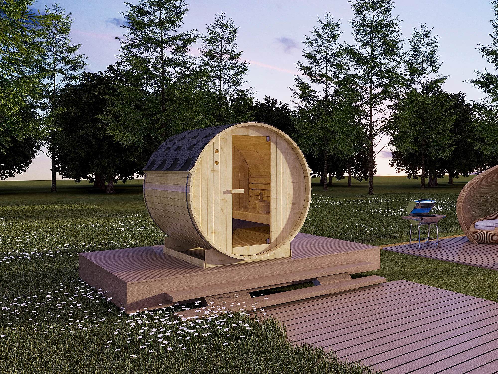 • Un sauna forme tonneau raffiné : Son design authentique sublime le jardin et invite à la détente