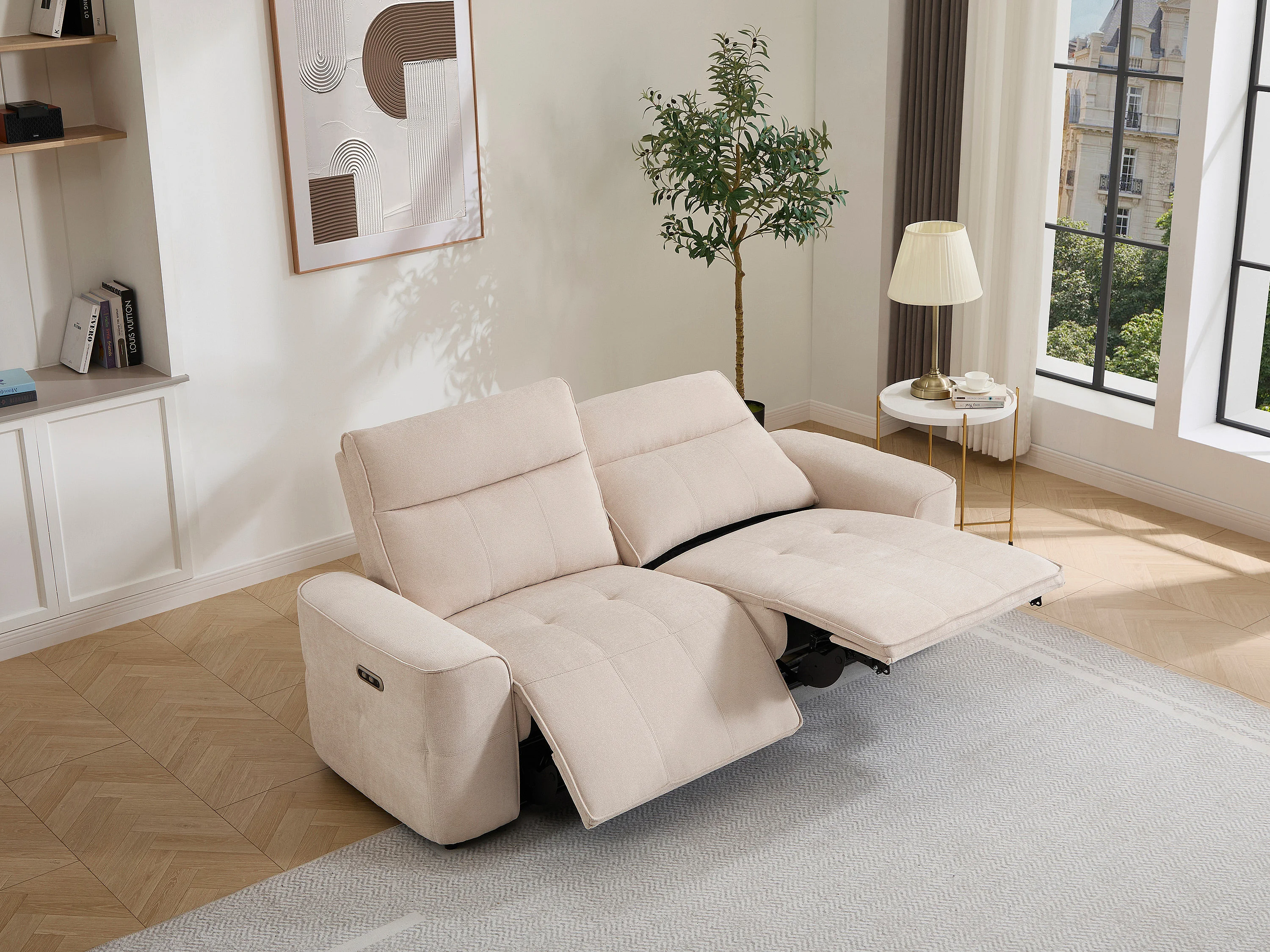 Canapé 3 places relax électrique en tissu chenille beige SCAMOCO