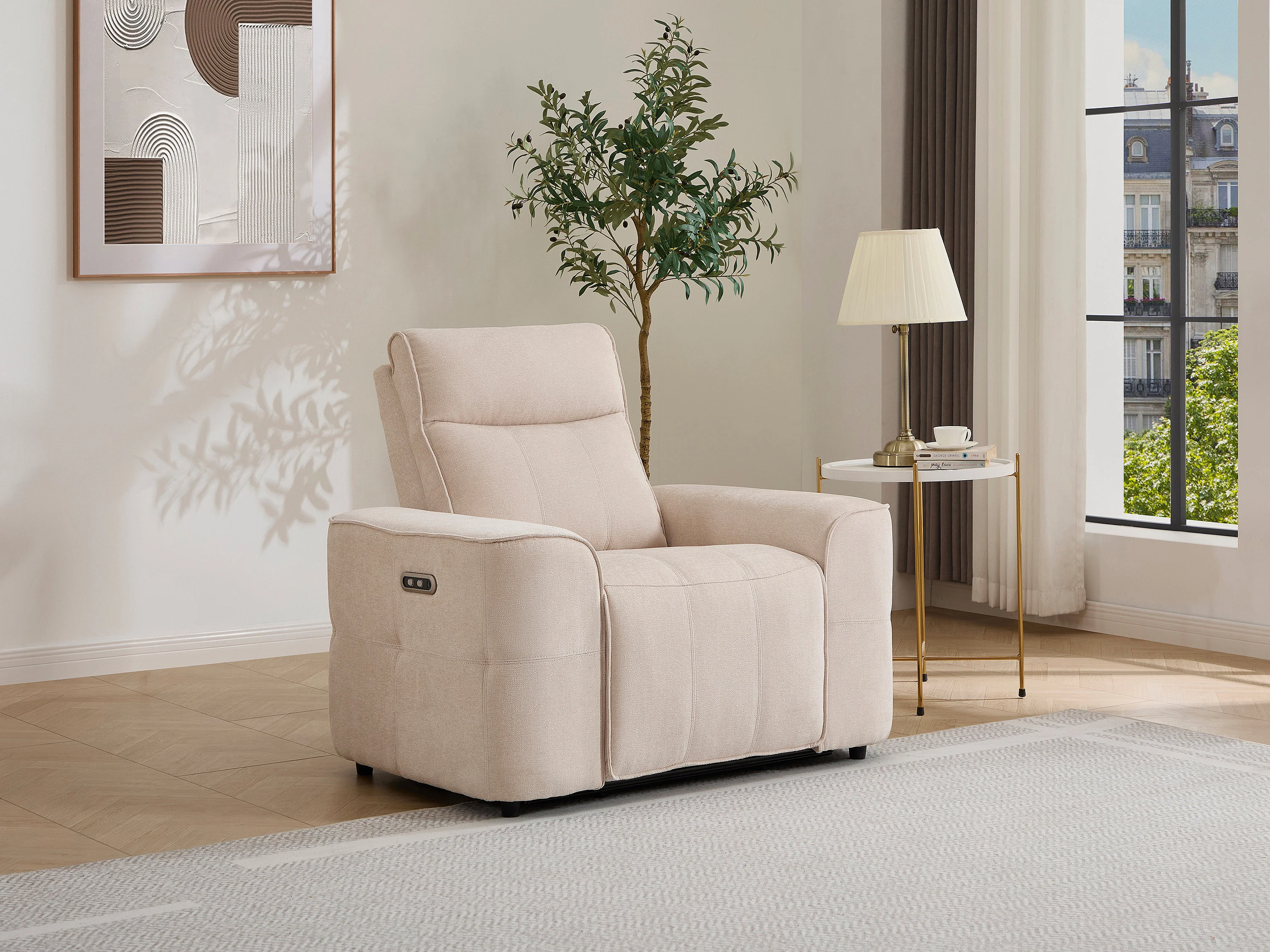 Fauteuil relax électrique en tissu chenille beige SCAMOCO