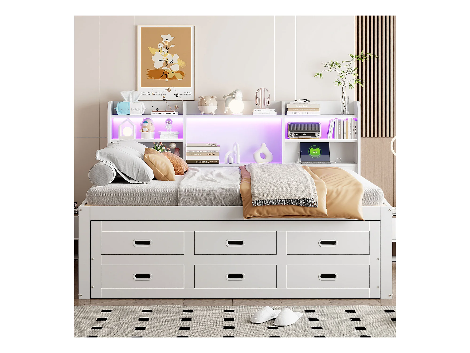 Schlafsofa, Daybett, mit LED-Fernbedienung, 3 Schubladen, Nachttischablage, Multifunktionales Ausziehbett, Weiß (210x260x115 cm)
