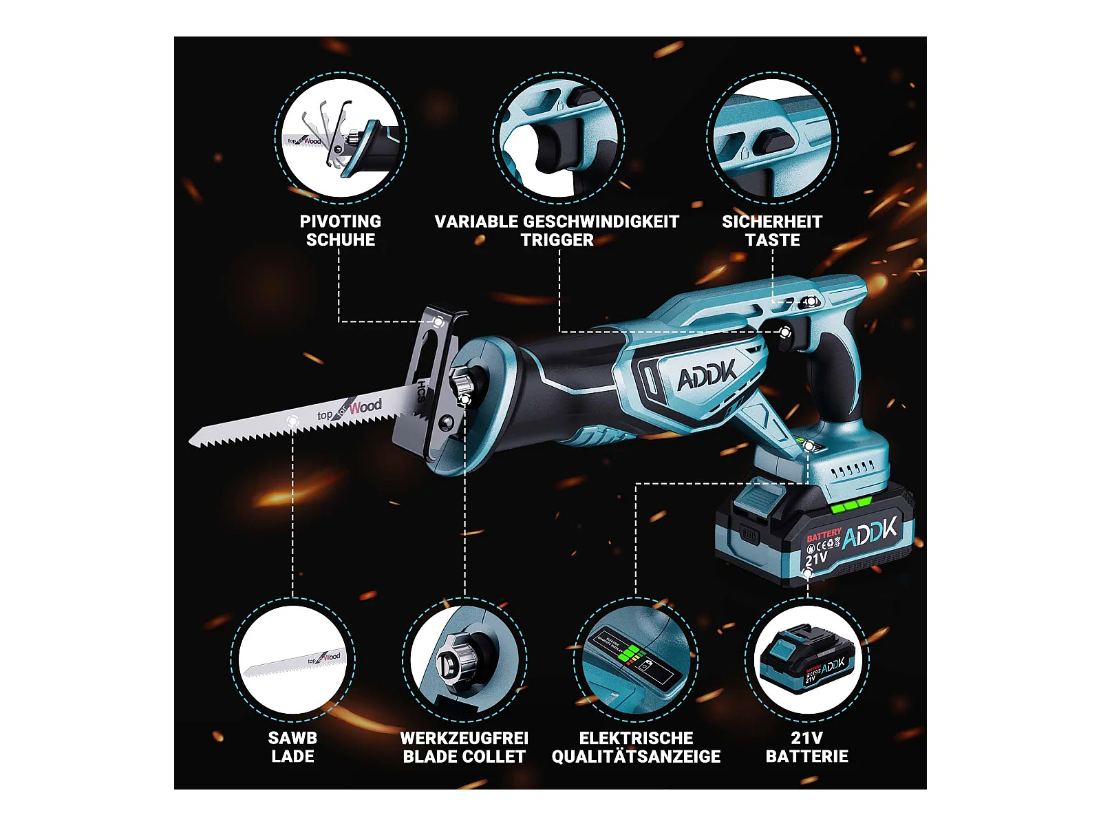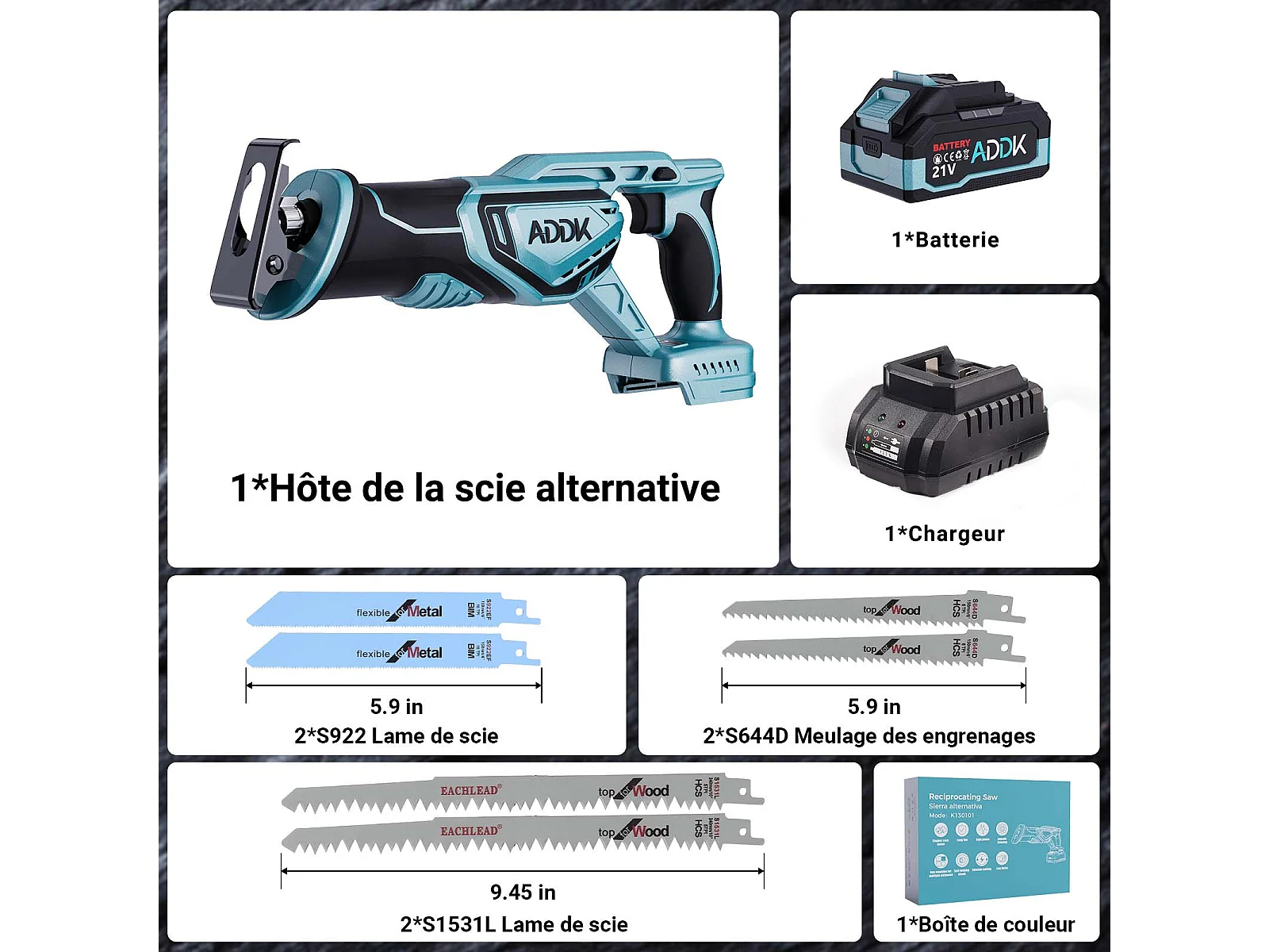 Scie alternative sans fil, sans balais, avec batterie 21 V 4,0 Ah, 0 à 3 300 tr-min, course alternative jusqu'à 28 mm