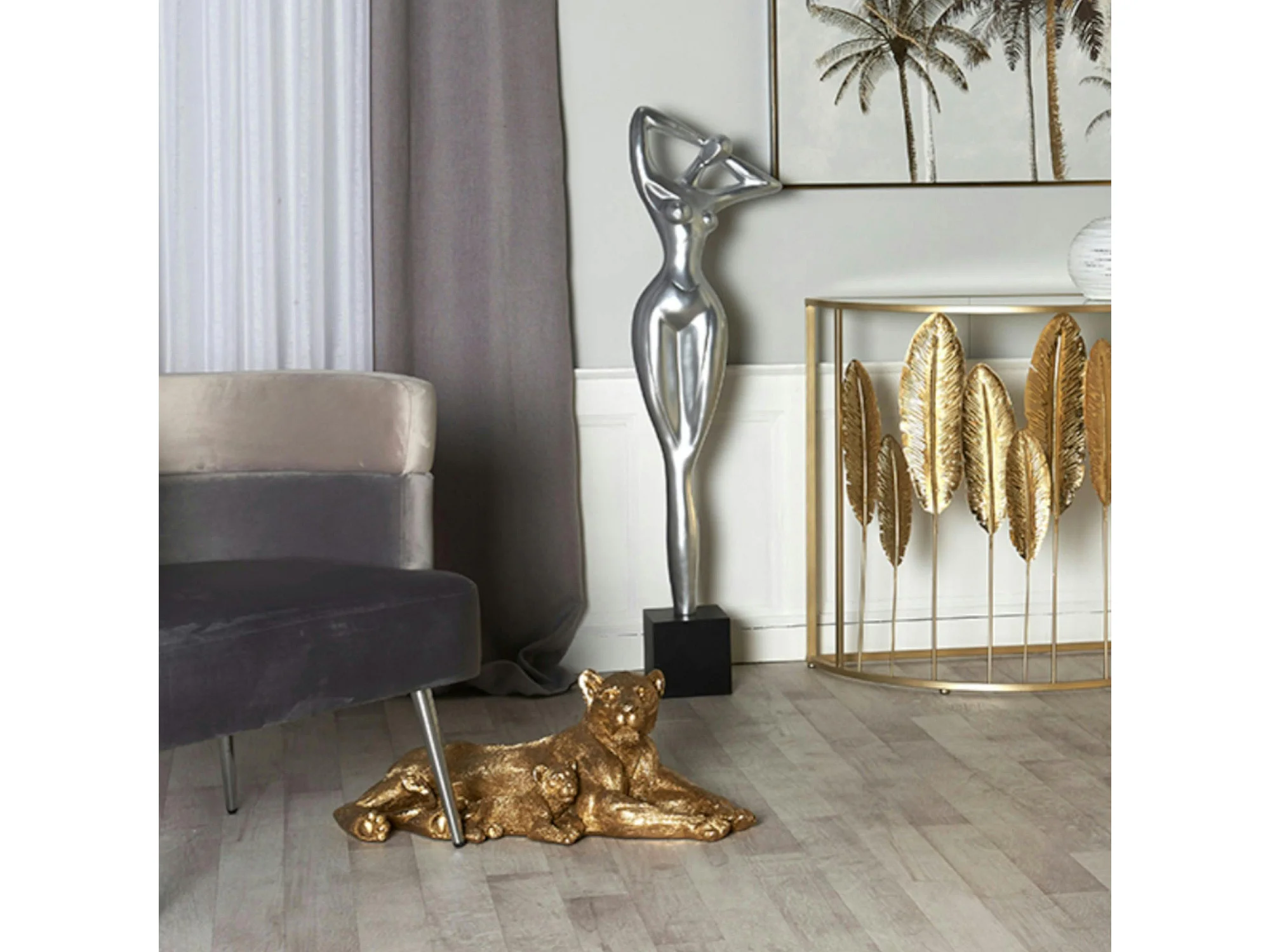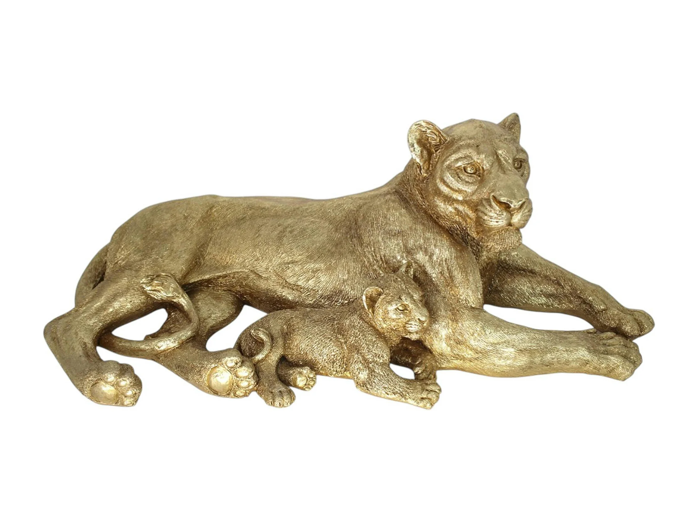 Sculpture moderne lionne et lionceau couleur dorée