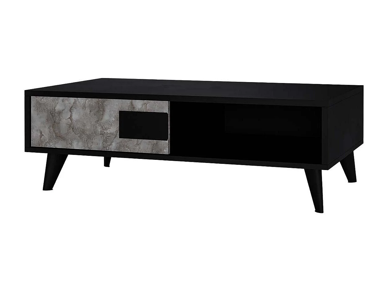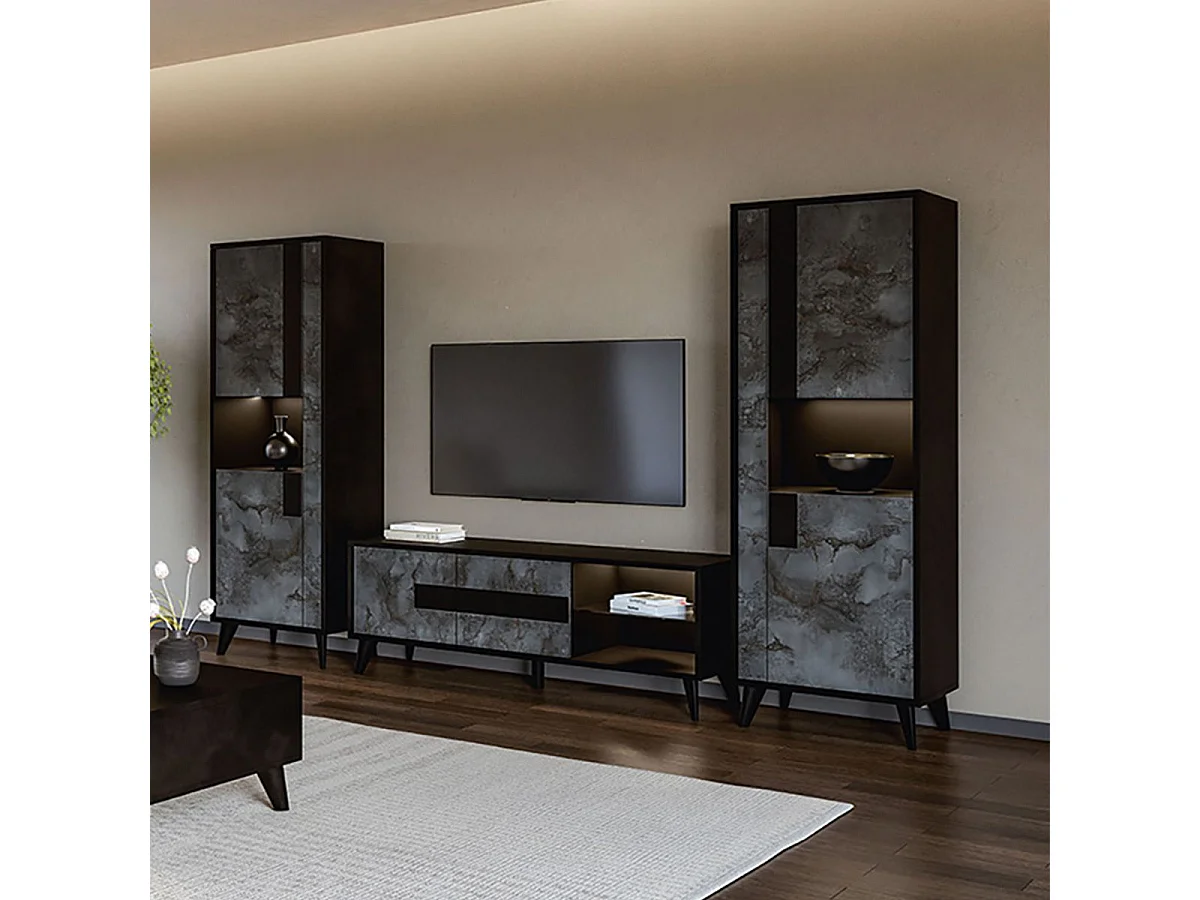 SEATTLE - Ensemble Salon Complet Noir et Effet Métal Oxydé Meuble TV et Colonnes avec Leds + Table Basse