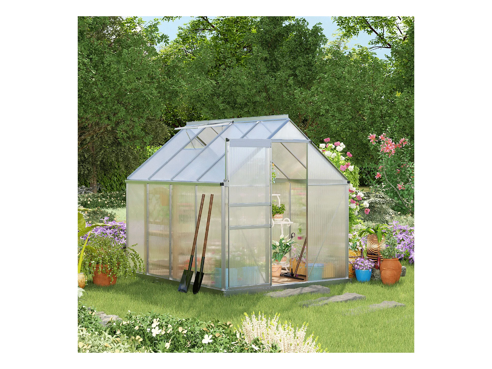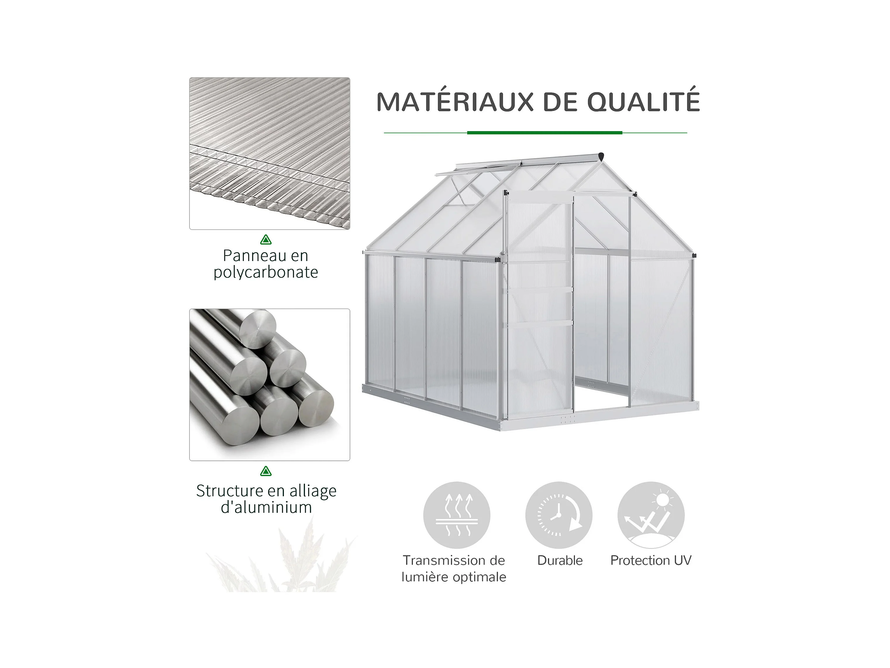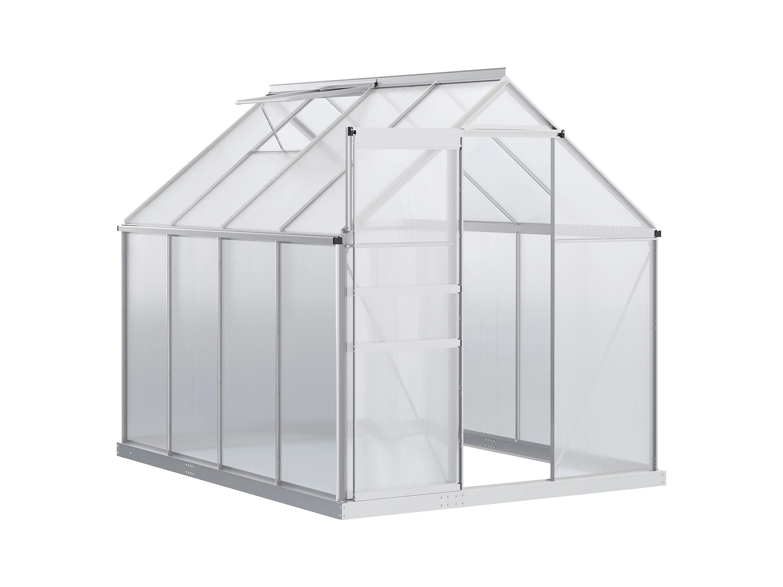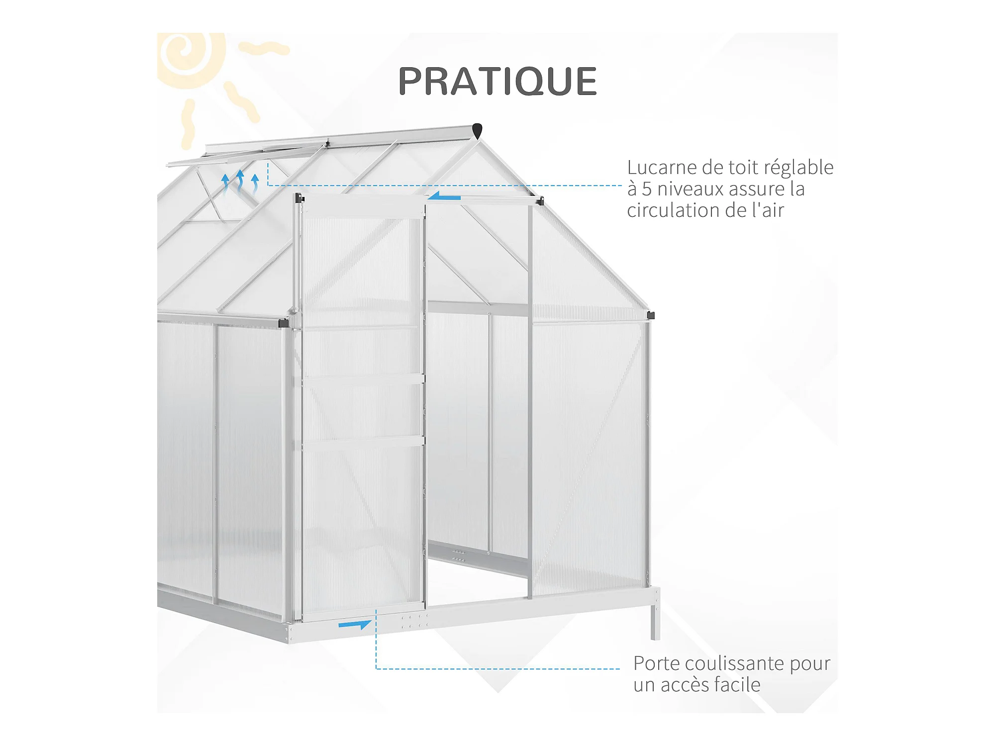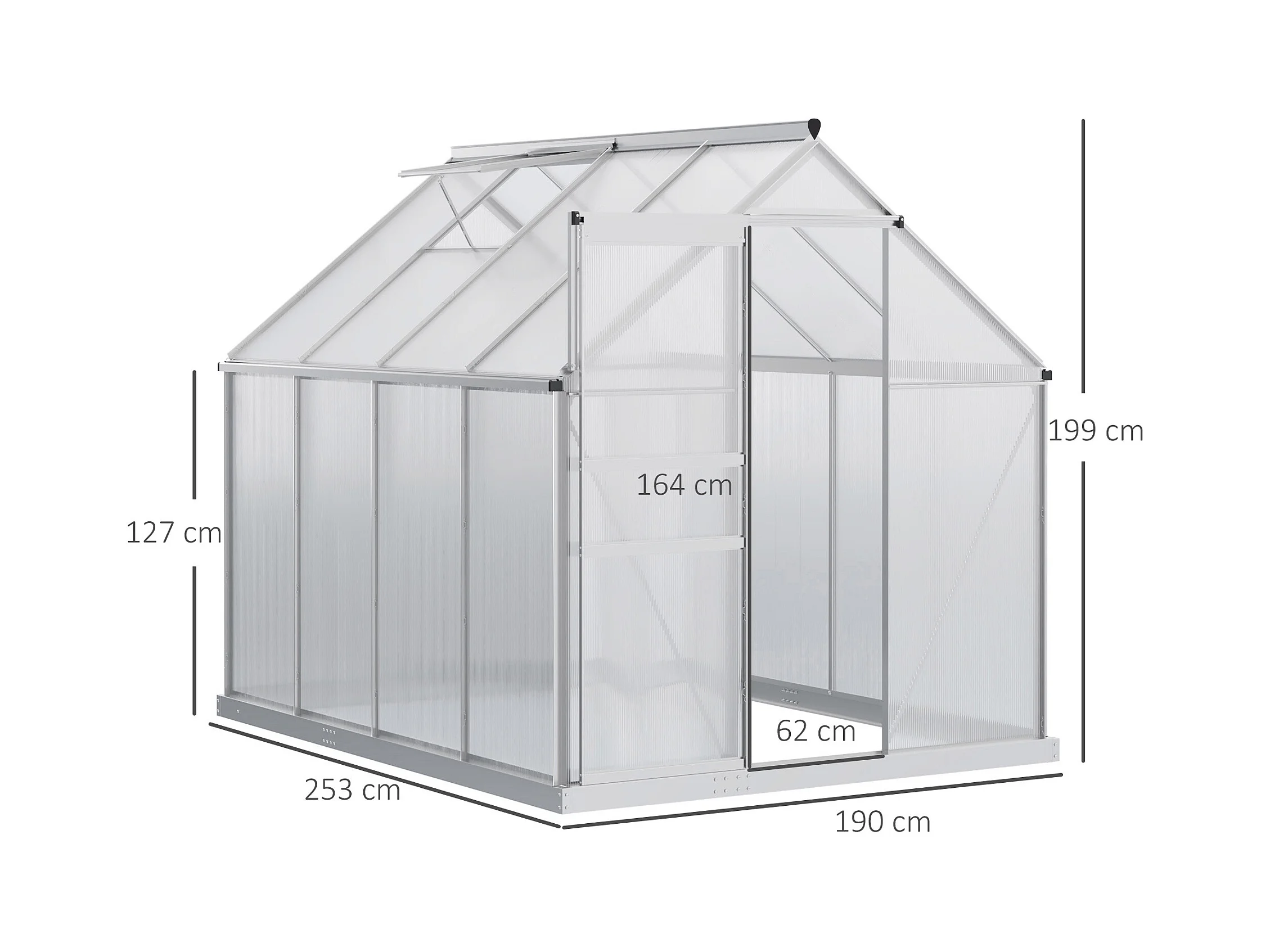 Serre de jardin aluminium polycarbonate 4,8 m² dim. 2,53L x 1,9l x 2H m lucarne réglable fondation porte coulissante