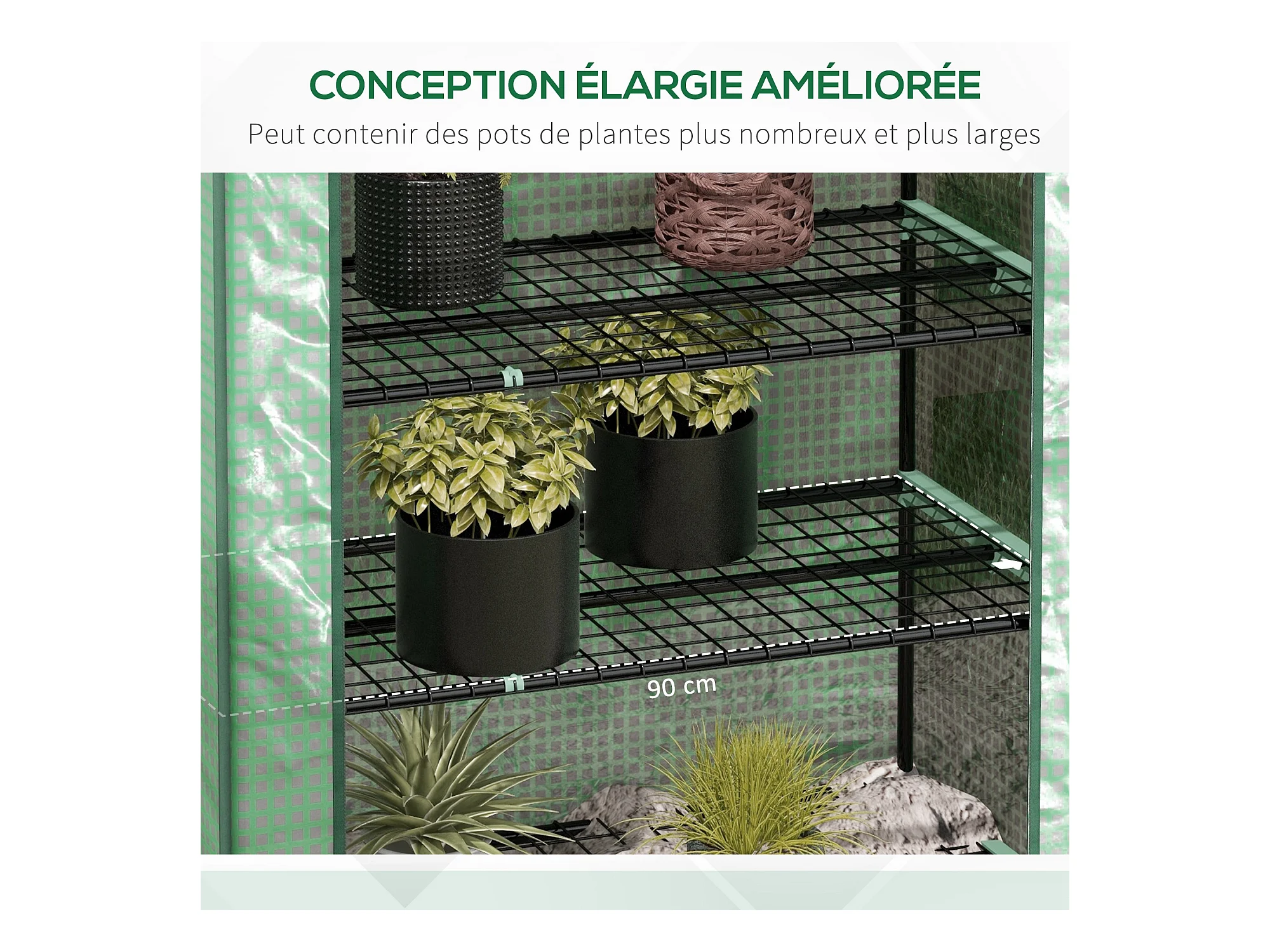 Mini serre de jardin 270L x 90l x 90H cm acier PE haute densité 140 g/m² anti-UV 3 fenêtres avec zip enroulables vert