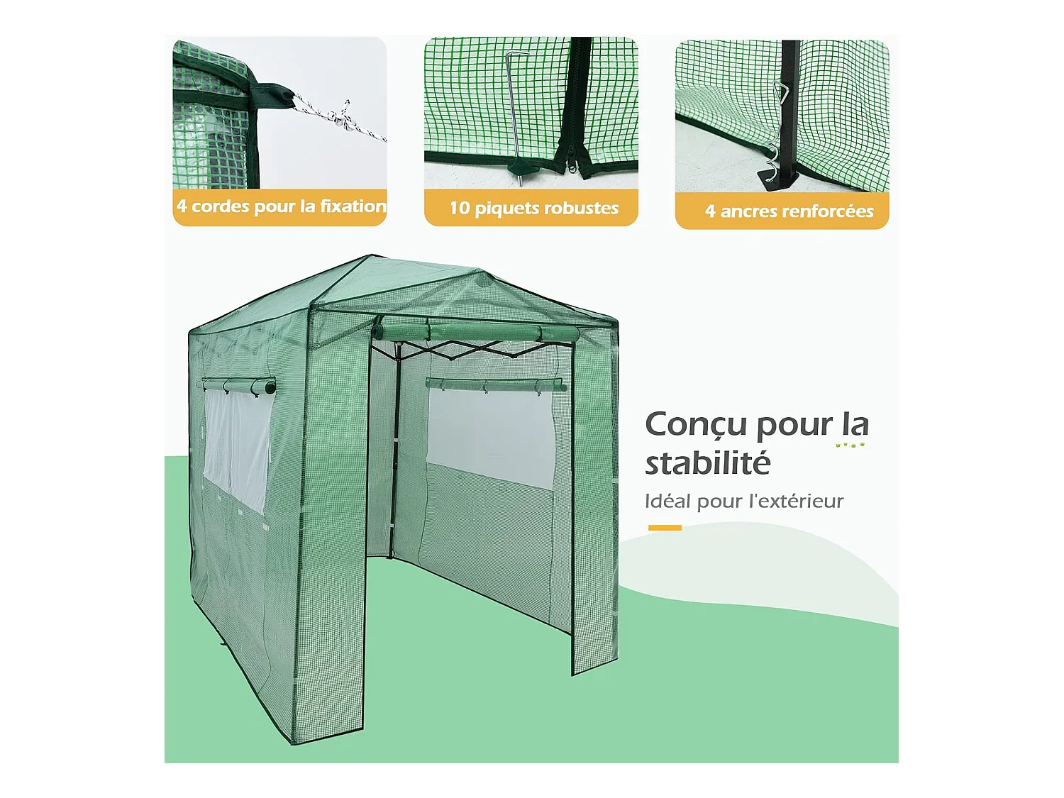 Mini serre de jardin 270L x 90l x 90H cm acier PE haute densité 140 g/m² anti-UV 3 fenêtres avec zip enroulables vert
