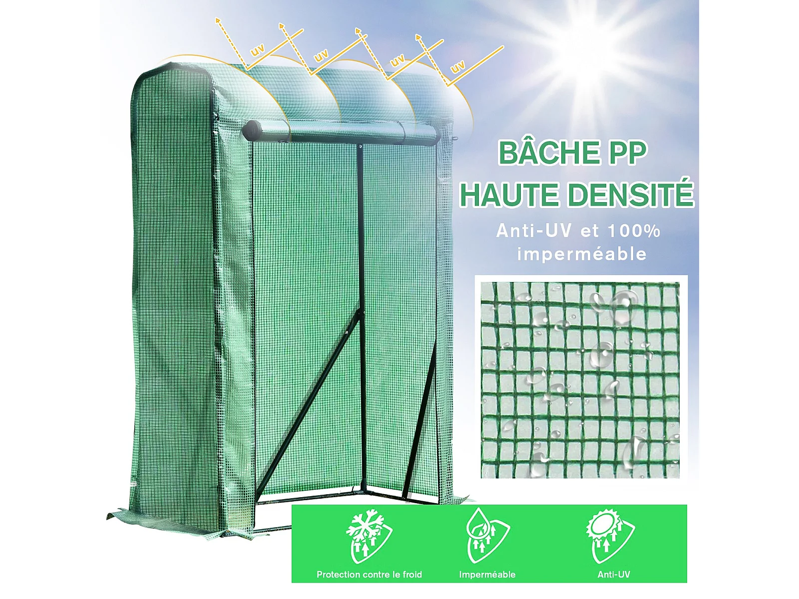 Serre de jardin serre à tomates anti-UV dim. 100L x 50l x 150H cm porte zipée déroulante acier PE vert